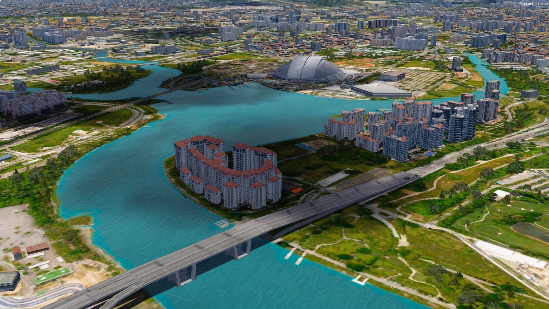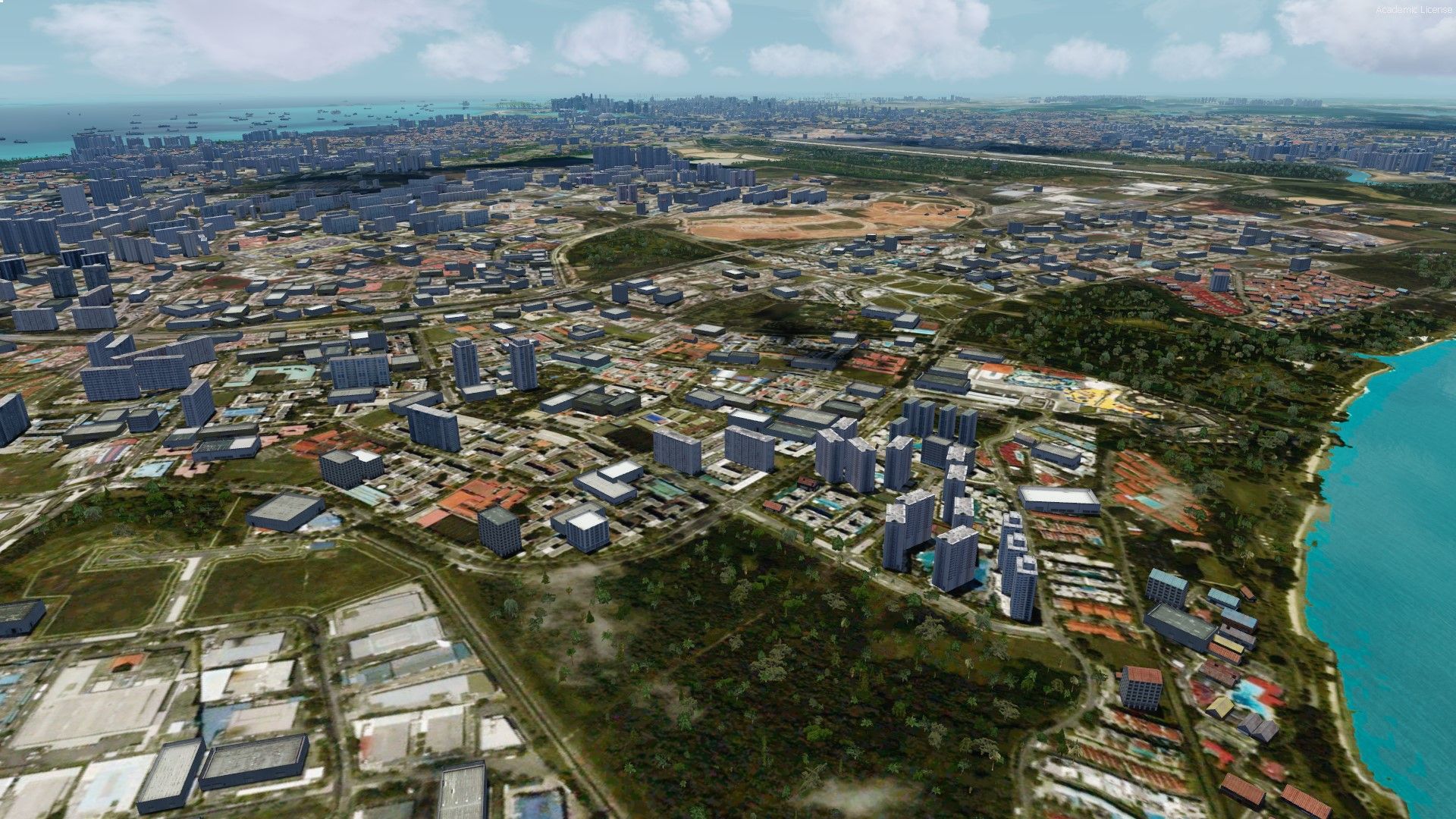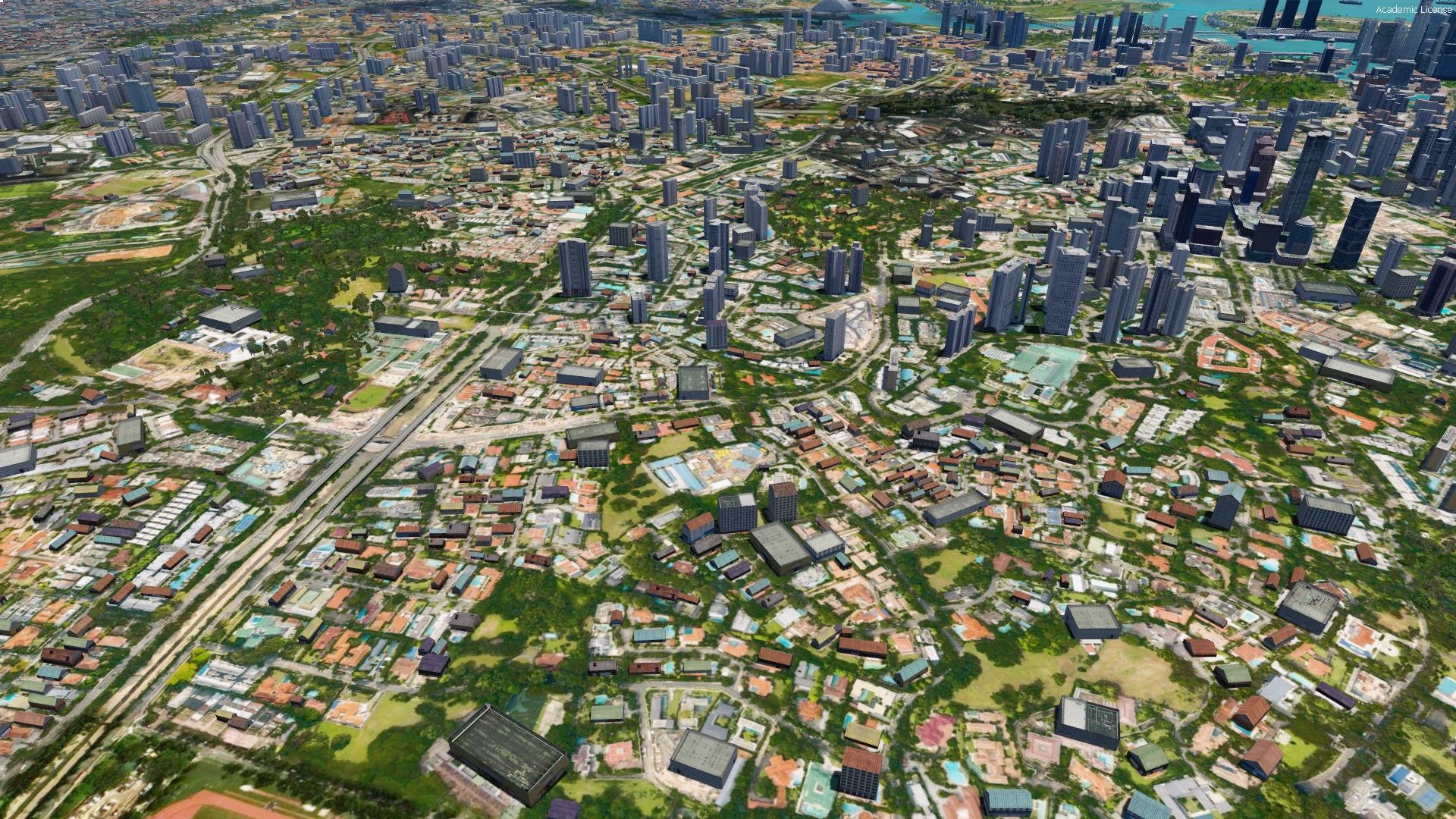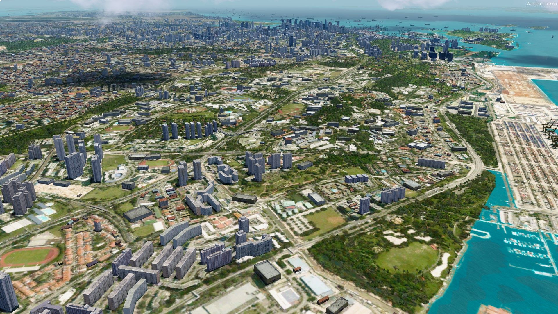 Ähnlich wie auch an der Küste nimmt auch die Qualität der Szenerie an Land in Richtung Westen ab. Zwar fehlen hier nicht so viele Objekte wie in den Häfen, man erkennt allerdings schon merklich, dass der Fokus der Entwickler näher am Flughafen liegt. Im Vorbeiflug, beispielsweise aus Europa kommend, von Norden aus den Flughafen Changi anfliegend, macht die Stadt (aus einer gewissen Höhe) aber einen recht netten Eindruck. Im Vergleich zu Orbx Global ist das schon eine deutliche Aufwertung und ein ganz anderes „Feeling“.