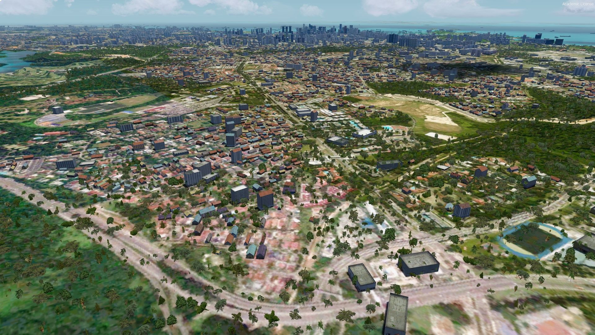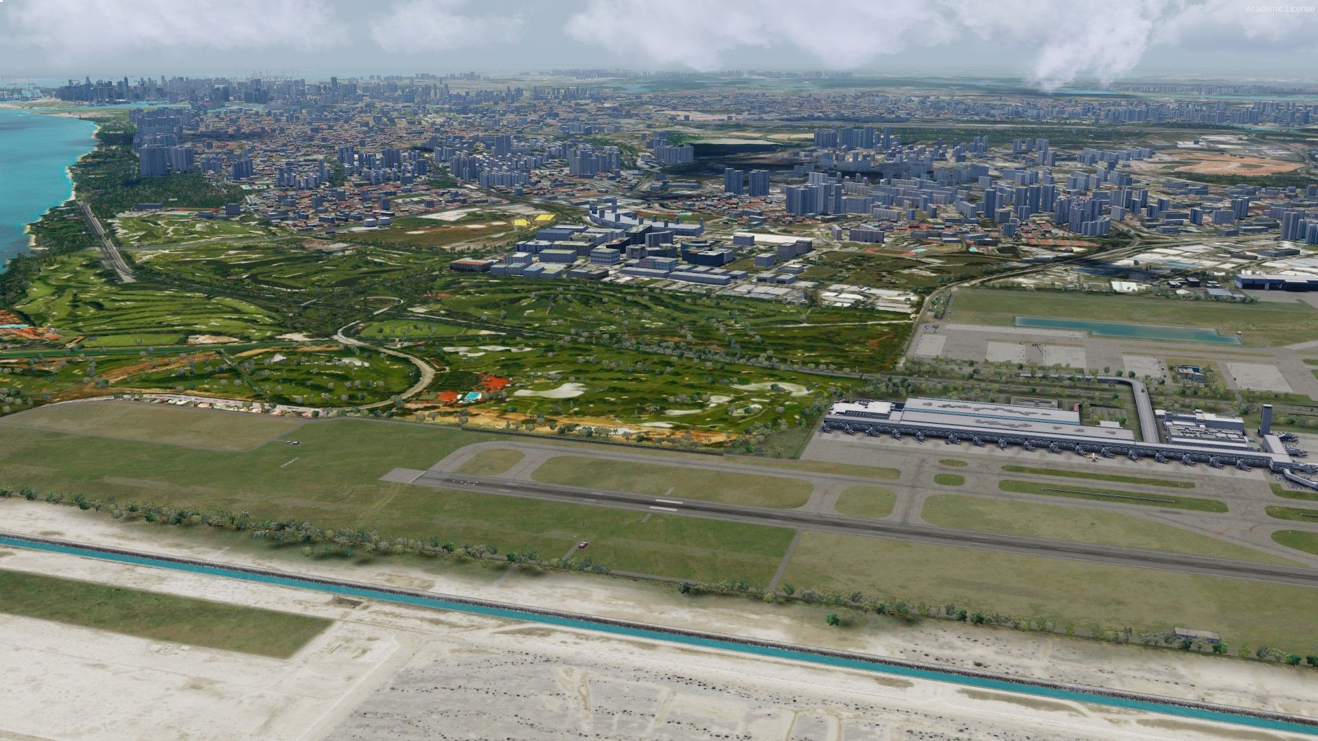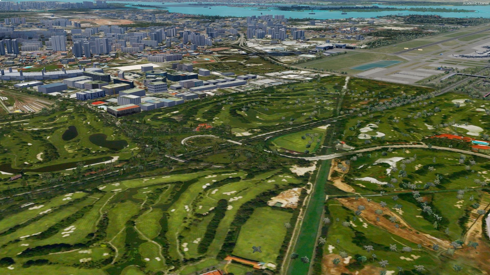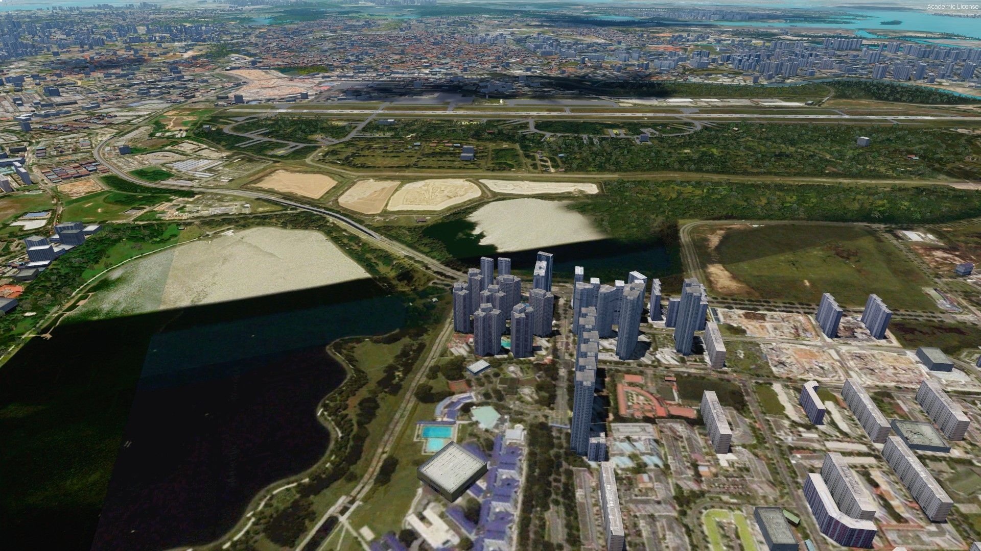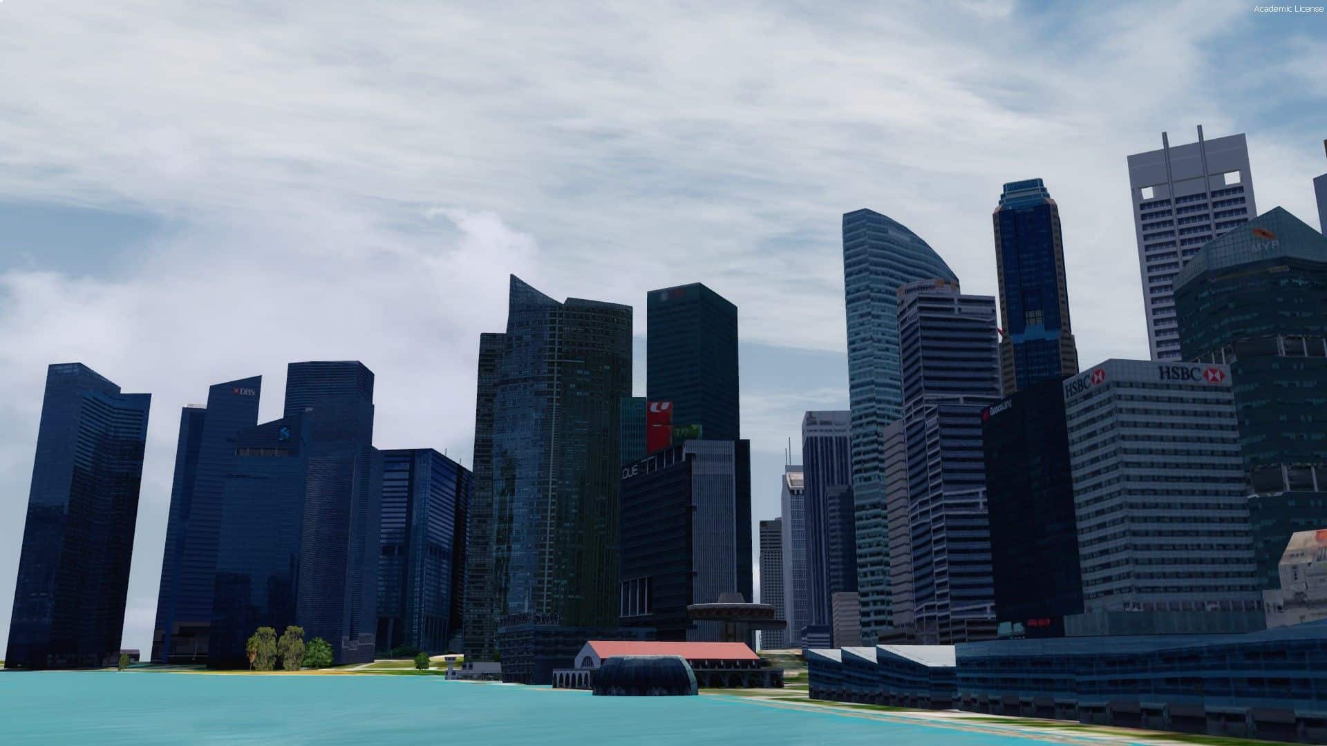Ähnlich wie auch an der Küste nimmt auch die Qualität der Szenerie an Land in Richtung Westen ab. Zwar fehlen hier nicht so viele Objekte wie in den Häfen, man erkennt allerdings schon merklich, dass der Fokus der Entwickler näher am Flughafen liegt. Im Vorbeiflug, beispielsweise aus Europa kommend, von Norden aus den Flughafen Changi anfliegend, macht die Stadt (aus einer gewissen Höhe) aber einen recht netten Eindruck. Im Vergleich zu Orbx Global ist das schon eine deutliche Aufwertung und ein ganz anderes „Feeling“.