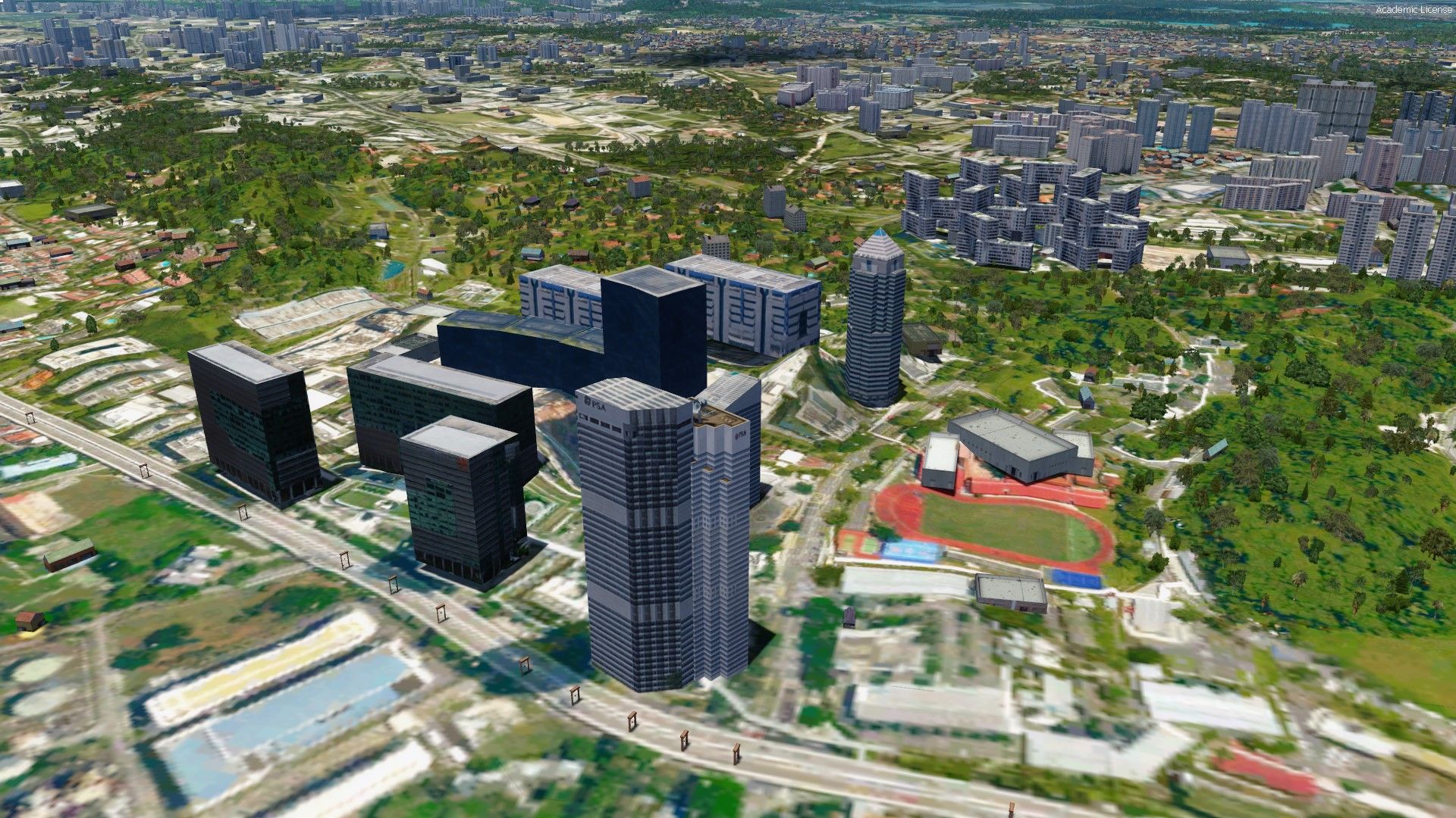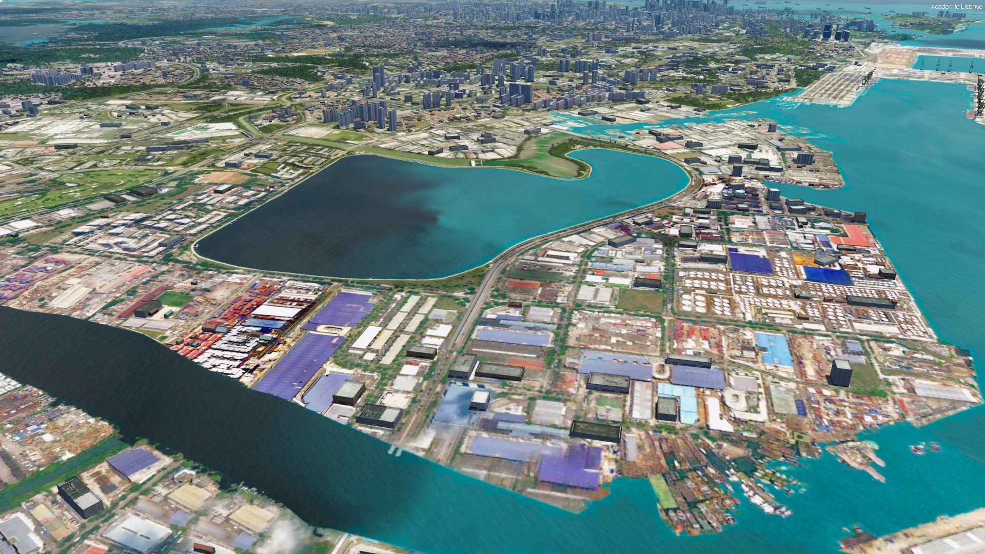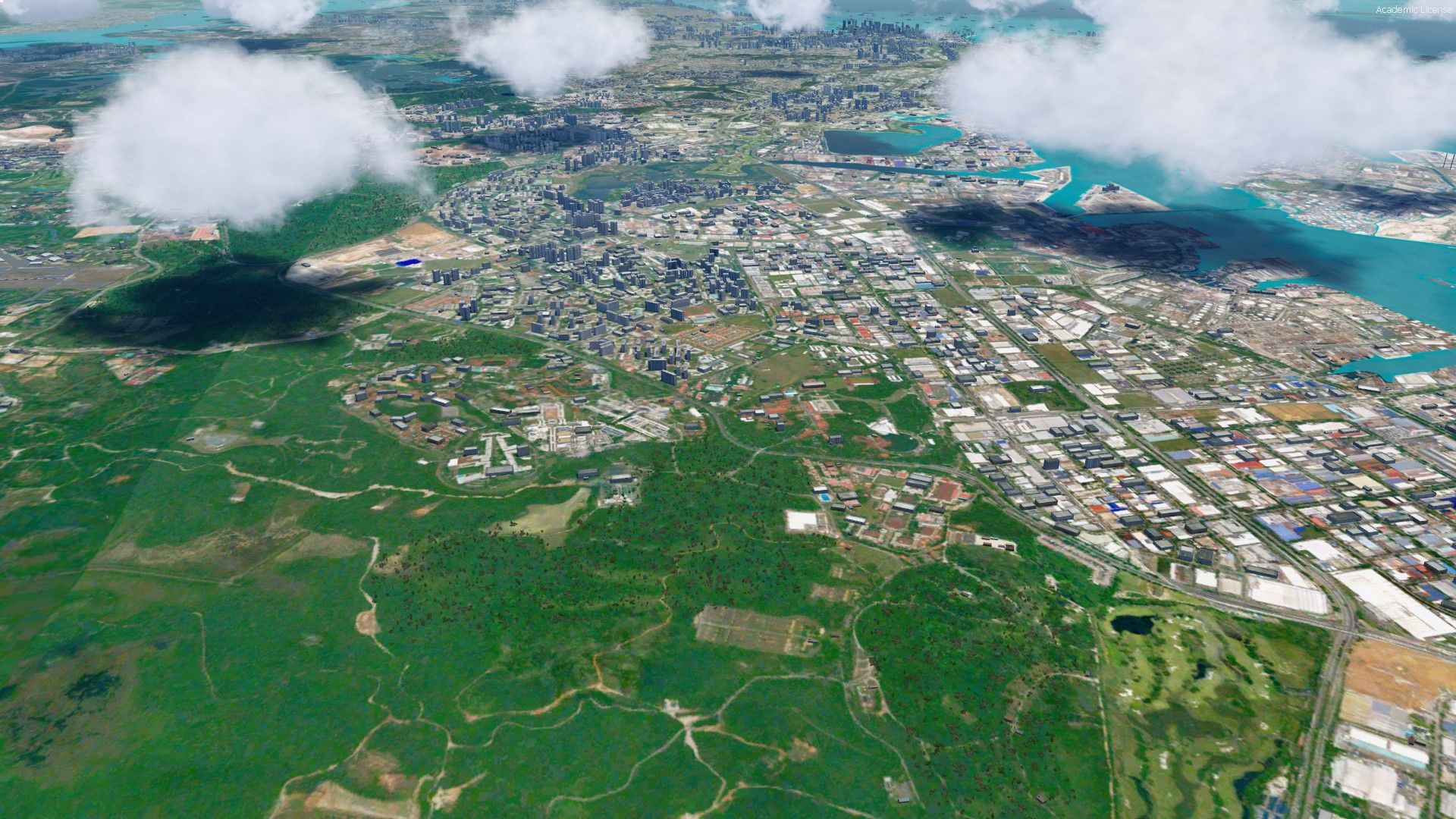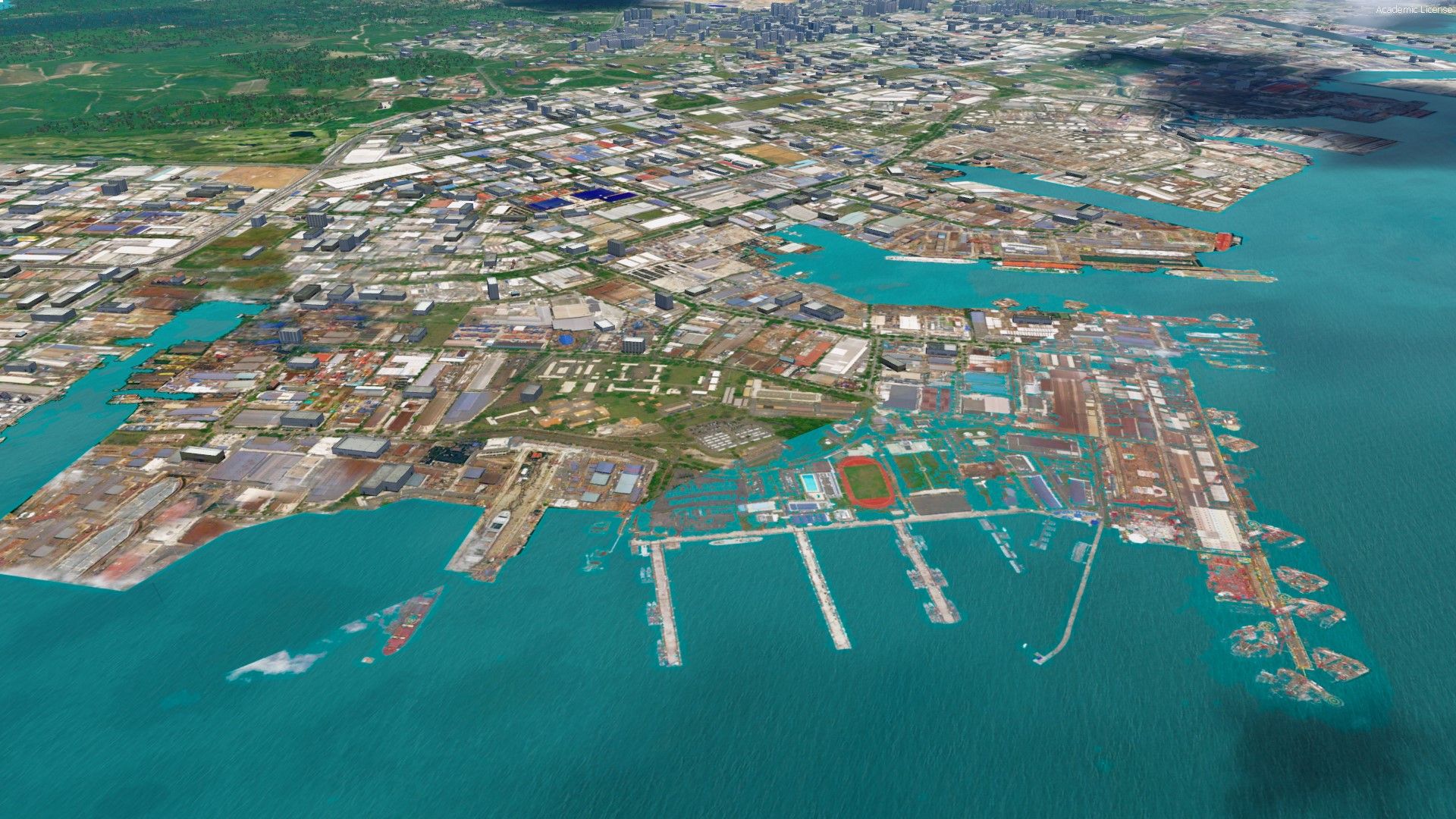 Ähnlich wie auch an der Küste nimmt auch die Qualität der Szenerie an Land in Richtung Westen ab. Zwar fehlen hier nicht so viele Objekte wie in den Häfen, man erkennt allerdings schon merklich, dass der Fokus der Entwickler näher am Flughafen liegt. Im Vorbeiflug, beispielsweise aus Europa kommend, von Norden aus den Flughafen Changi anfliegend, macht die Stadt (aus einer gewissen Höhe) aber einen recht netten Eindruck. Im Vergleich zu Orbx Global ist das schon eine deutliche Aufwertung und ein ganz anderes „Feeling“.