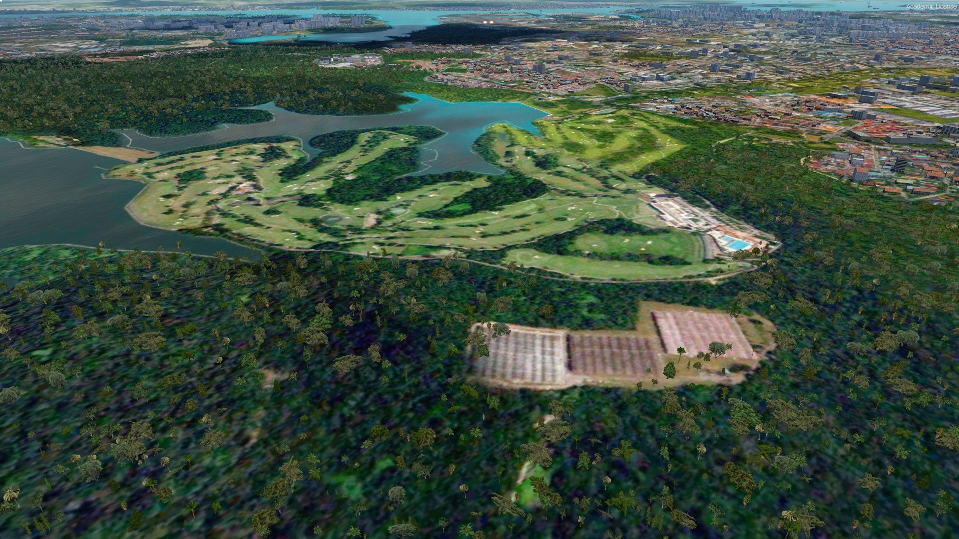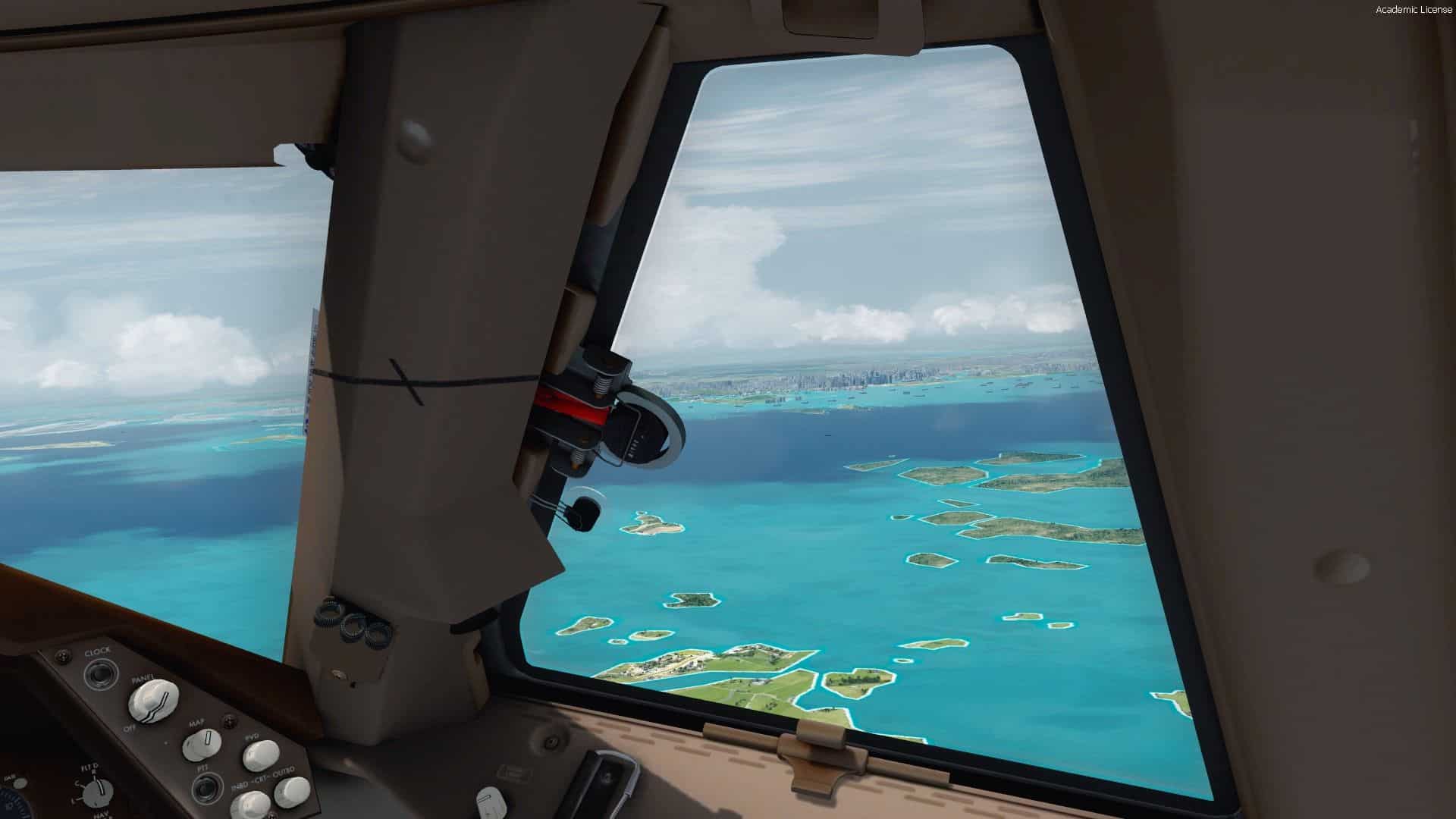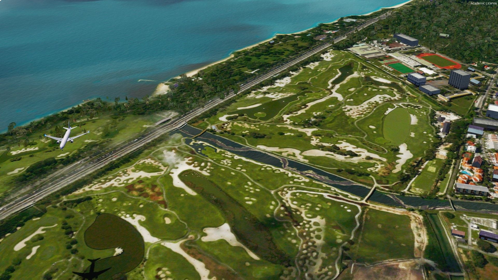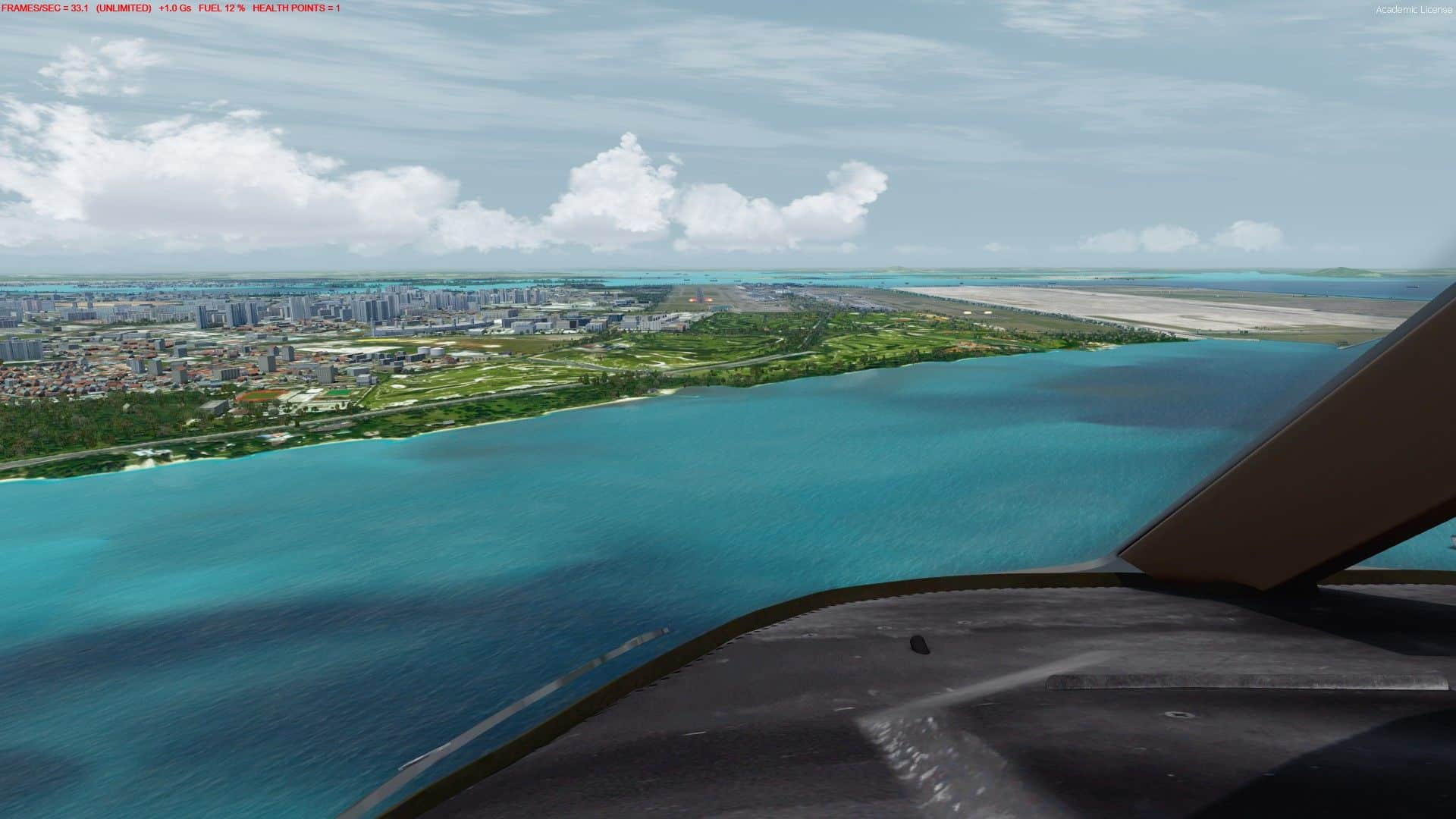 Bei der Landung fällt auch bereits auf, dass die Entwickler von Samscene die mangelhafte Anpassung der Szenerie von ImagineSim, zumindest partiell, ausgeglichen haben. Der Flughafen passt sich viel natürlicher in das Umfeld ein und es wurden deutlich mehr Objekte im Anflugbereich platziert. Leider fehlen noch immer Details des Golfplatzes und viele, viele Bäume. Beides ist lediglich auf der zugrundeliegenden Fototextur zu sehen. Man muss jedoch anmerken: viel mehr Objekte wären vermutlich auch kontraproduktiv, denn die Performance mit der PMDG 747 im Anflug liegt auf meinem System bereits bei ca. 22 – 25 fps. Das liegt zwar nur knapp unter der Leistung, die ich mit der ImaginSim Szenerie ohne Samscene erreiche (etwa 5 – 10% mehr), trotzdem sollten die Frames dann nicht noch tiefer fallen.