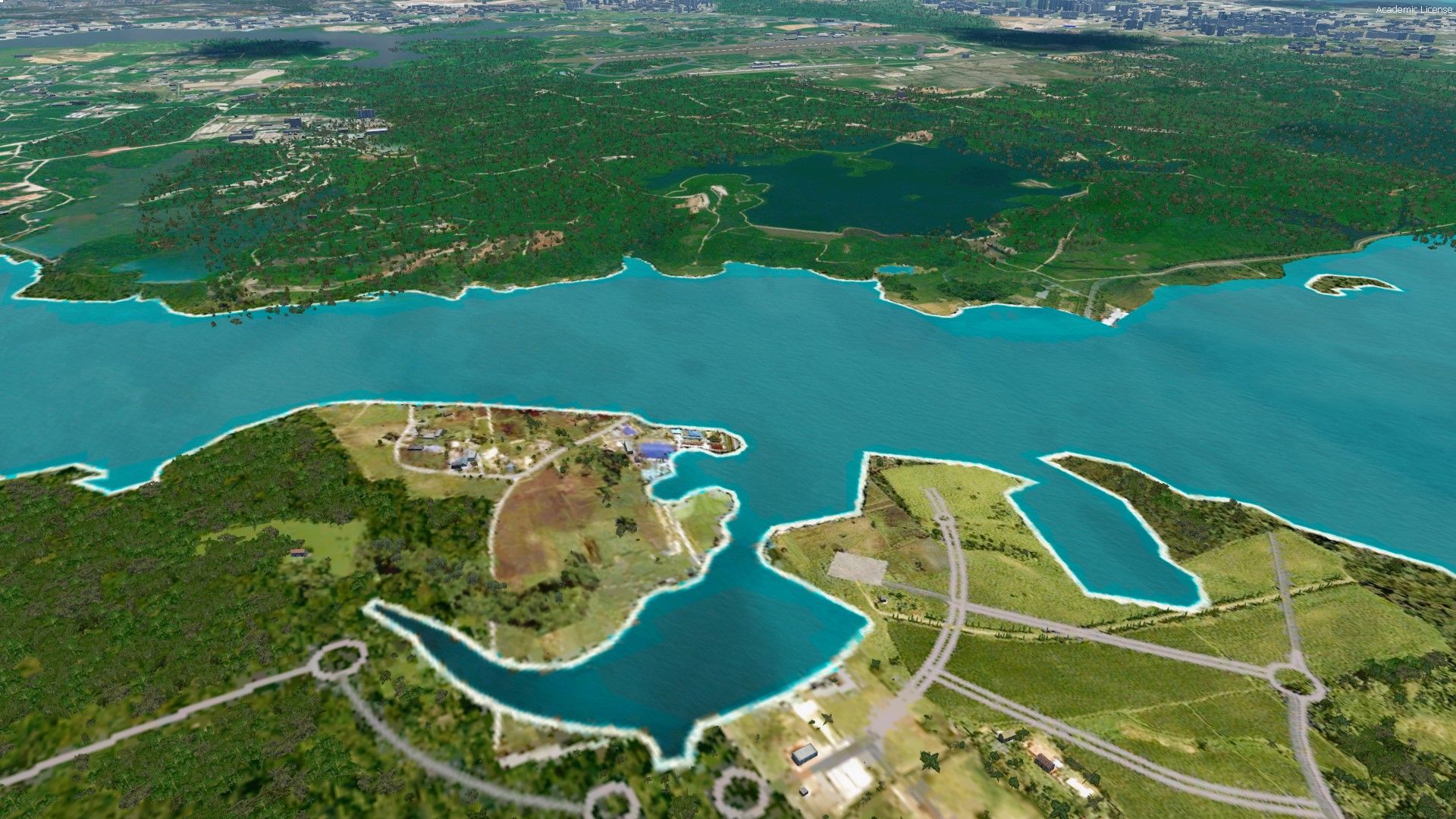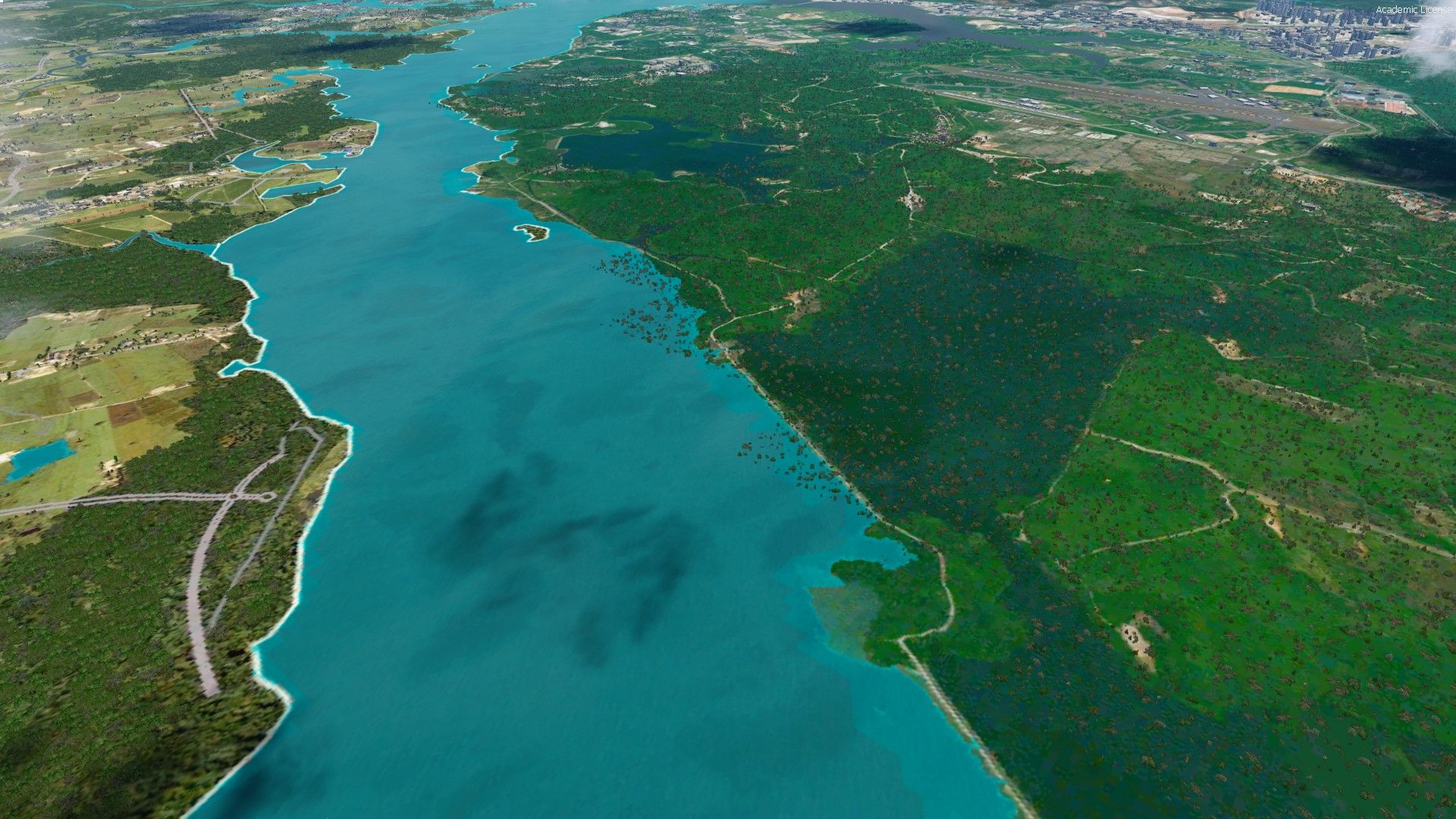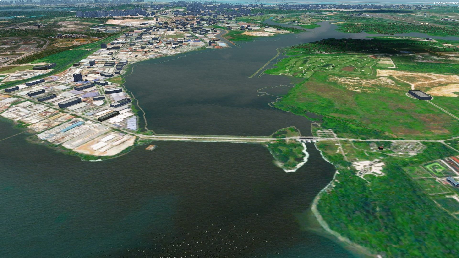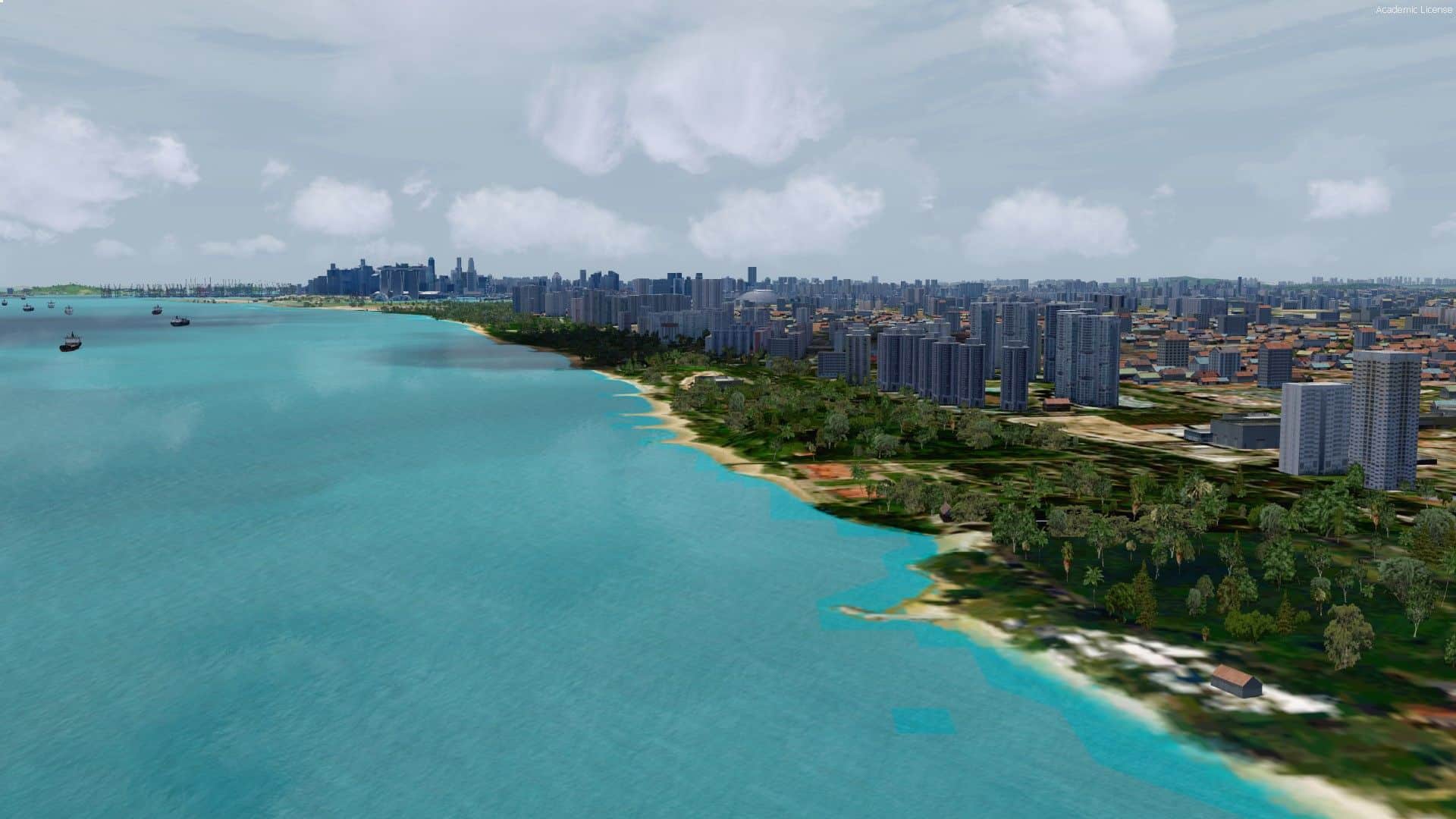 Bewundernswerterweise haben die Entwickler von Samscene tatsächlich den gesamten Staat Singapur umgesetzt. Im Norden Osten und Westen grenzt der an Malaysia. Die beiden Länder teilt die Johor Straße. Ganz Singapur ist eigentlich eine große Insel. Am westlichen Ende des Landes gibt es viel Grün und wenig Bebauung. Die Bäume im Wasser auf den folgenden Screenshots sind bedingt durch zu langsames Nachladen (bzw. zu schnelles Fotografieren von mir) und sind in der Szenerie von Samscene anständig platziert. Der Vorteil der Insellage ist ganz klar, dass keine Übergänge gestaltet werden müssen. Hier gibt es keinerlei Probleme.