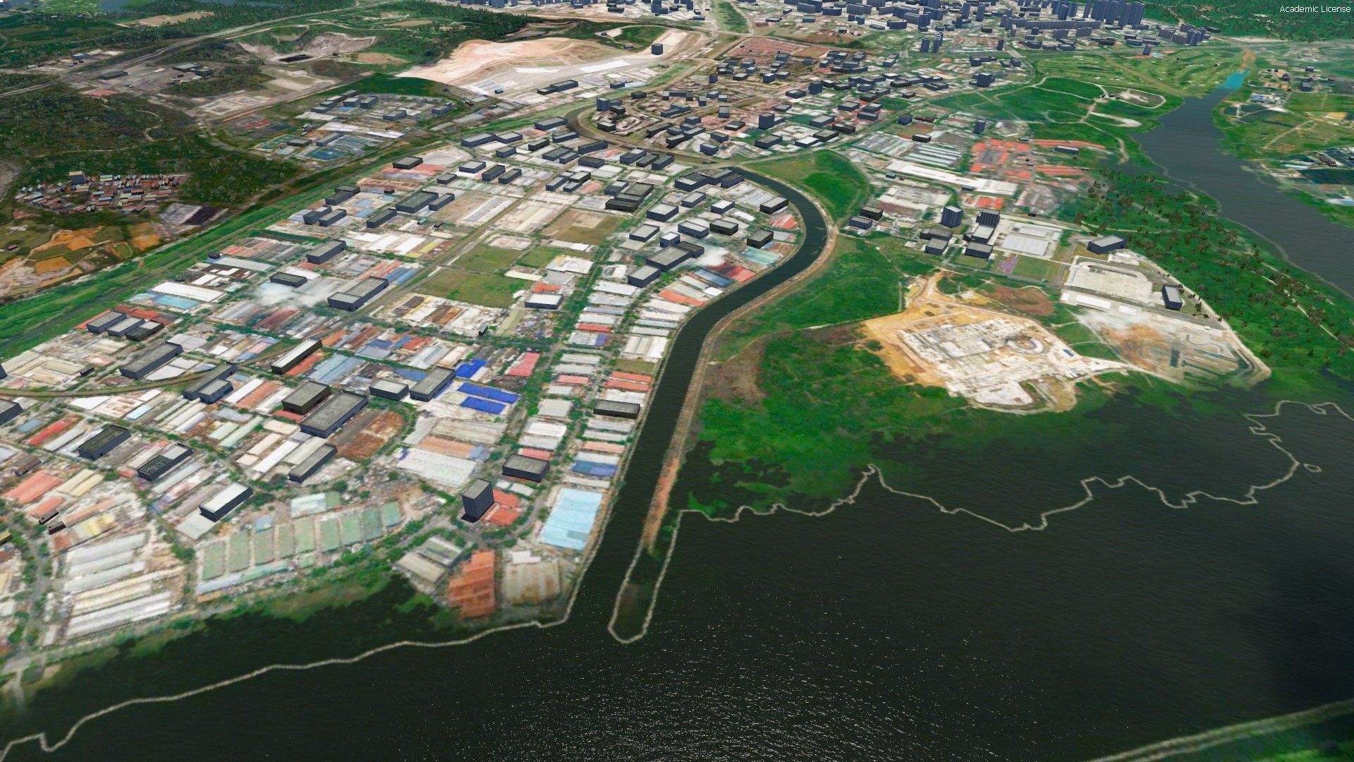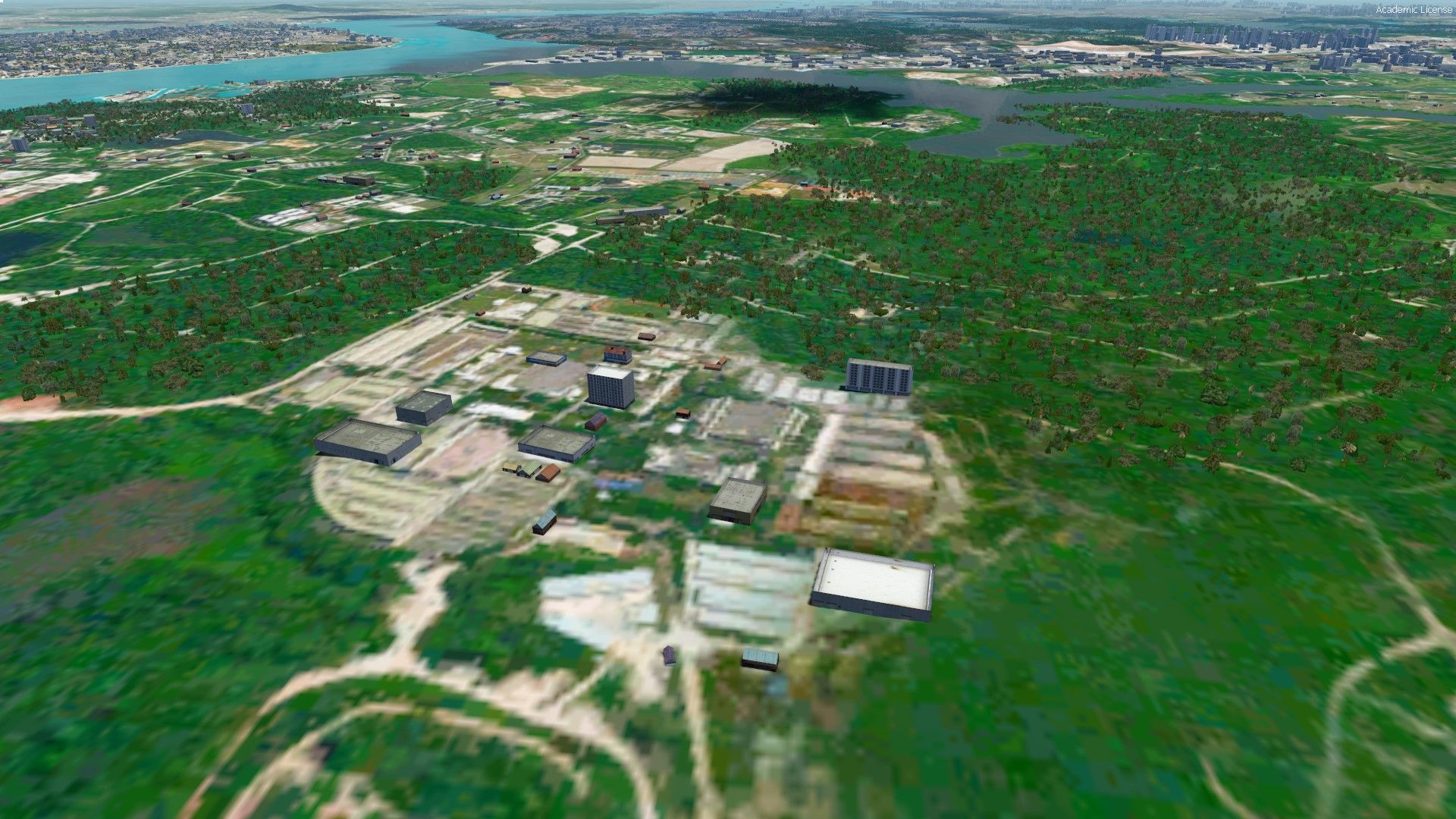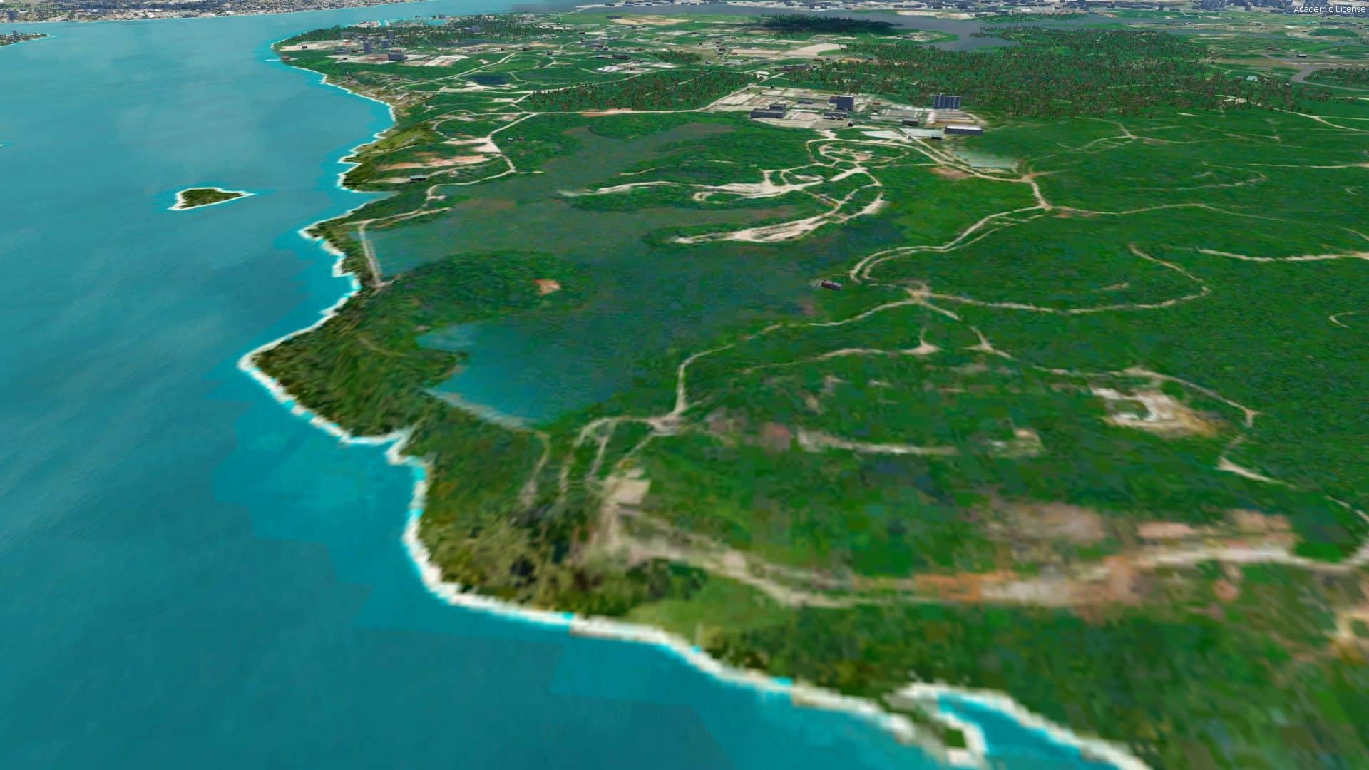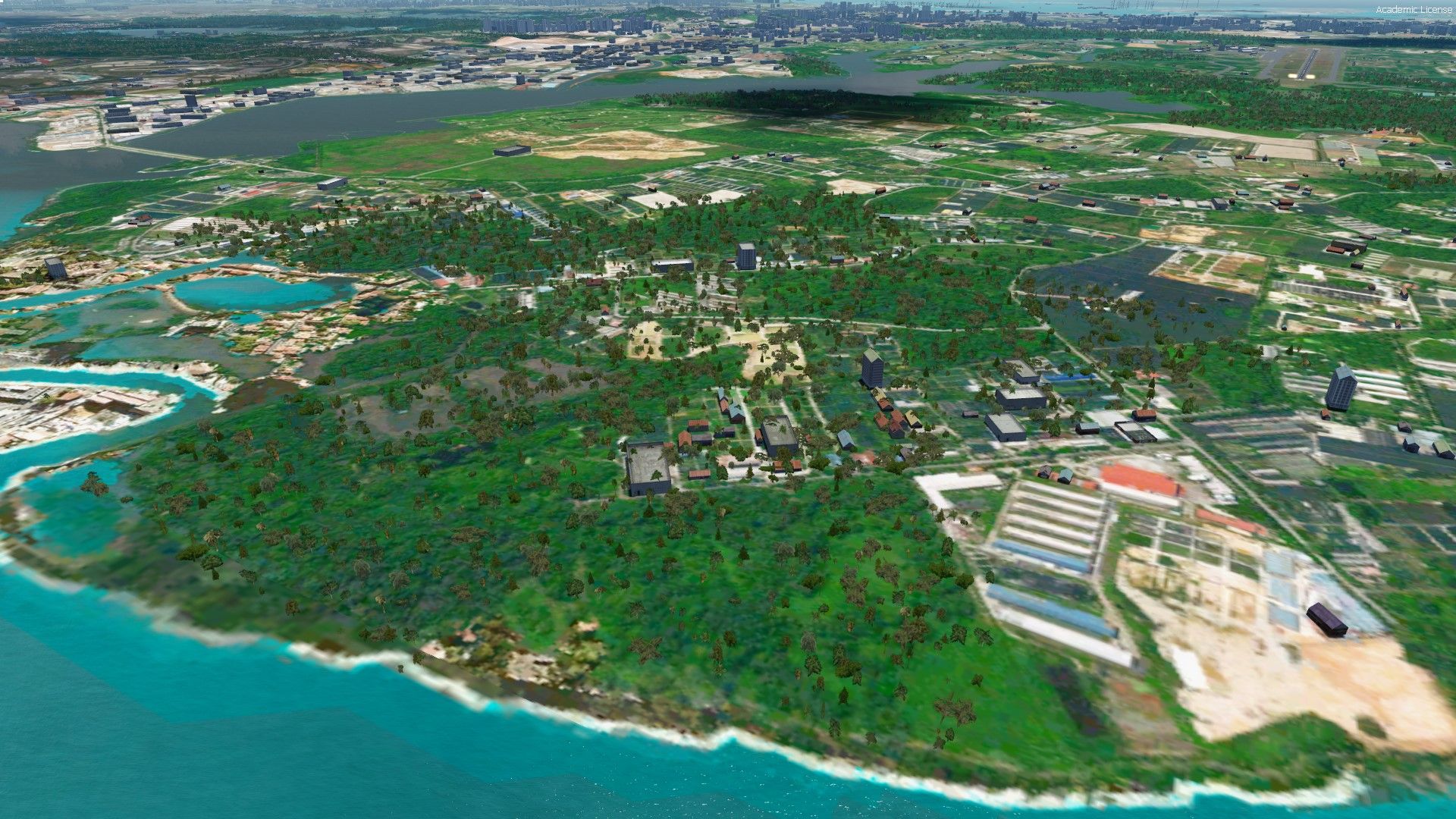 Bewundernswerterweise haben die Entwickler von Samscene tatsächlich den gesamten Staat Singapur umgesetzt. Im Norden Osten und Westen grenzt der an Malaysia. Die beiden Länder teilt die Johor Straße. Ganz Singapur ist eigentlich eine große Insel. Am westlichen Ende des Landes gibt es viel Grün und wenig Bebauung. Die Bäume im Wasser auf den folgenden Screenshots sind bedingt durch zu langsames Nachladen (bzw. zu schnelles Fotografieren von mir) und sind in der Szenerie von Samscene anständig platziert. Der Vorteil der Insellage ist ganz klar, dass keine Übergänge gestaltet werden müssen. Hier gibt es keinerlei Probleme.