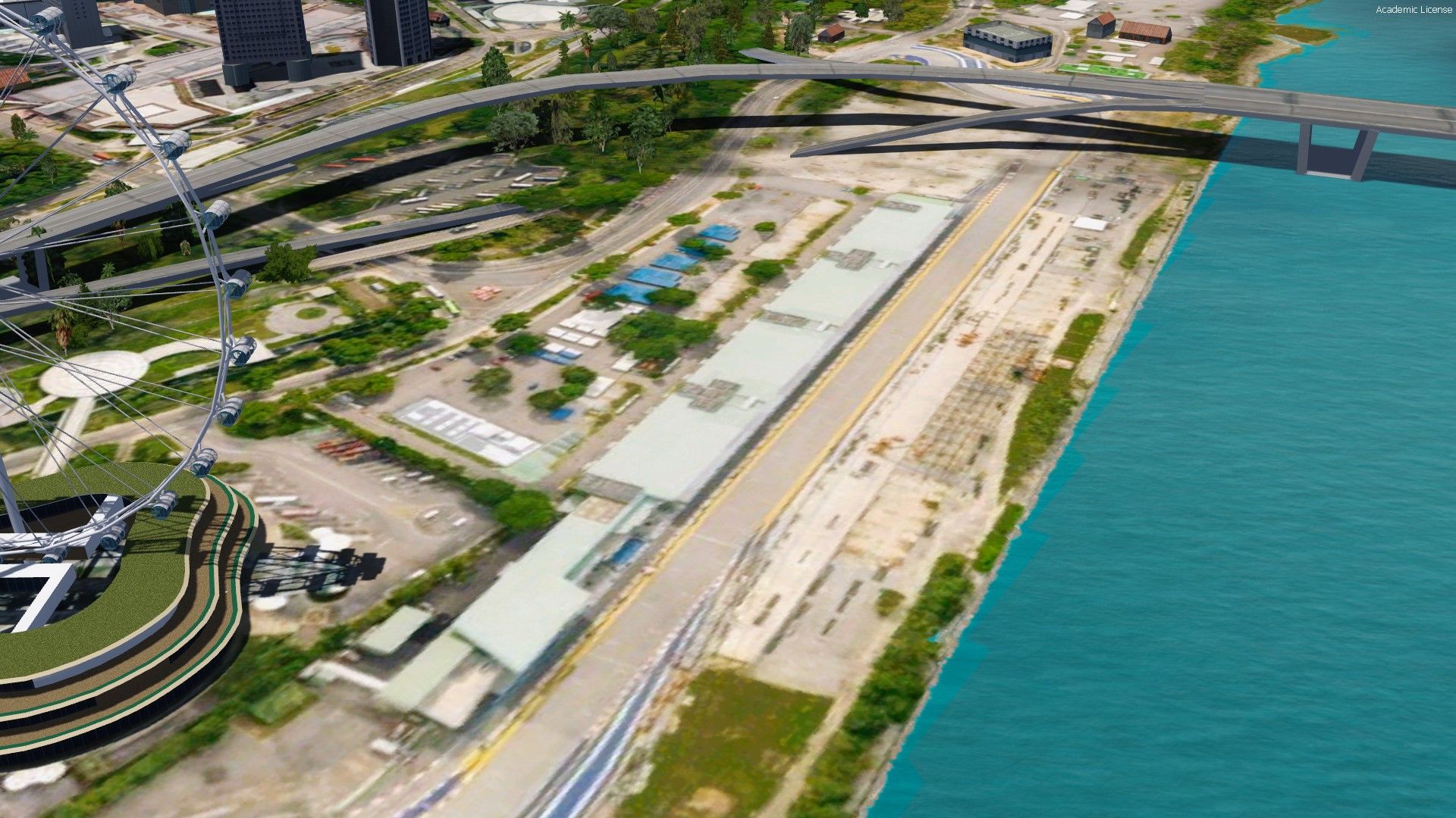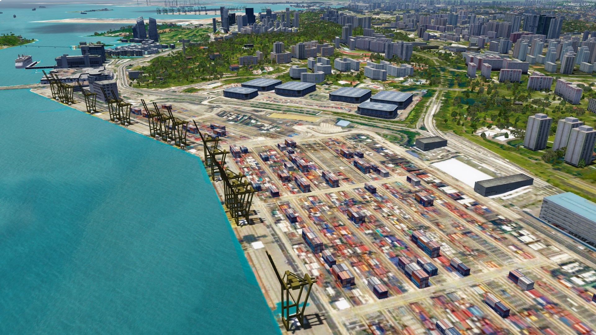 Da verwundert es doch, dass der große Start-Ziel-Komplex des Formel 1-Kurses direkt am Fuße des Riesenrads nur auf der Bodentextur zu sehen ist. Ich persönlich bin kein großer Formel 1-Fan, aber die Boxengasse mit Tribünen und Technikbereich ist einfach ein wichtiger Bereich, der hier hin gehört. Er ist auch vom Wasser und aus dem Flugzeug (wenn man weiß was man sucht) zu sehen. Das enttäuscht.