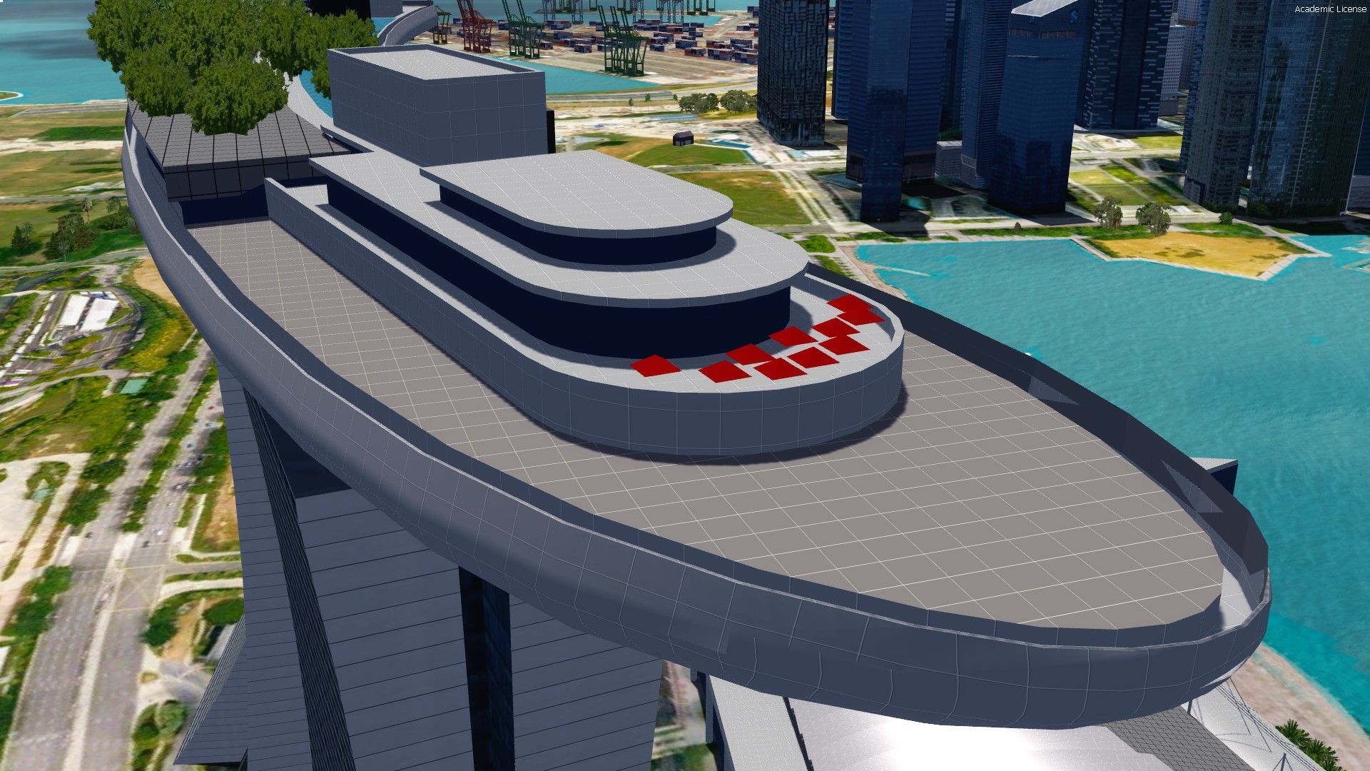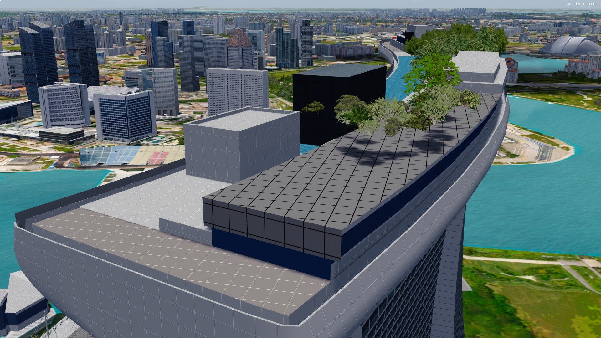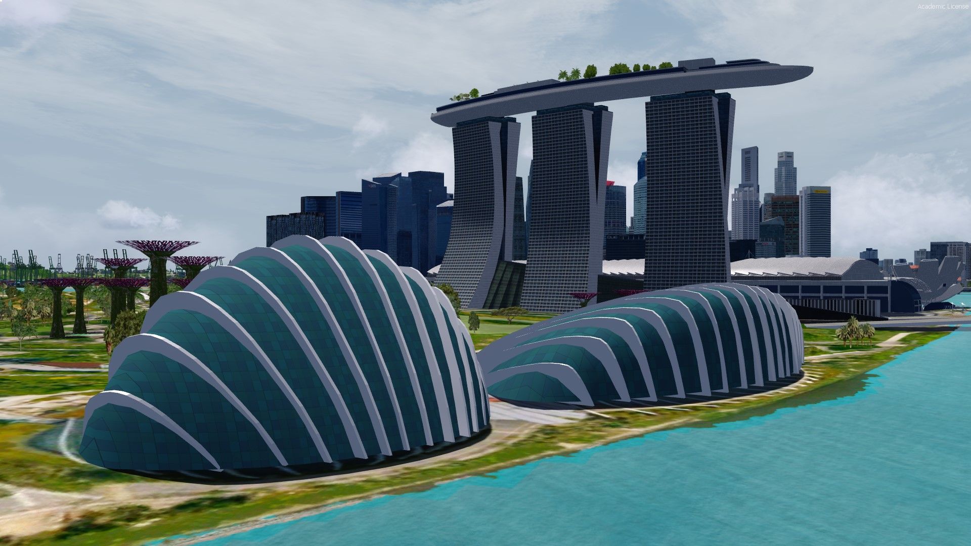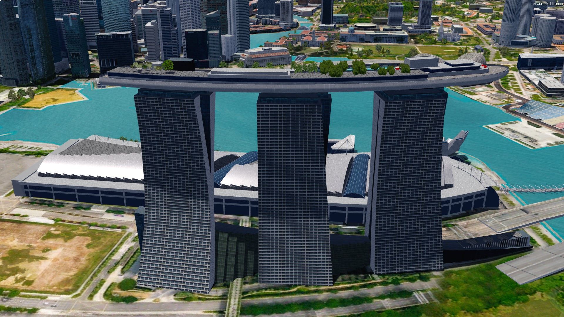 Insgesamt zieht sich ein Bild durch die ganze Innenstadt: Modelle mit Wiedererkennungswert, aber wenig Details, aus der Nähe grobe Texturen, zum Teil kombinierte Häuserblöcke, kaum kleine Details. Man stellt fest, dass die Entwickler viel wert auf Wiedererkennung gelegt haben, sich allerdings aus Performancegründen nicht zu sehr in Details verlieren wollten. Gut erkennbar auch an der Dachterrasse des Marina Bay Sands. Die Sonnenschirme und Pflanzen sind sehr grob platziert, erfüllen aus der Distanz aber vollkommen ihren Zweck.
