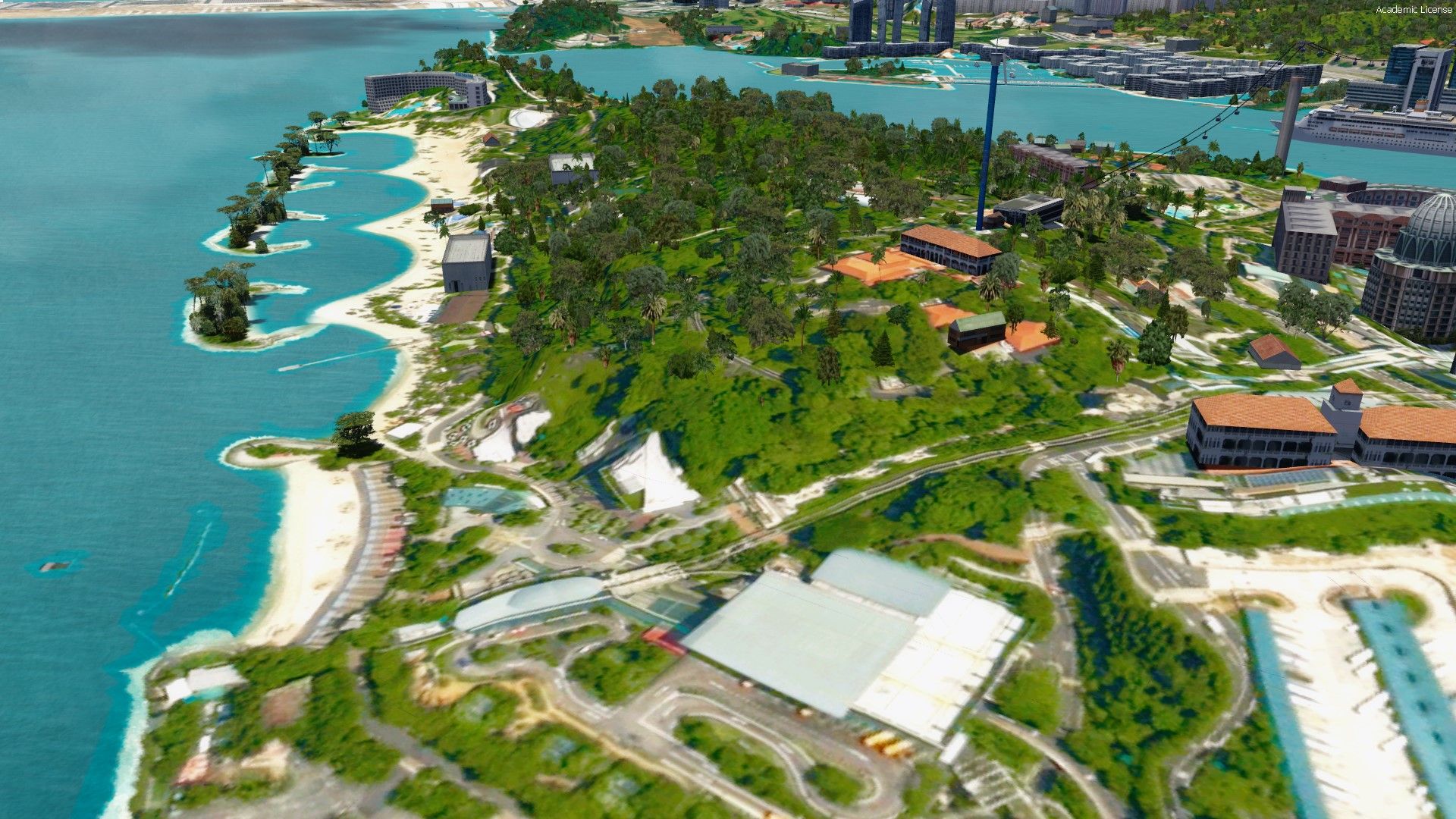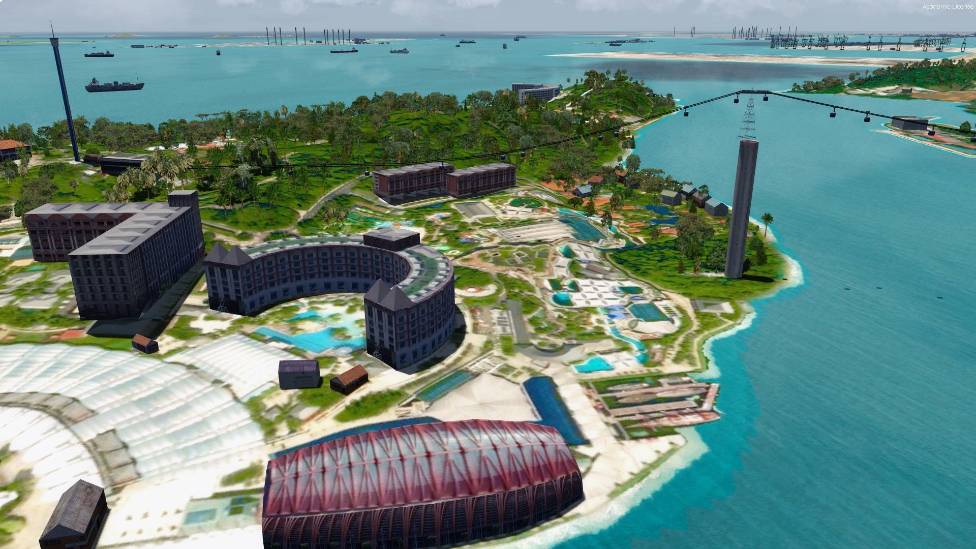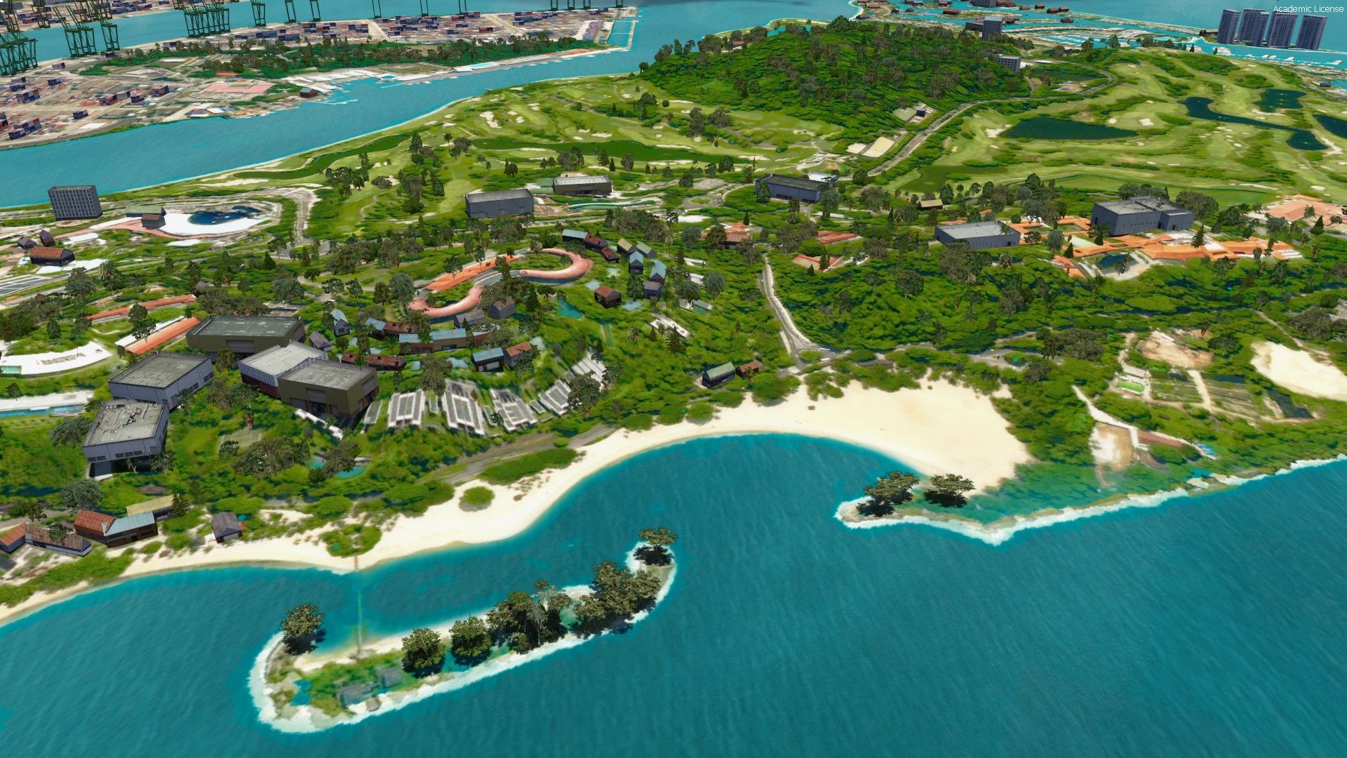 Sentosa ist das Freizeitidyll der Singapurer. Eine große Insel mit zahlreichen Attraktionen, Events, Kunstwerken, Aktivitäten und noch vielem mehr. Hier gibt es Badestrände, Fahrrad- und Segwayrouten, ein riesiges Freibad, einen Aussichtsturm, den Tiger Tower, Hotels, Eisdielen und Restaurants. Die großen Gebäude wurden vom Samscene-Team angemessen, wenn auch wenig detailreich umgesetzt. Einige Objekte fehlen, wie beispielsweise die aufgeständerte Trasse der Einschienenbahn und ihre Haltestellen. Auf der Fototextur findet man viele Gebäude, die es nicht in die 3D-Modellierung geschafft haben. Aus Performancegründen vielleicht verkraftbar, was ich aber wirklich vermisse ist die begehbare Statue des Merlion. Vielleicht eine der Hauptattraktionen, die hier vollkommen fehlt.