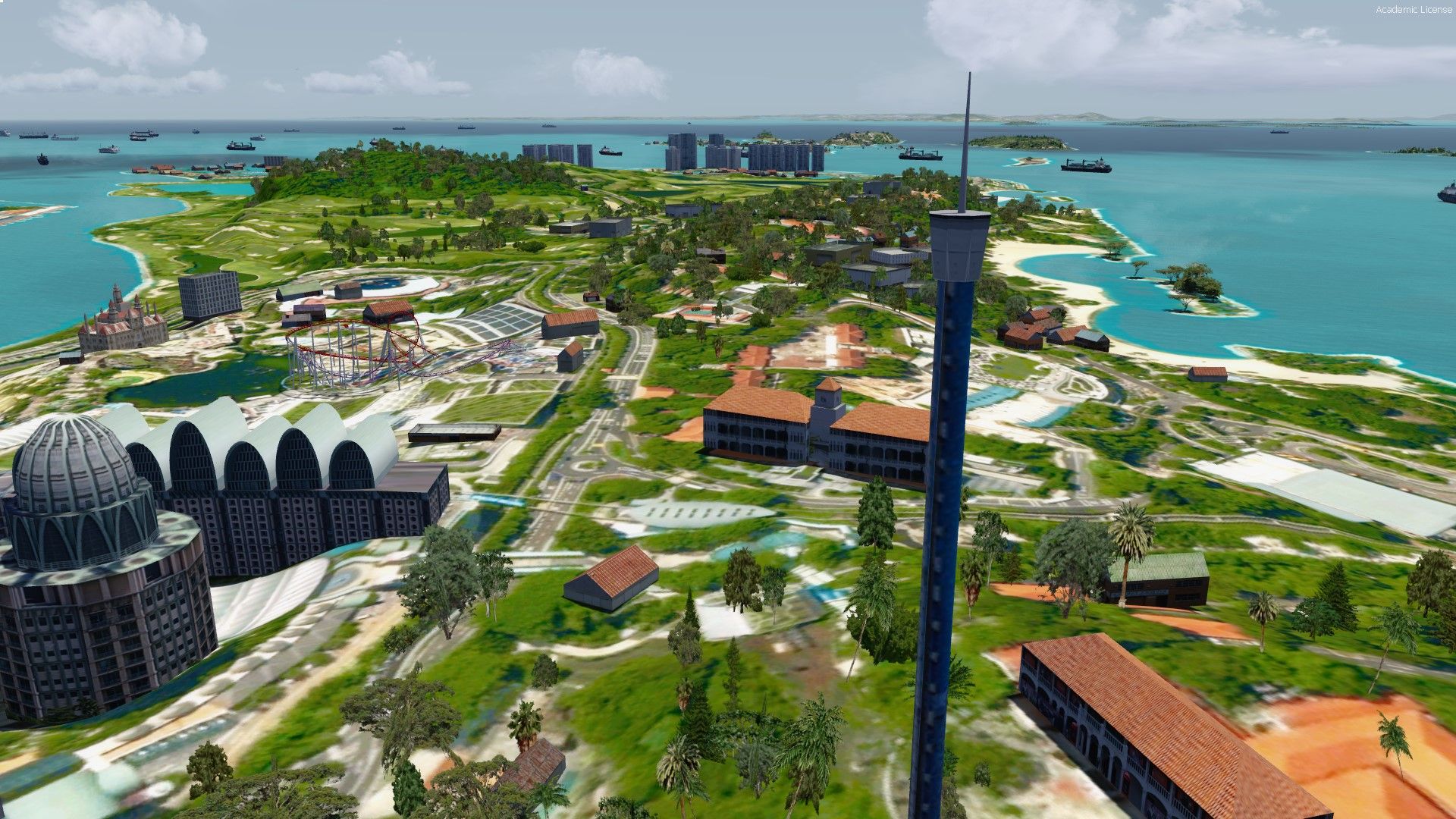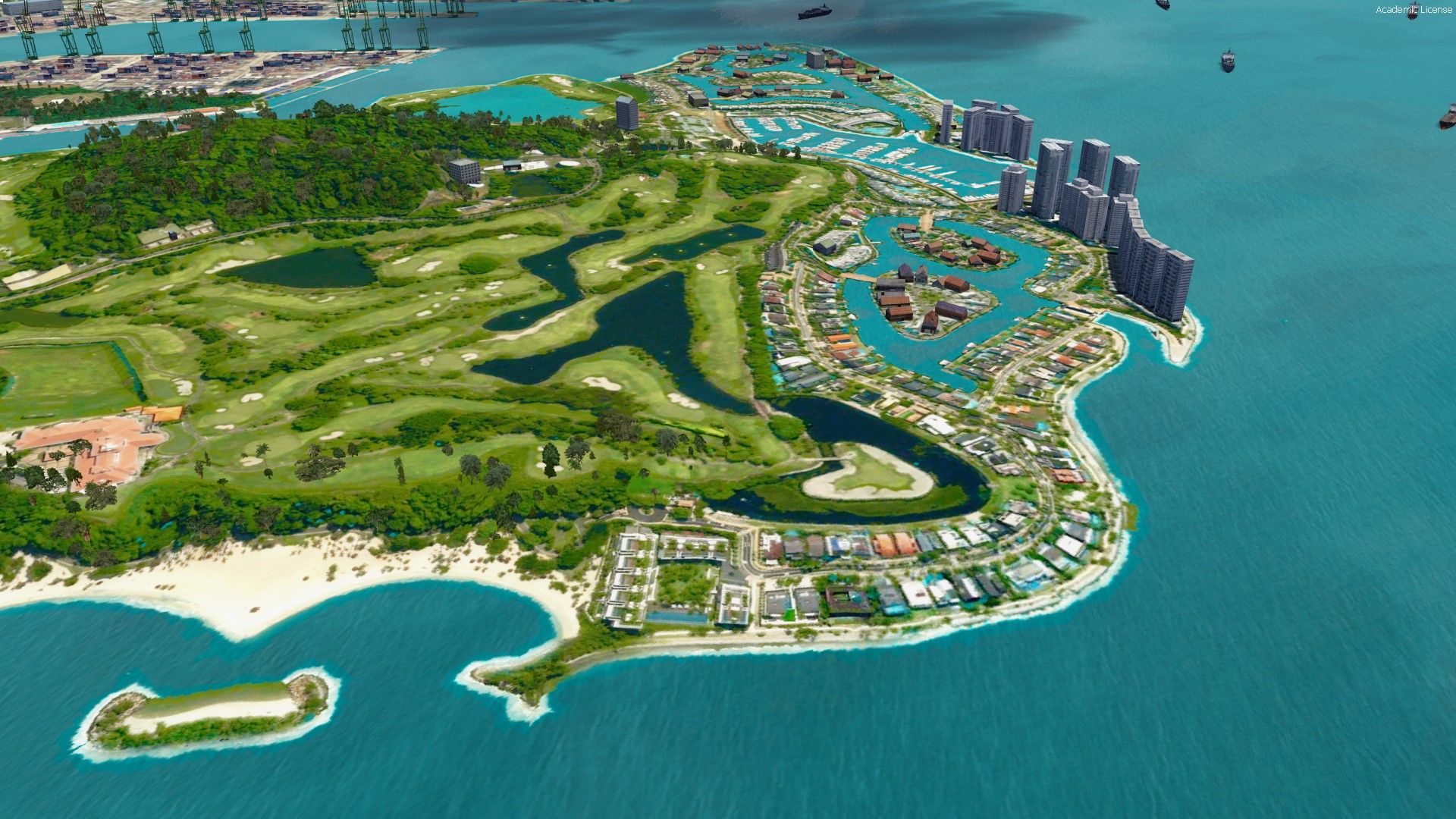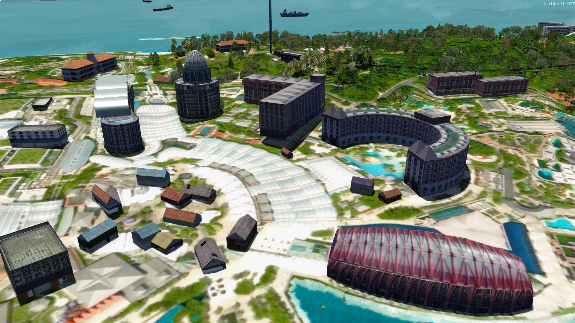 Sentosa ist das Freizeitidyll der Singapurer. Eine große Insel mit zahlreichen Attraktionen, Events, Kunstwerken, Aktivitäten und noch vielem mehr. Hier gibt es Badestrände, Fahrrad- und Segwayrouten, ein riesiges Freibad, einen Aussichtsturm, den Tiger Tower, Hotels, Eisdielen und Restaurants. Die großen Gebäude wurden vom Samscene-Team angemessen, wenn auch wenig detailreich umgesetzt. Einige Objekte fehlen, wie beispielsweise die aufgeständerte Trasse der Einschienenbahn und ihre Haltestellen. Auf der Fototextur findet man viele Gebäude, die es nicht in die 3D-Modellierung geschafft haben. Aus Performancegründen vielleicht verkraftbar, was ich aber wirklich vermisse ist die begehbare Statue des Merlion. Vielleicht eine der Hauptattraktionen, die hier vollkommen fehlt.