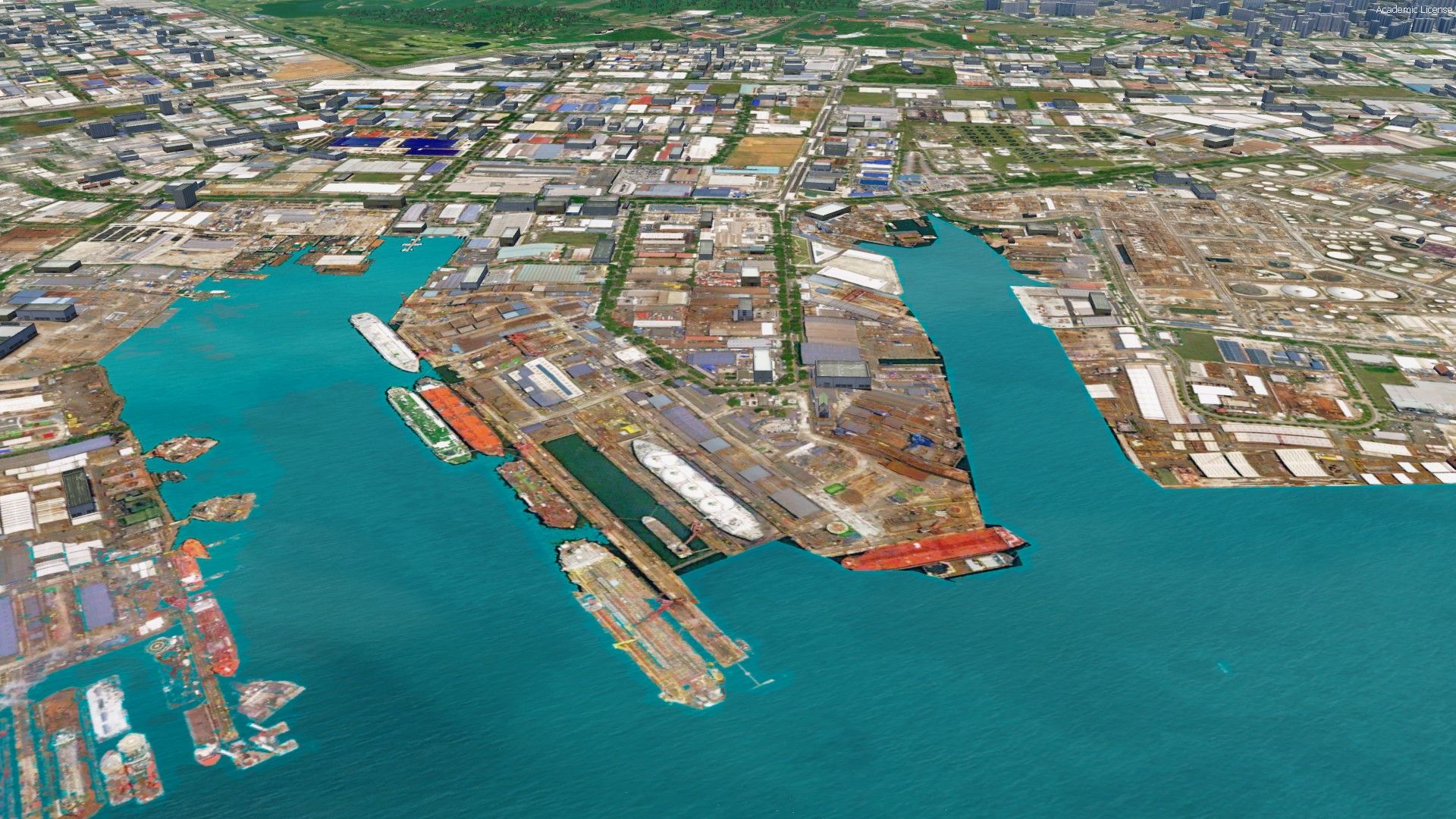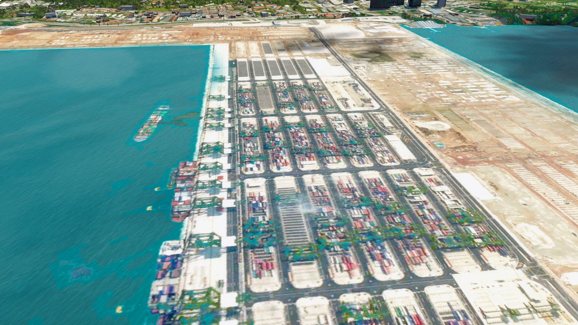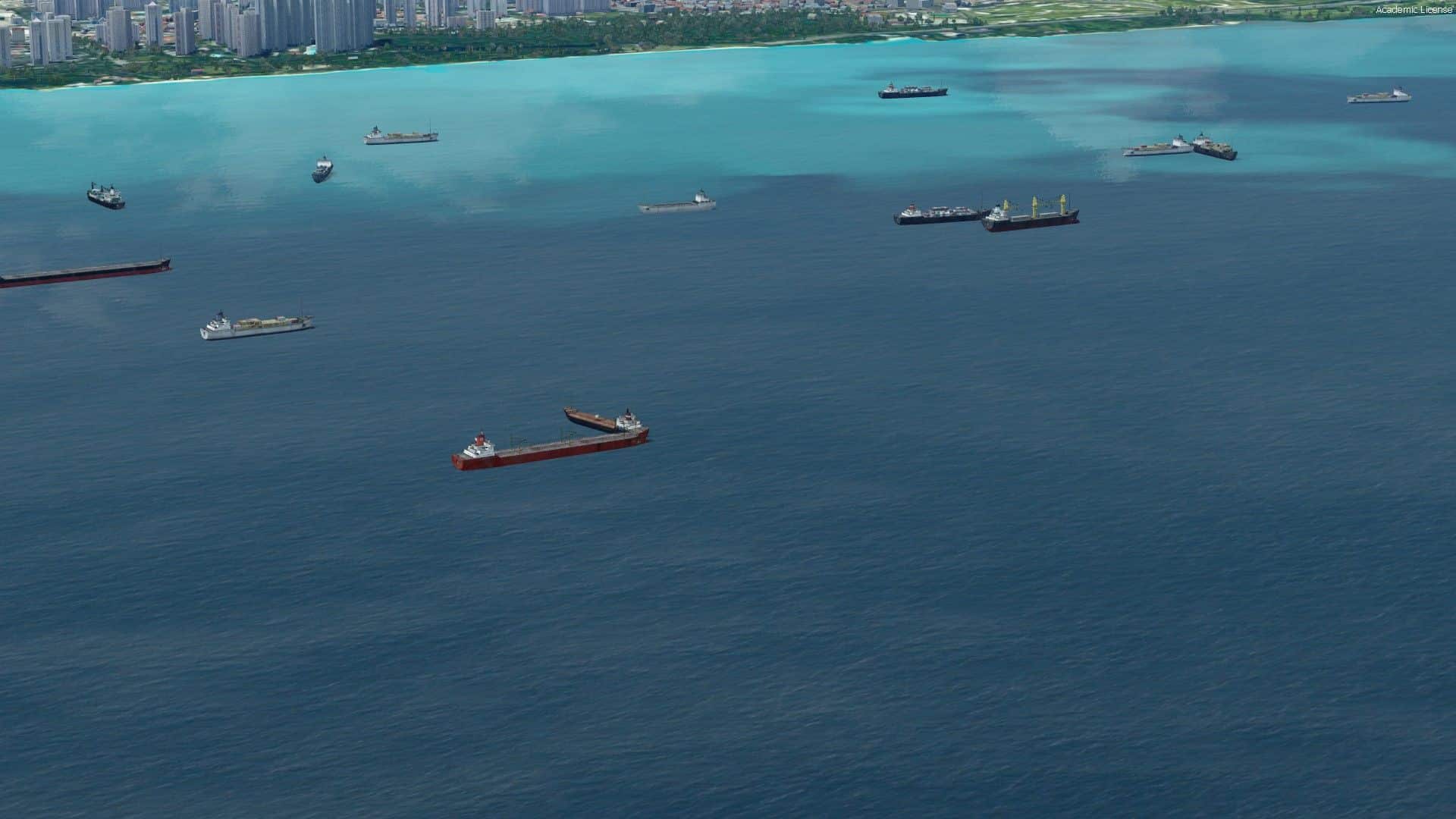 Je weiter man sich in Richtung Westen bewegt, desto spärlicher werden die Hafenbereiche. Zum Teil gibt es sogar lediglich eine Fototextur ohne jegliche Objekte. Hier und da ist das Satellitenbild dann auch nicht gut retuschiert. Ein passendes Beispiel ist etwa das Frachtschiff auf dem zweiten Bild.