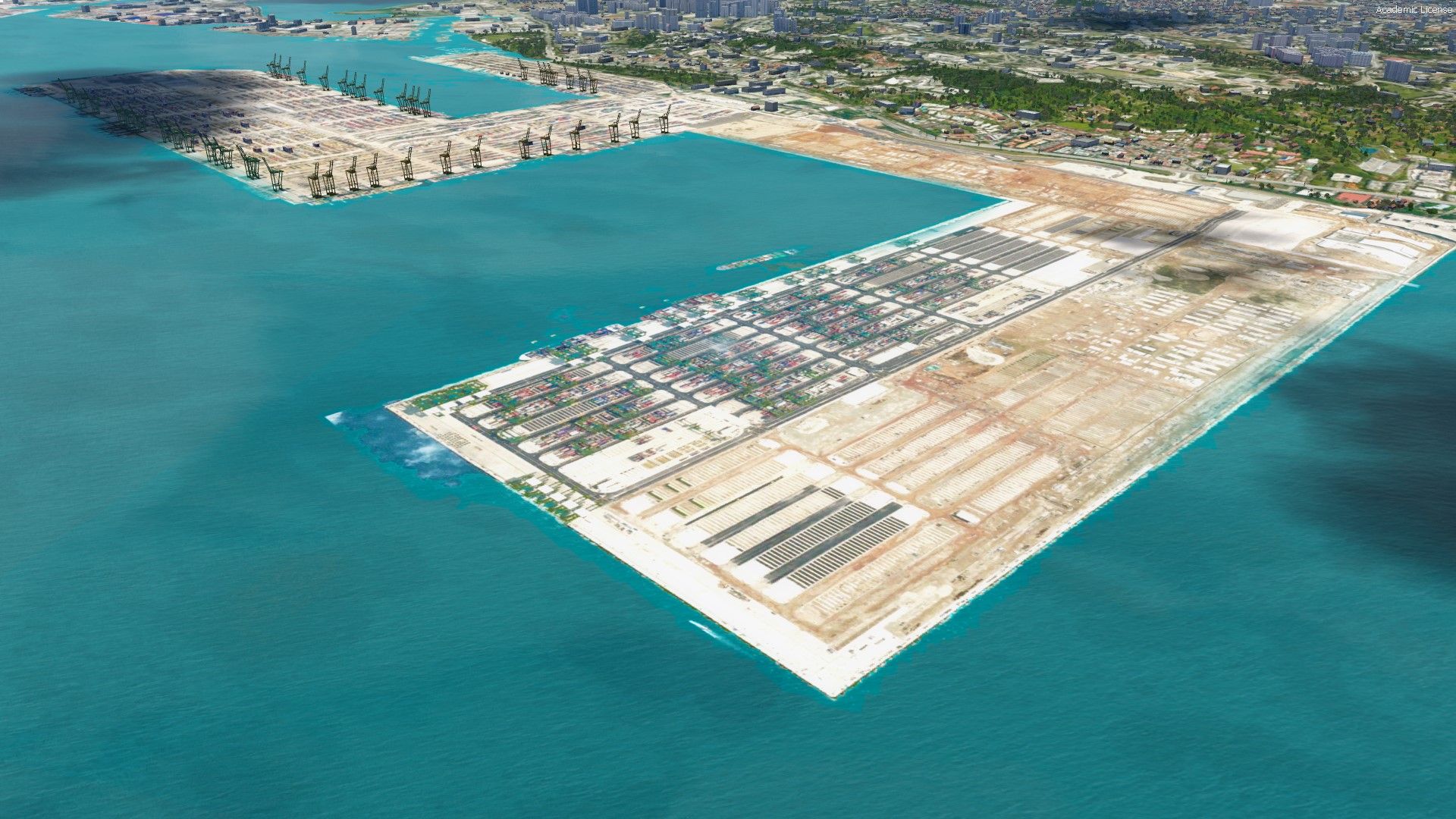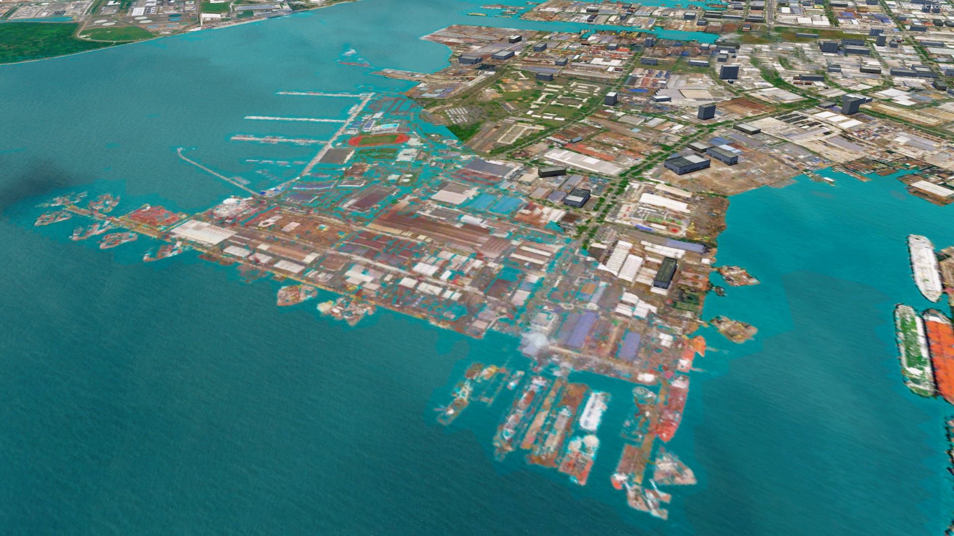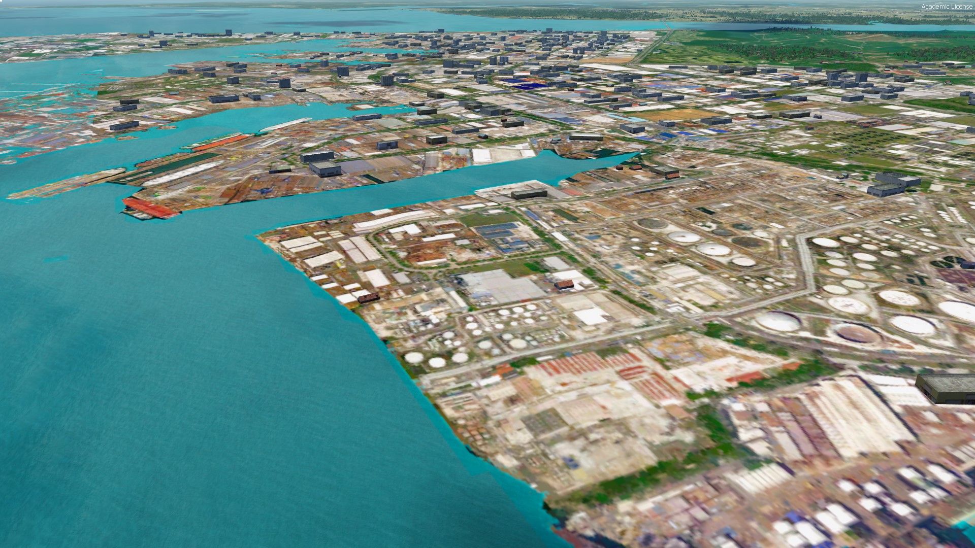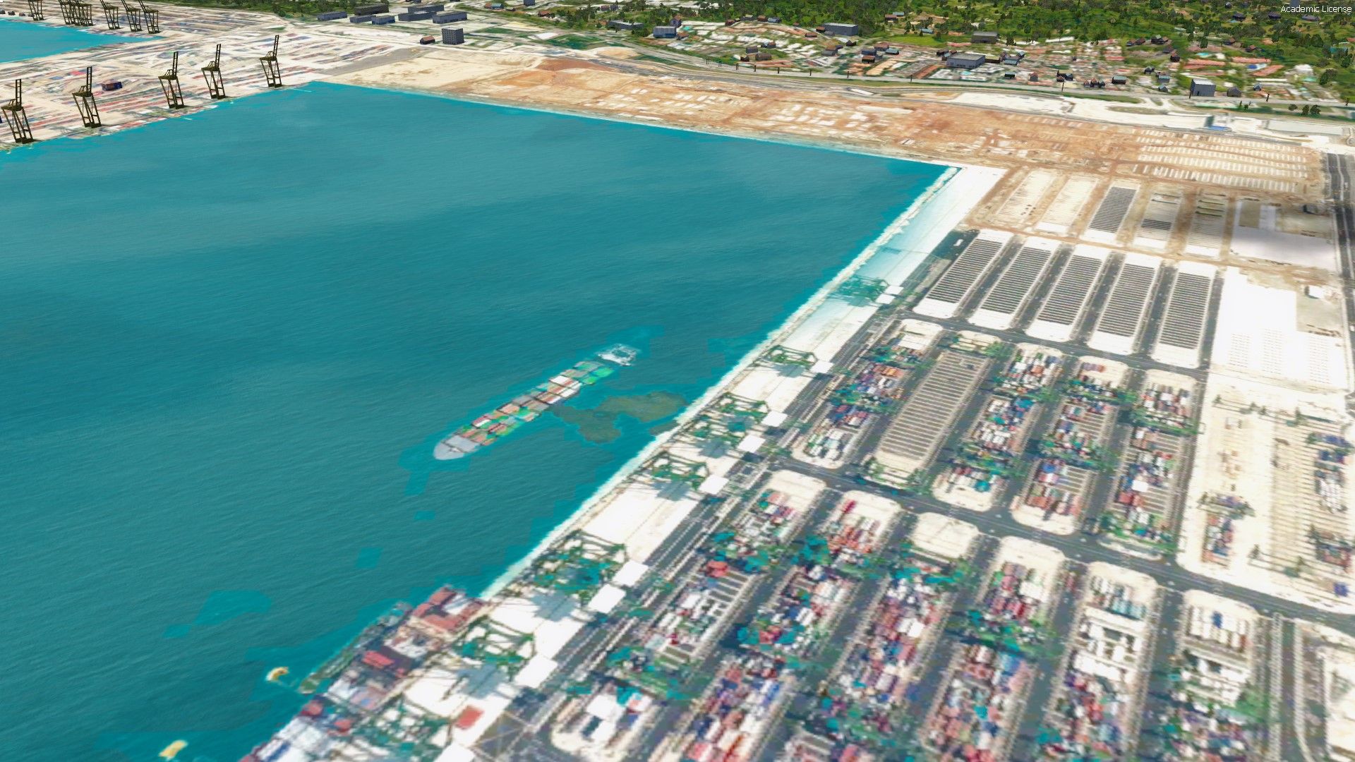 Je weiter man sich in Richtung Westen bewegt, desto spärlicher werden die Hafenbereiche. Zum Teil gibt es sogar lediglich eine Fototextur ohne jegliche Objekte. Hier und da ist das Satellitenbild dann auch nicht gut retuschiert. Ein passendes Beispiel ist etwa das Frachtschiff auf dem zweiten Bild.