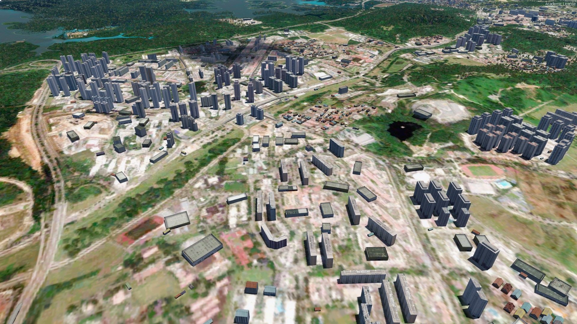 Es fällt auf, dass zwar viele Gebäude, Bäume und weitere Objekte platziert sind, auf der Fototapete aber trotzdem noch reichlich weitere Gebäude zu sehen sind. Die Lücken wurden meiner Meinung nach aber größtenteils passend verteilt. So gibt es keine großen Löcher, in denen es großflächig an Gebäuden fehlt. Die Modelle sind recht grob gehalten, spiegeln aber abwechslungsreiche Formen und architektonische Spezifika wieder. Auch die Texturen sind eher einfacher Art und haben keine besonderen Highlights.