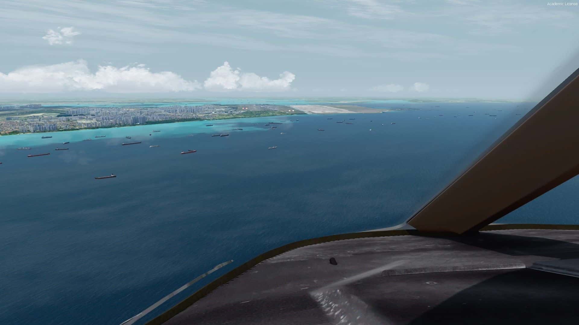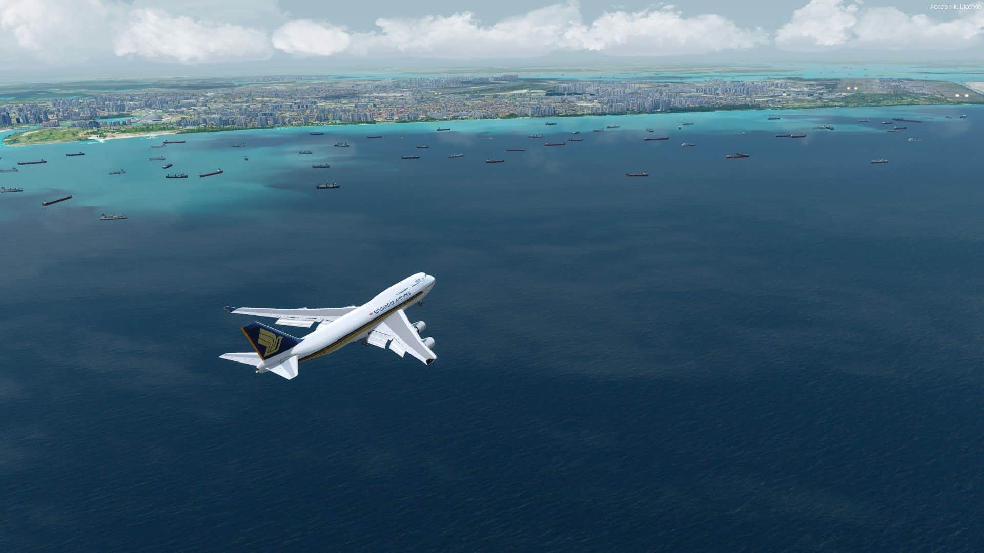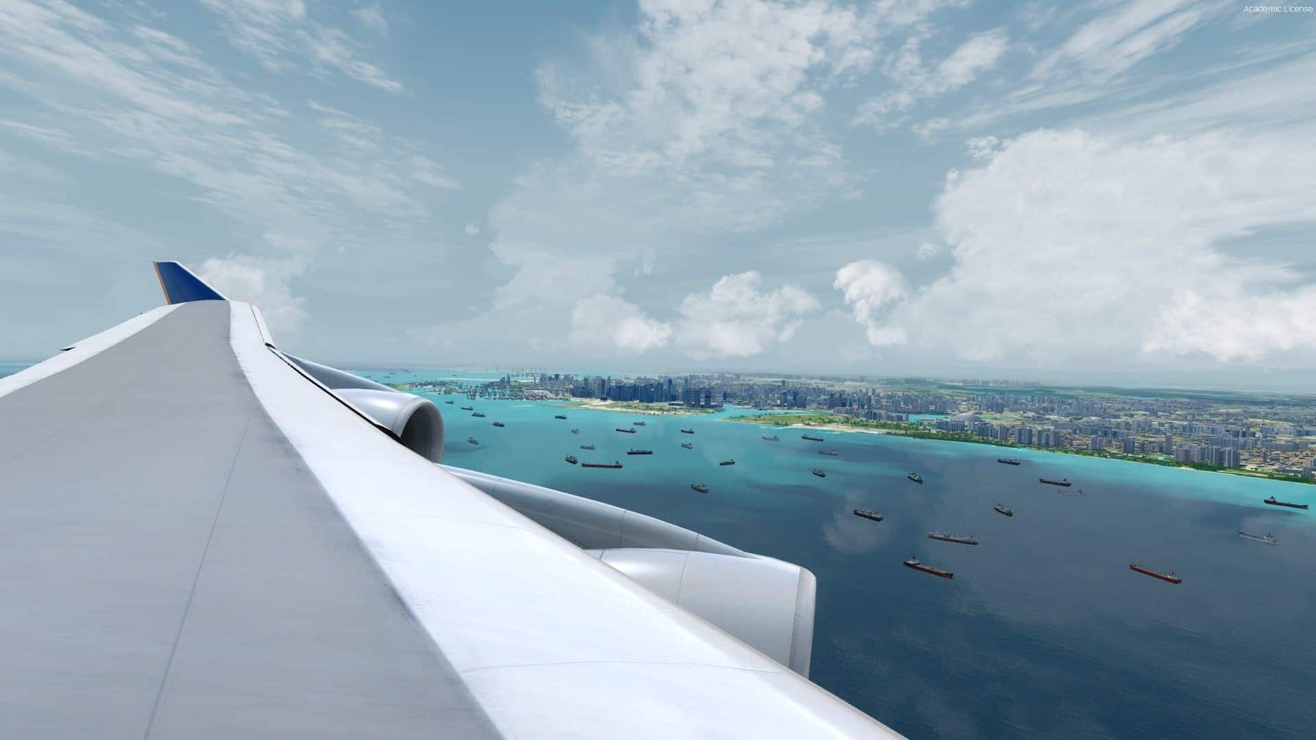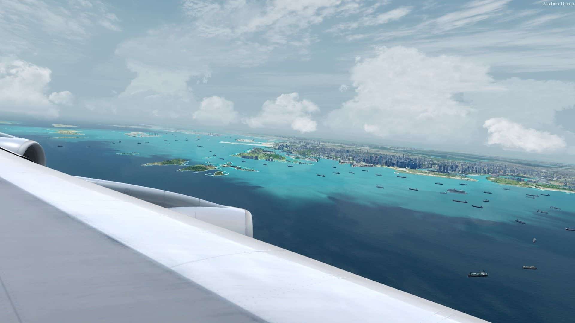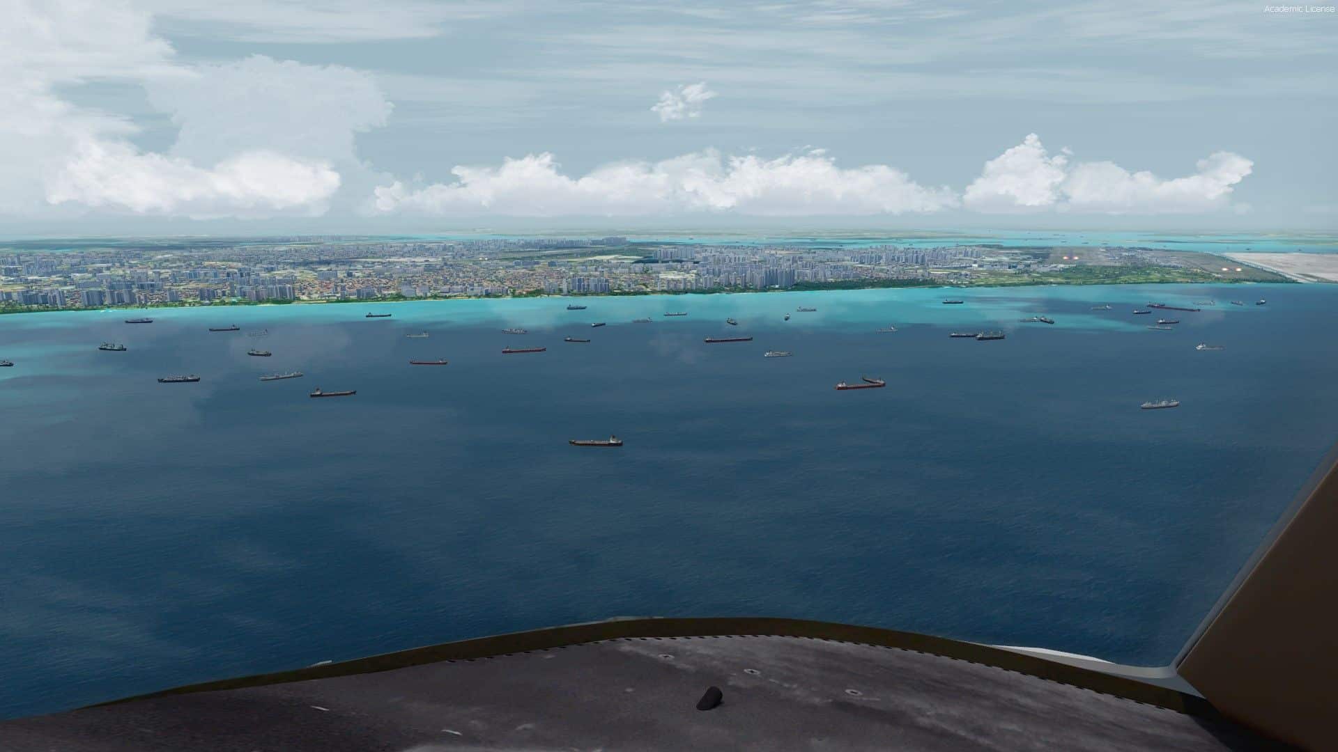 Im Simulator liebe ich Flughäfen, die abseits der Stadt liegen. Irgendwo auf dem Land, am besten kilometerweit vom Zentrum entfernt. Warum? Weil sich das viel schöner und einfacher im Simulator darstellen lässt. Felder, Wiesen oder Wälder sind eben nicht großartig kompliziert. ImagineSims Austin ist da ein schönes Beispiel: Die Szenerie liegt sehr passend eingebettet irgendwie in der Orbx NA-Landschaft und sieht im Anflug sehr passend aus. Viel komplizierter sind da Flughäfen in Stadtnähe. Haneda, Honolulu, Sao Paulo Congonhas, auch Frankfurt. Da können noch so beeindruckende Szenerien kommen, im Anflug fehlt (sofern nicht zusätzlich mit umgesetzt) die Komplexität der Metropole. Das ist auch in Singapur so. Im Anflug auf die 02er fliegt man entlang der Küste. Man hat einen schönen Blick auf die Marina Bay, die vielen Hochhäuser, den Singapore Flyer und Teile des Hafens. Das funktioniert aber nicht mit Prepar3D Default und auch nicht mit Orbx. Auch ImagineSims Lite City kann da keine Abhilfe schaffen. Samscene bingt hier aber das richtige Feeling. Als SQ212 aus Sydney kommend kann man einen beeindruckenden Blick auf die asiatische Metropole werfen und bereits ein wenig Singapur-Feeling erleben. Bereits aus der Entfernung zeigt sich auch der grüne Stil der Stadt. Außerdem ist die Küstenregion mit zahlreichen Schiffen ausgestattet, die den passenden Eindruck einer geschäftigen Handelsmetropole vermitteln.