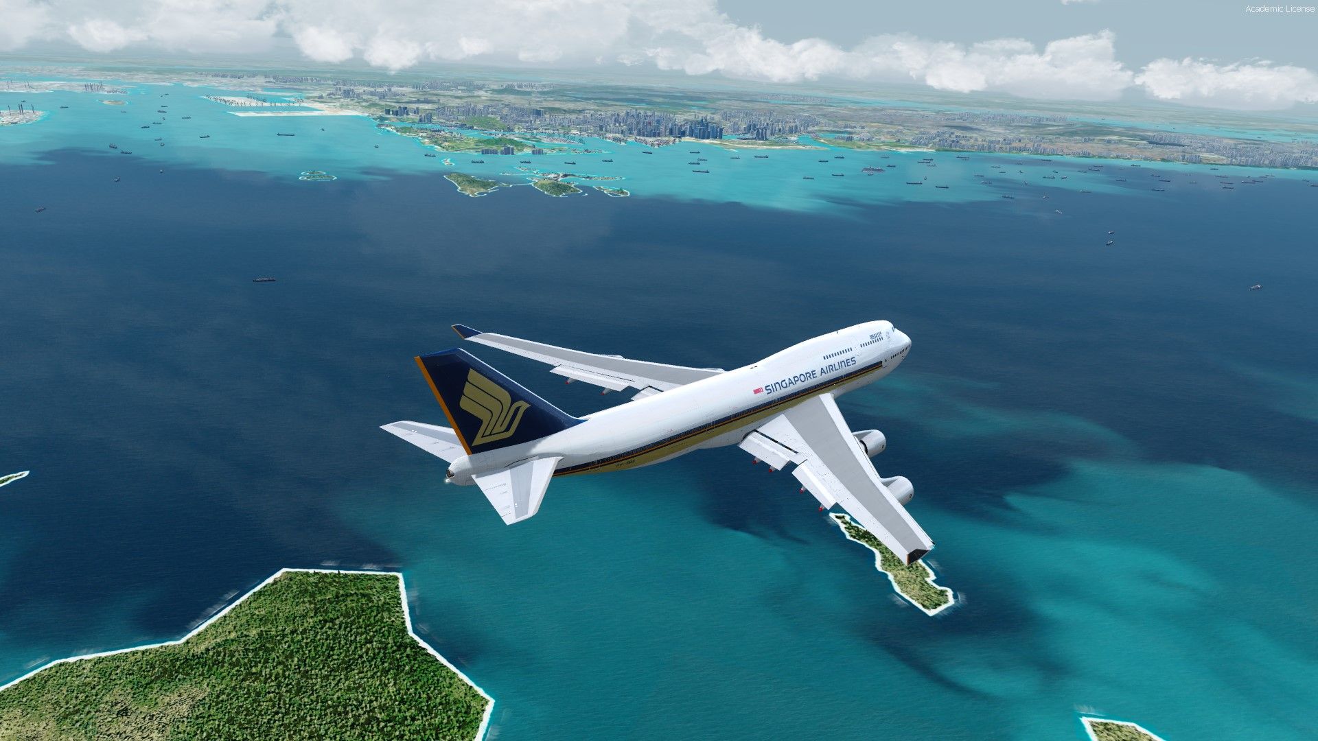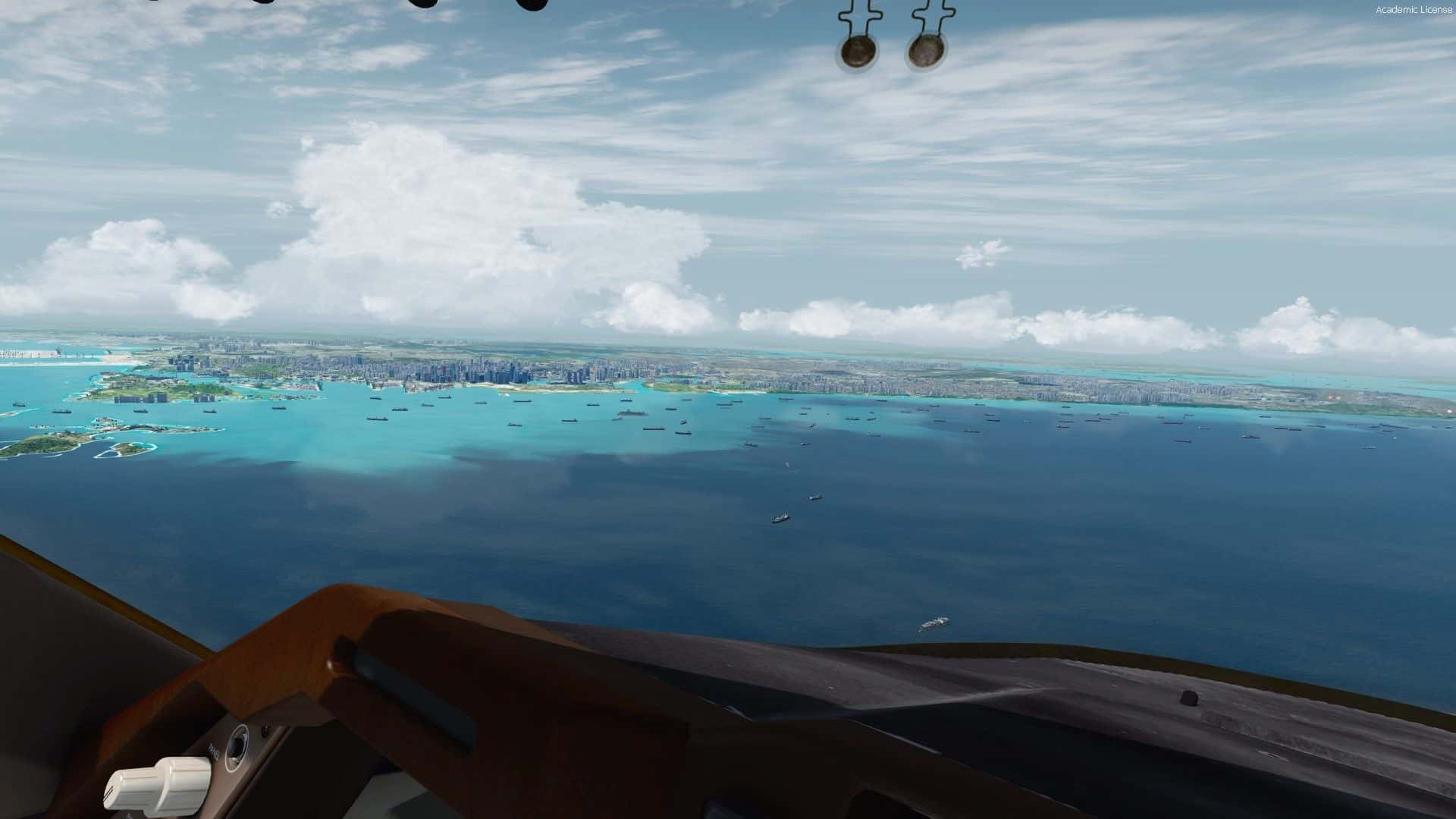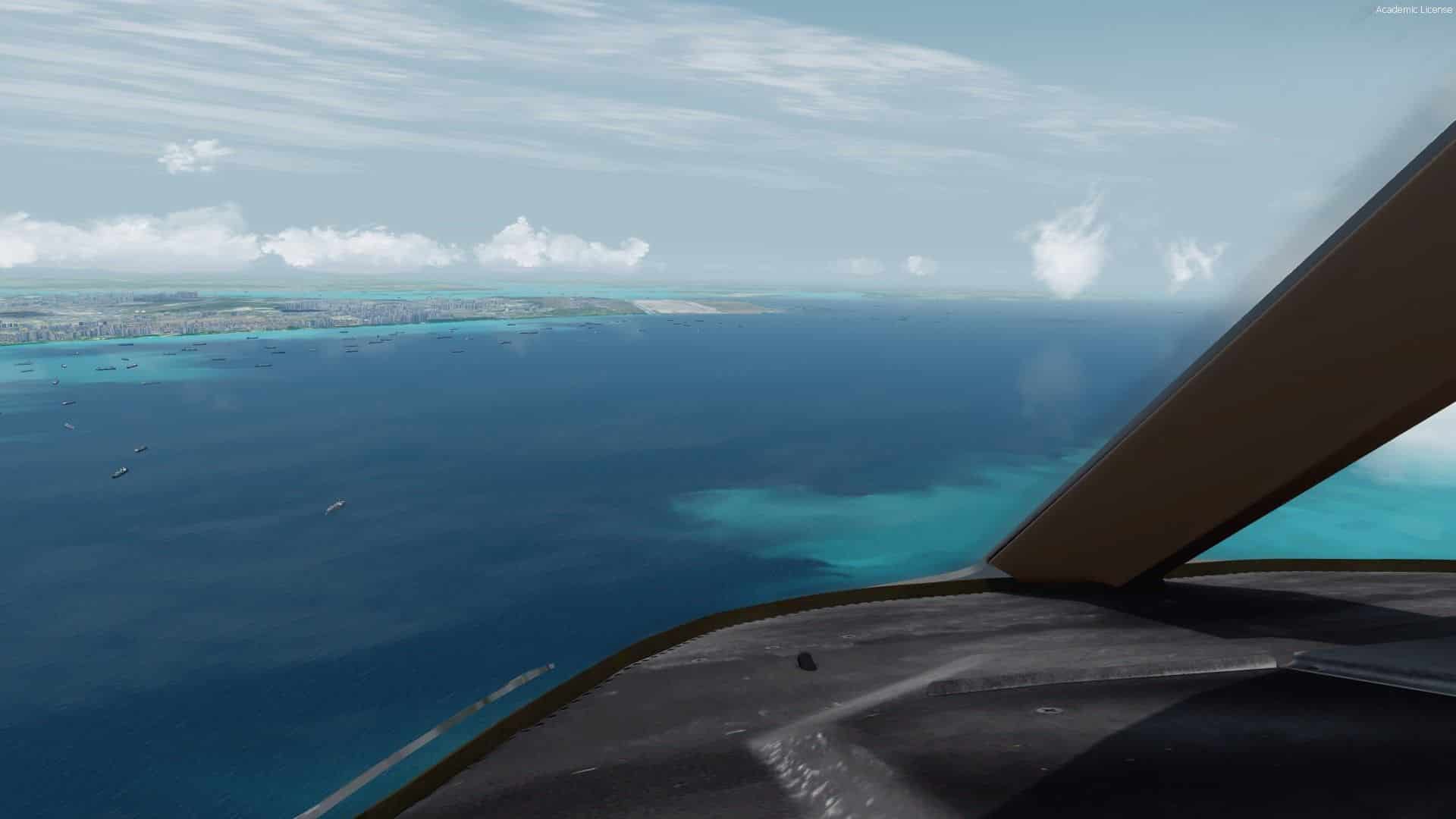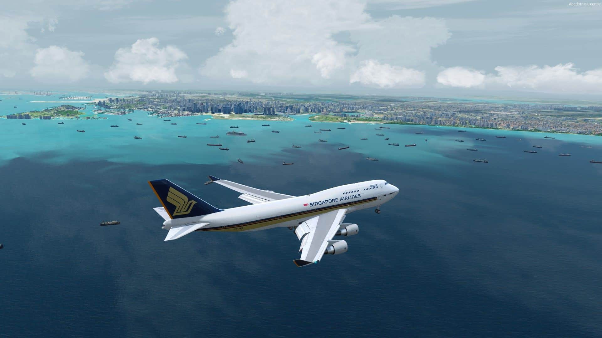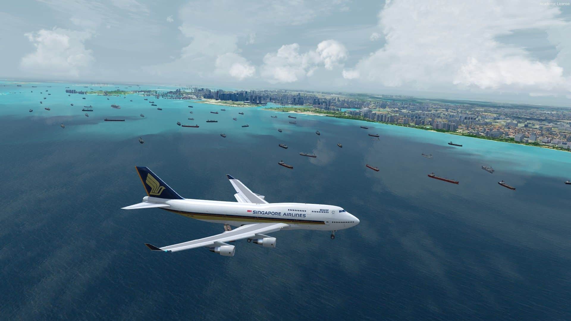 Im Simulator liebe ich Flughäfen, die abseits der Stadt liegen. Irgendwo auf dem Land, am besten kilometerweit vom Zentrum entfernt. Warum? Weil sich das viel schöner und einfacher im Simulator darstellen lässt. Felder, Wiesen oder Wälder sind eben nicht großartig kompliziert. ImagineSims Austin ist da ein schönes Beispiel: Die Szenerie liegt sehr passend eingebettet irgendwie in der Orbx NA-Landschaft und sieht im Anflug sehr passend aus. Viel komplizierter sind da Flughäfen in Stadtnähe. Haneda, Honolulu, Sao Paulo Congonhas, auch Frankfurt. Da können noch so beeindruckende Szenerien kommen, im Anflug fehlt (sofern nicht zusätzlich mit umgesetzt) die Komplexität der Metropole. Das ist auch in Singapur so. Im Anflug auf die 02er fliegt man entlang der Küste. Man hat einen schönen Blick auf die Marina Bay, die vielen Hochhäuser, den Singapore Flyer und Teile des Hafens. Das funktioniert aber nicht mit Prepar3D Default und auch nicht mit Orbx. Auch ImagineSims Lite City kann da keine Abhilfe schaffen. Samscene bingt hier aber das richtige Feeling. Als SQ212 aus Sydney kommend kann man einen beeindruckenden Blick auf die asiatische Metropole werfen und bereits ein wenig Singapur-Feeling erleben. Bereits aus der Entfernung zeigt sich auch der grüne Stil der Stadt. Außerdem ist die Küstenregion mit zahlreichen Schiffen ausgestattet, die den passenden Eindruck einer geschäftigen Handelsmetropole vermitteln.