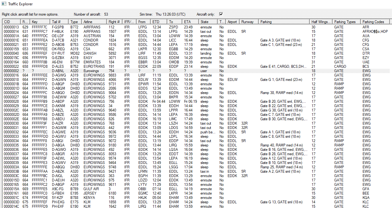 Hier findet man Informationen über den Typ, den Status (taxi, enroute, takeoff, sleep), Start und Ziel und weitere Details über den AI Traffic. Das Eigene Flugzeug erkennt man am Status „user“.
