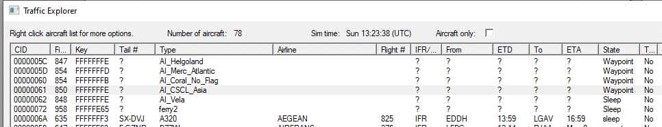 In dieser Übersicht findet man aber nicht nur AI Flugzeuge, sondern auch jeden anderen AI Verkehr aus dem Simulator.