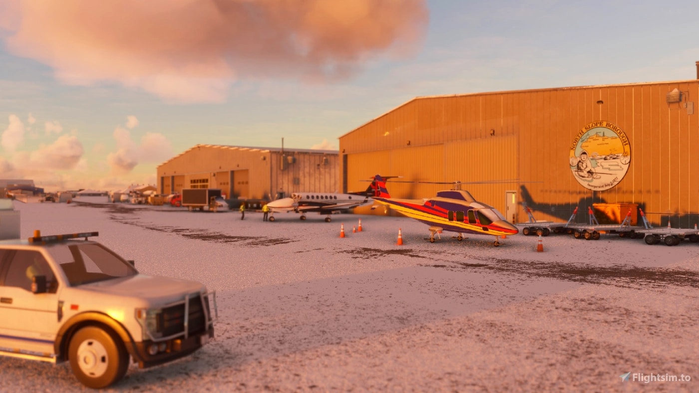 Die Umsetzung für den MSFS bietet eine große Detailtiefe. Terminalgebäude und Hangars sind individuell gestaltet; eine schön gestaltete Halle im Design von „Ravn Alaska“ erinnert daran, dass auch diese Airline bis zu ihrem zwischenzeitlichen Konkurs im Sommer 2020 nach Utqiagvik flog. Am Rand des Flugfeldes lagern Container und größere Objekte, die auf ihren Transport warten.