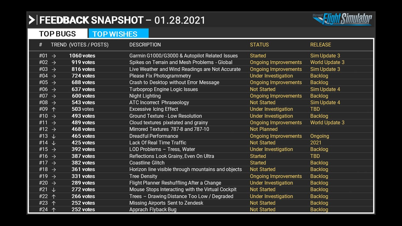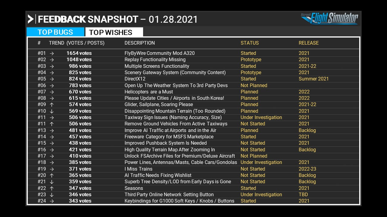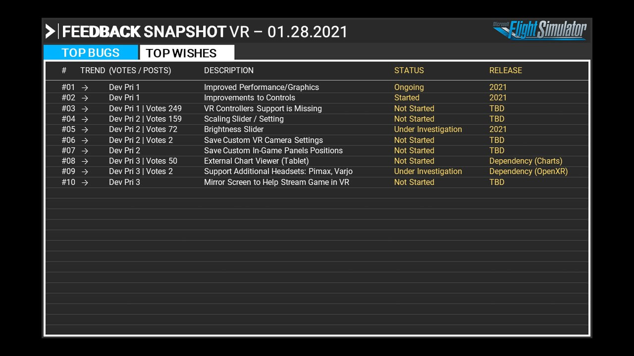 Natürlich dürfen auch die Snapshots der bekannten Bugs und Wünsche der User nicht fehlen. Neu hinzu gekommen ist eine Liste, die sich ausschließlich mit Virtual Reality beschäftigt.