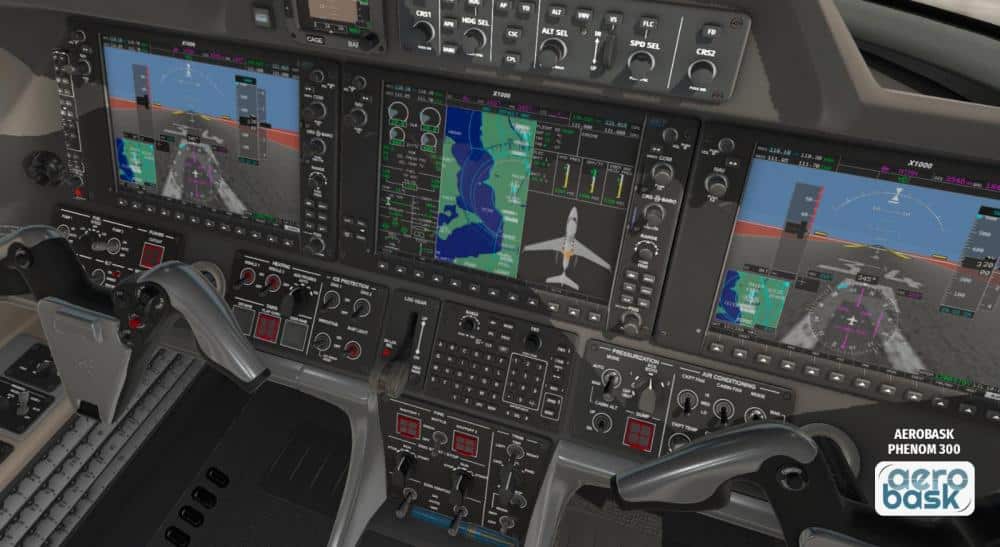 Das Addon für X-Plane wird natürlich deutlich günstiger zu haben sein. Über den Preis gibt es noch keine Angaben, wohl aber zu den Eigenschaften der Umsetzung. So bietet Aerobasks Phenom 300 unter anderem ein detailliertes Cockpit, ein bedienbares Ladesystem, eine eigene Ground-Power-Unit, 4K-PBR-Texturen und eigene FMOD-Sounds. In Sachen Avionik wird ein Garmin G1000-Glascockpit verbaut und soll entsprechend tief simuliert werden. Abgerundet wird der Flieger mit der Avitab-Integration.