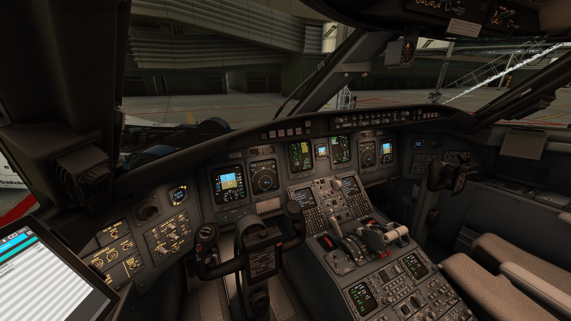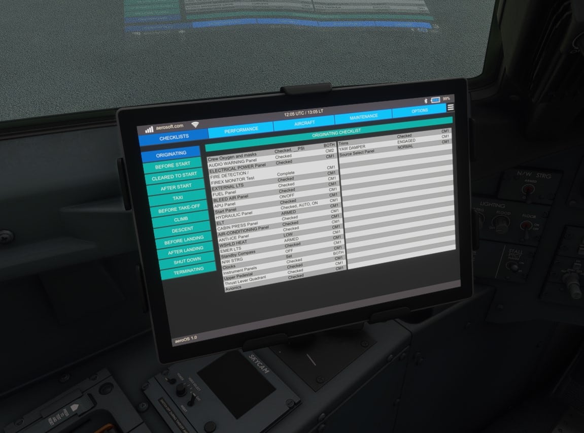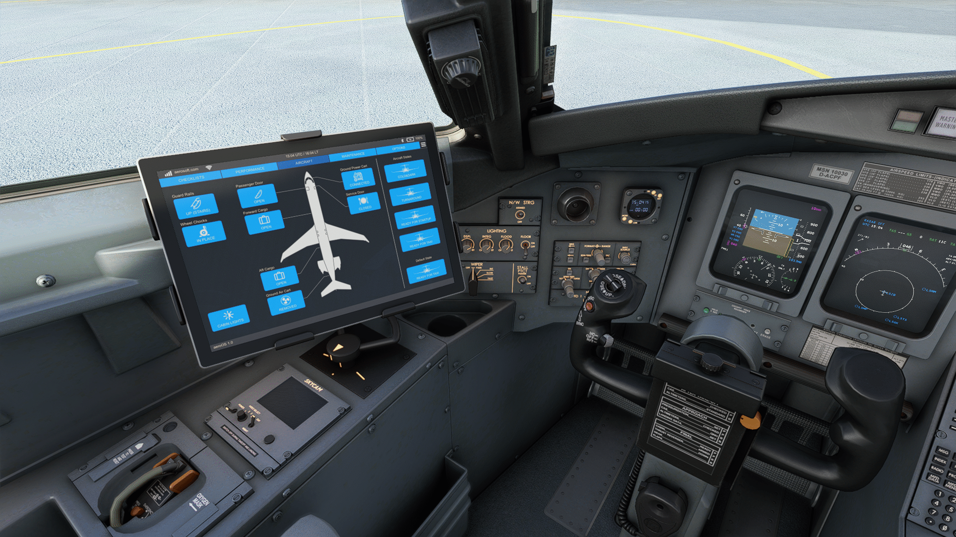 Schon die erste Fassung der CRJ im FSX und frühen Prepar3d-Versionen hatte ein Bedientool im Cockpit. Hier ist es nun ein iPad, mit dem sämtliche Funktionen außerhalb des eigentlichen Cockpits bedient werden, also Türen auf, Flugzeugzustand, Kalibrierung des Schubhebels und so weiter. Es gibt hier auch Checklisten und die Möglichkeit, die Beladung einzustellen und V-Speeds und Reference Speeds zum Flugzeug zu übermitteln. Alles in allem eine sehr bedienerfreundliche Variante – die Immersion bleibt erhalten, toll besonders für VR.