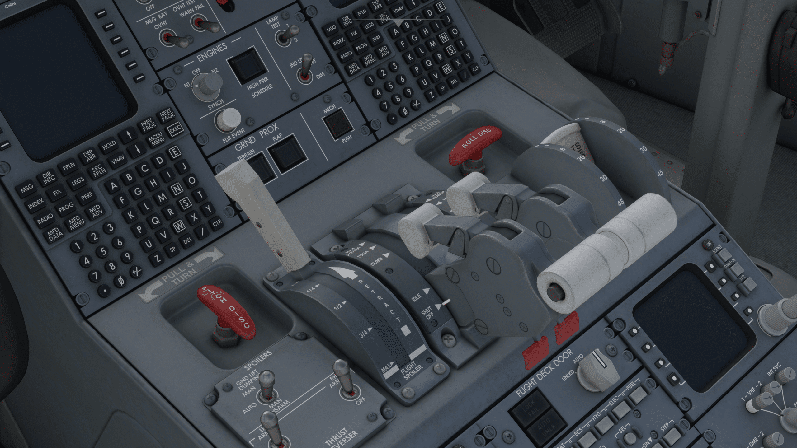 Eine Geschwindigkeitsregelung per Schubkontrolle gibt es nicht, wohl aber – auch wieder ähnlich wie in der Q400 – eine Full Authority Digital Engine Control, also eine FADEC. Das funktioniert so: Zum Starten die Schubhebel in die Stellung TOGA schieben, sie rasten ein, der Schub wird automatisch korrekt angepasst. Landebahn zu kurz? Schubhebel weiter nach vorne in die Rastung „Max Power“ schieben. Für Steigflug gibt es die Rastung „Climb“, und nur im ebenen Flug (Reiseflug, Altitude Constraints) wird manuell geregelt. Das ist eigentlich halbwegs komfortabel, auch solche Finessen wie Take-Off mit reduziertem Schub per „assumed outside temperature“ kennt das FMS, der Schub für die TOGA-Rasterung wird dann entsprechend angepassst. Auf dem folgenden Bild sind die Markierungen an den Schubhebeln zu erkennen: