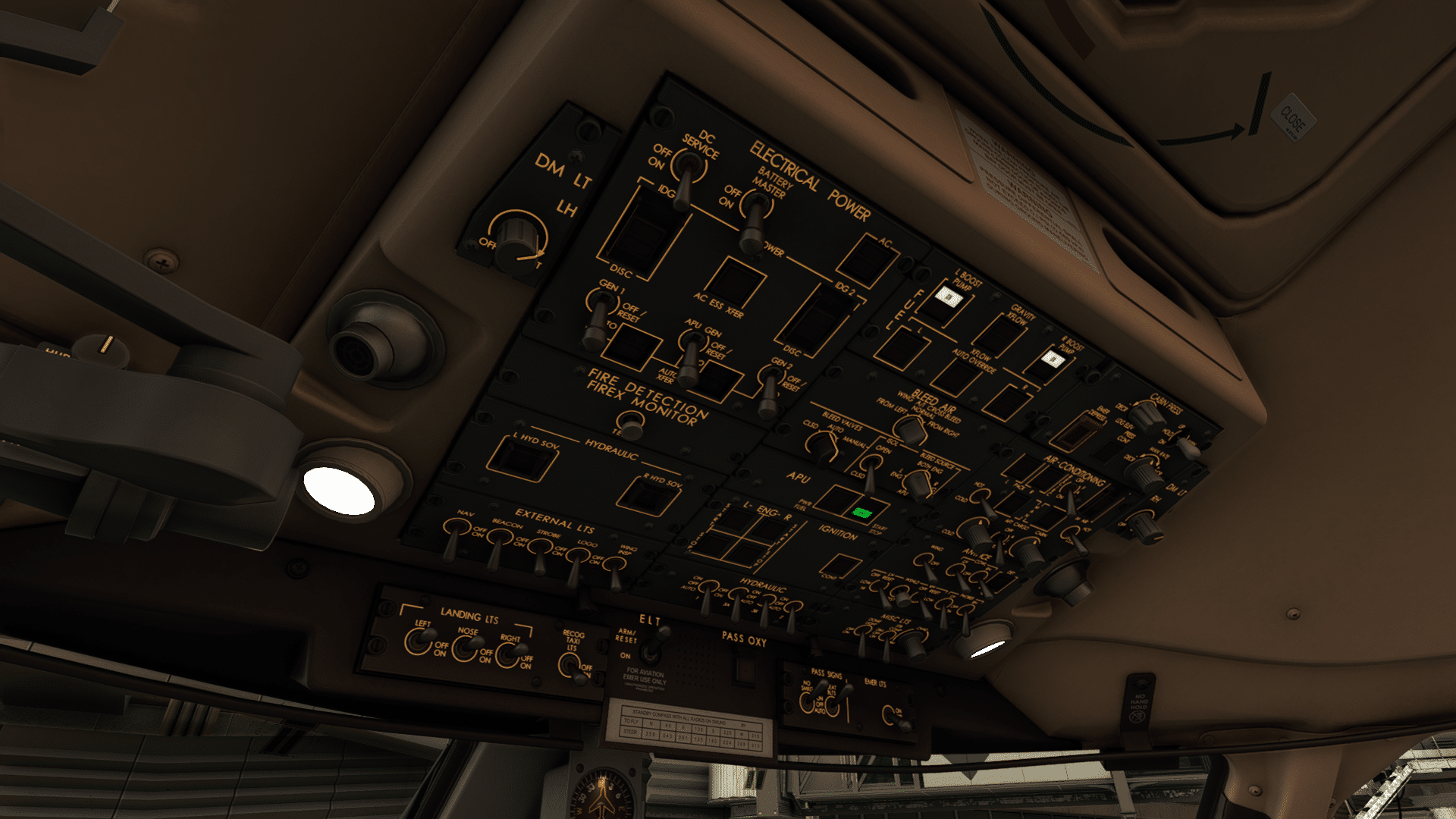 Das fängt schon mit der Beleuchtung an…bis man alle Lampenschalter und -regler gefunden hat, sucht man eine Weile (und findet immer mal wieder was Neues). Das Cockpit illuminiert sich dann aber sehr heimelig. Ob mit Tages- oder Kunstlicht: alles ist sauber modelliert, fein zisiliert, auch beim heranzoomen sauber beschriftet. Da pixelt nichts, da ist ganze Arbeit geleistet worden, selbst an Stellen, die man nur selten anschaut, wie den Sicherungsleisten! Einfach schön, so wünscht man sich einen Flieger auf optischem MSFS-Niveau! Wenn man auf höchster Zoom-Stufe genau hinschaut, sieht man wieder kleine Ecken an den runden Rädchen, Leitungen usw. … im Normalbetrieb fällt das aber nicht auf.