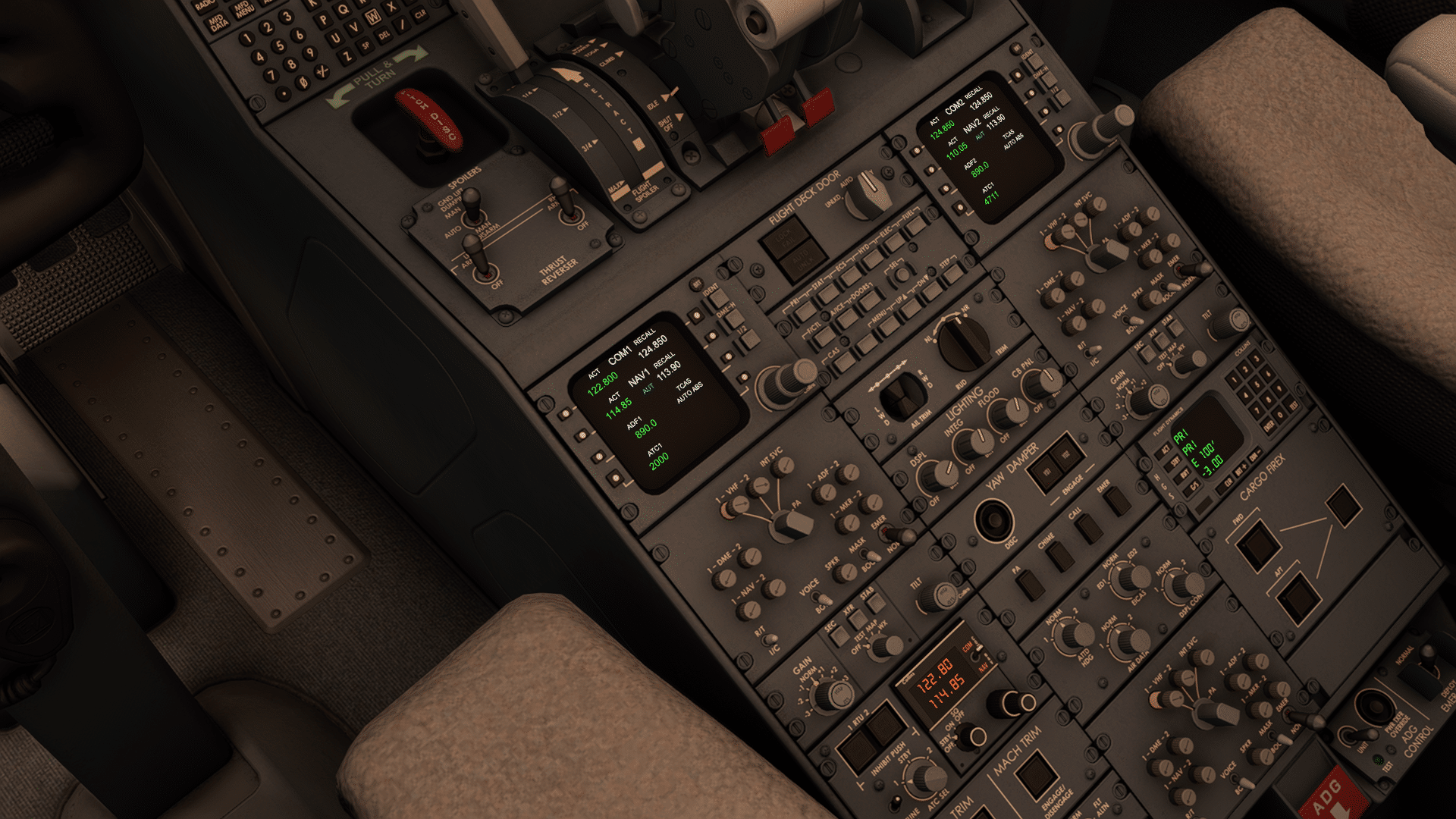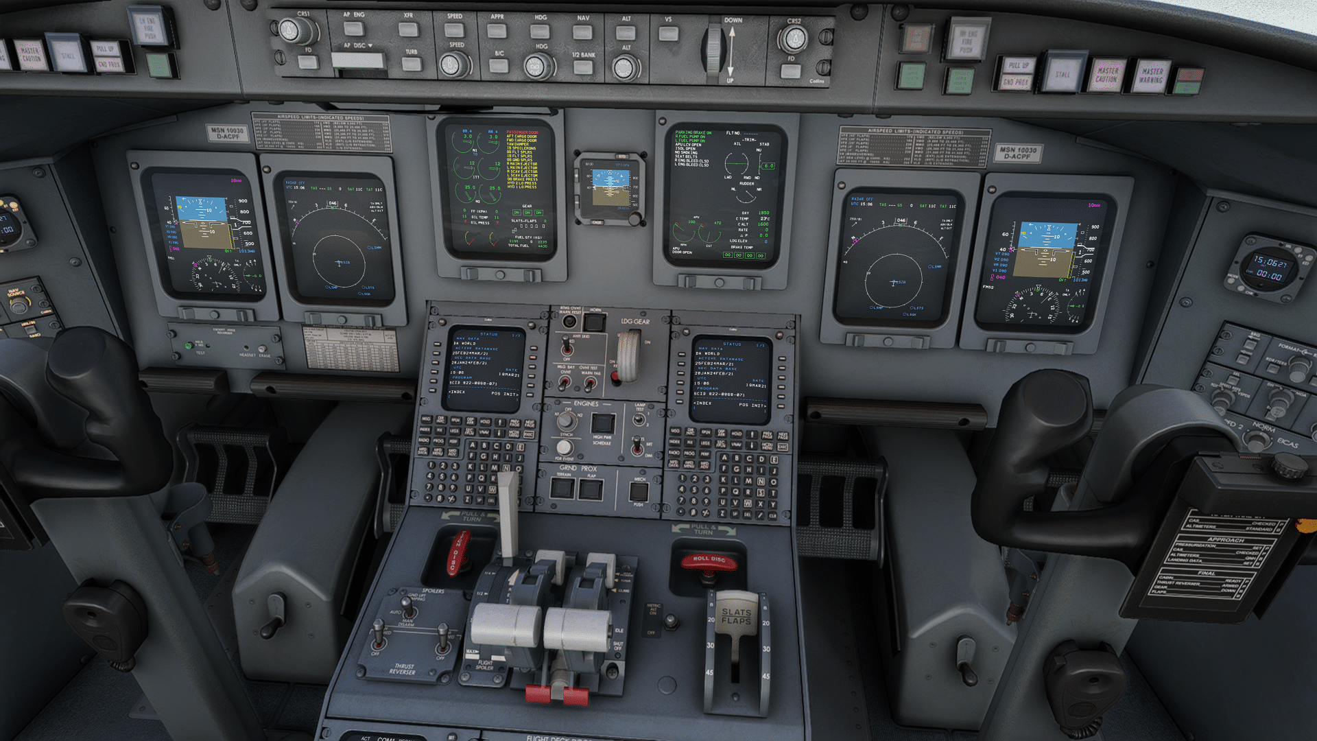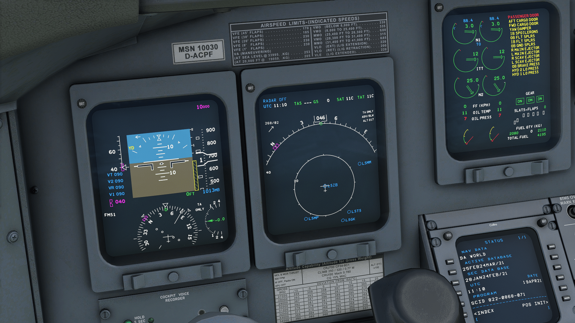 Also ganz nach vorne an den Arbeitsplatz … und hinsetzen. Mit Track IR vermittelt sich gleich, dass das hier mal die Dimension eines Businessjets war, jetzt vollgepackt mit Airlinertechnik – es ist eng. Gut, dass der Simulant nicht simuliert wird – man erntete ständig Kollisionsmeldungen. Und noch etwas fällt auf…so ein vertrautes „Aerosoft“-Feeling, wie man es z.B. aus den FSX-Airbussen kennt, irgendwas an den Grafiken hat einen „Stallgeruch“, das sind jedenfalls keine Foto-Oberflächen mit Abnutzungsspuren, sondern Computer-Texturen. Die Enge macht sich auch „bei der Arbeit“ bemerkbar – die Bildschirme sind recht klein (wenn auch informativ), man muss sich weit vorbeugen zum Lesen. Und die viiiielen Knöpfe, Rädchen, Hebel liegen eng beieinander und sie sind klein. Die CRJ ist was für gute Augen und für Pianistenhände. Dafür kann Aerosoft nichts – im Gegenteil, das Feeling kommt sehr gut rüber. Die Bedienung wird dann auch delikat… man muss sehr genau hinschauen, und mit der Maus präzise ansteuern, um das richtige Rädchen zu treffen und dann in die richtige Richtung zu drehen. Leider funktioniert mein VR-Insight-Panel nicht für Aerosofts CRJ, das würde vieles leichter machen (und sicher gibt es bald Hilfe aus der Community). Diese CRJ ist eben kein „reinsitzen und losfliegen“ Addon, sondern will erarbeitet werden. Man muss sich eingewöhnen.