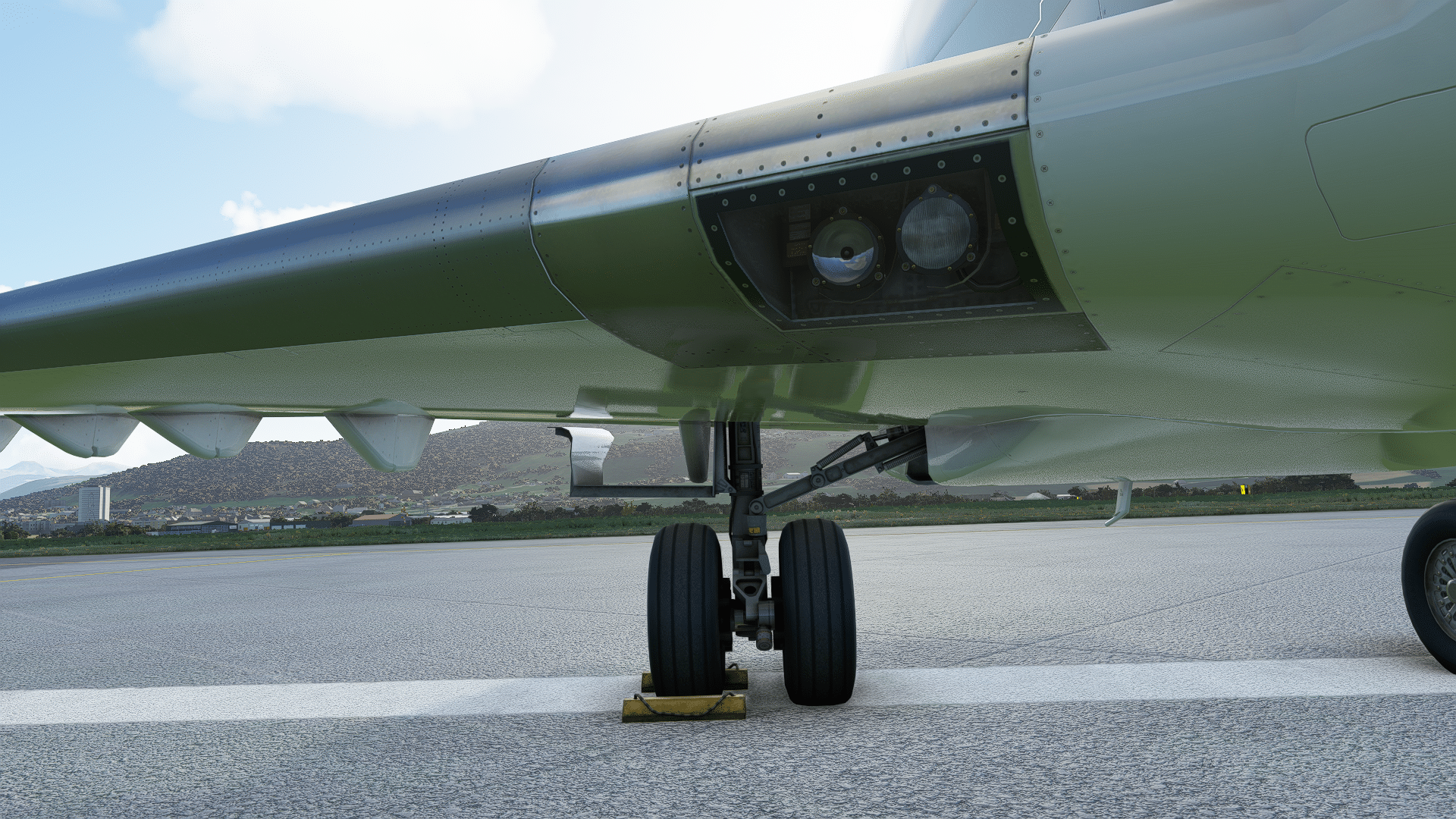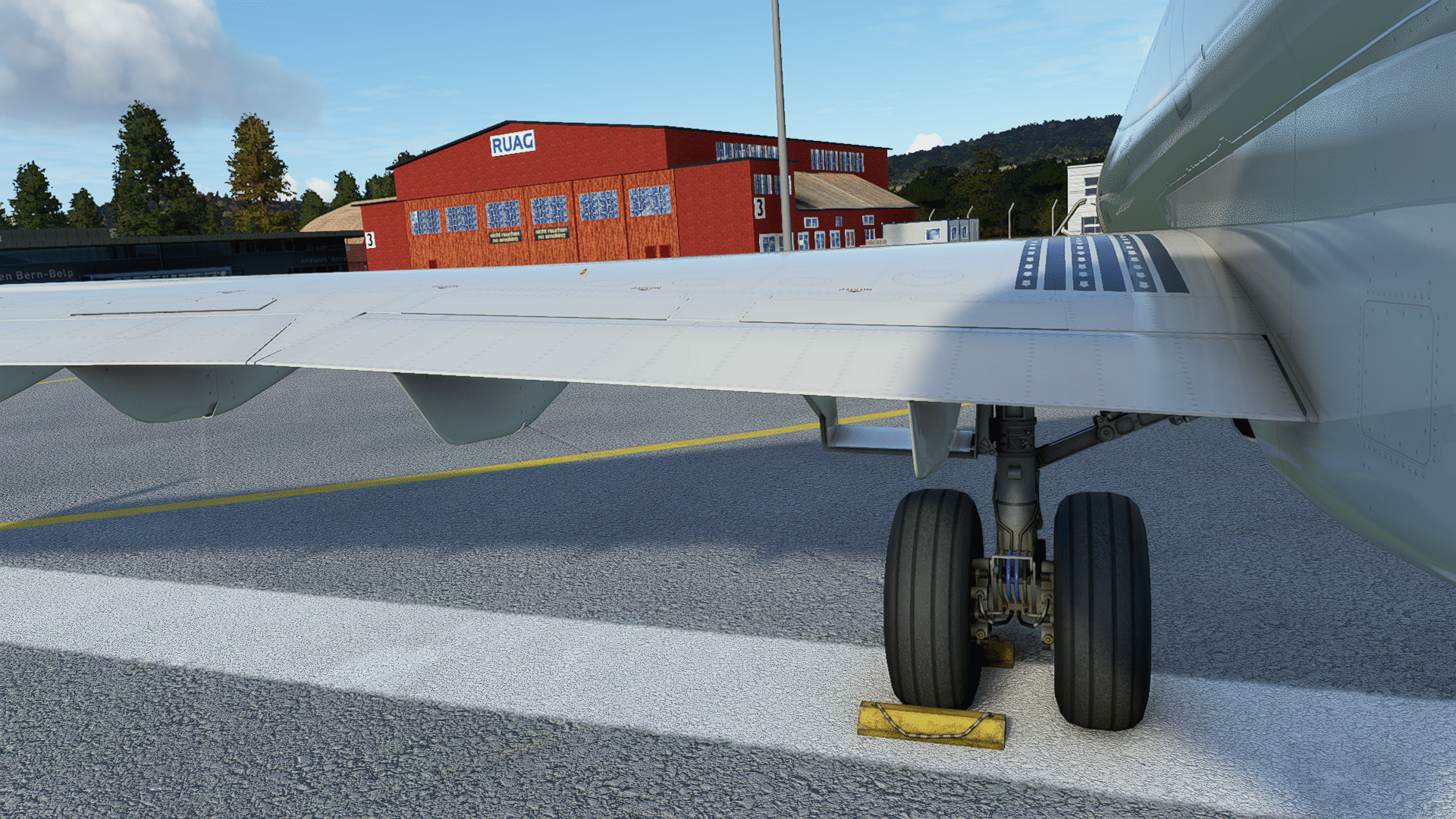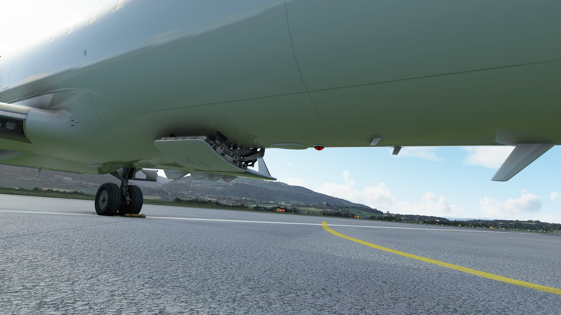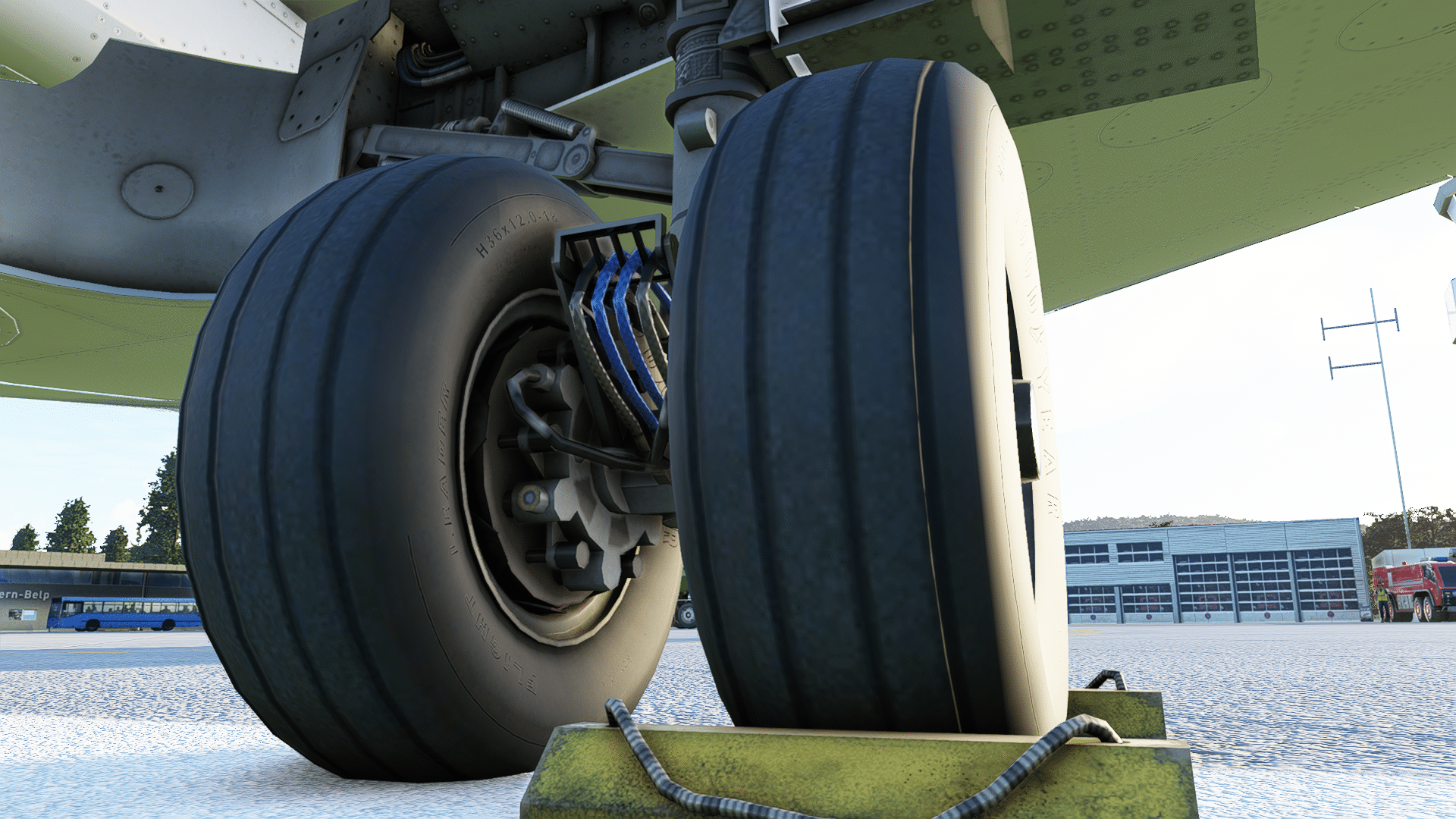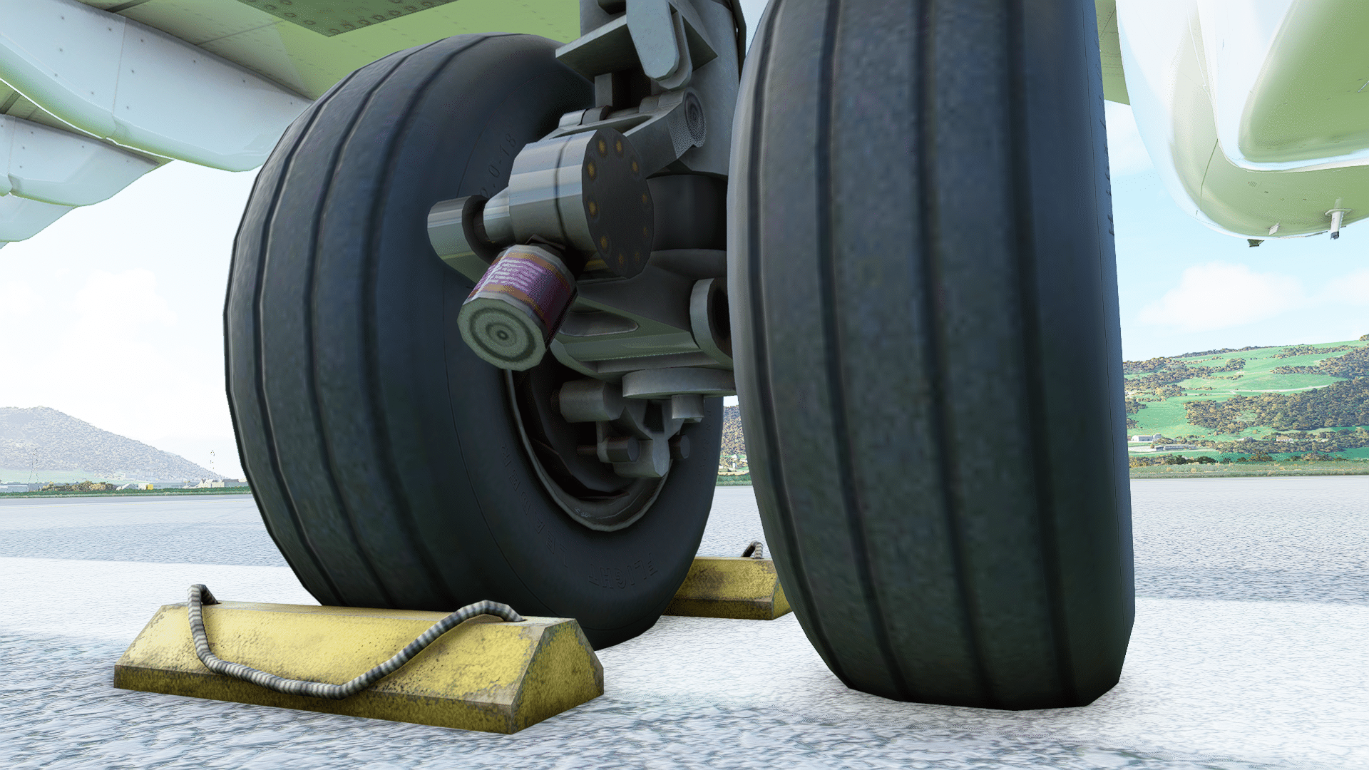 Am rechten Hauptfahrwerk gibt es nichts zu meckern, alle Leitungen, und sogar die Bremsscheiben sind dargestellt. Auch beim Blick in den Fahrwerkschacht „Daumen hoch“. So ganz aus er Nähe wird deutlich, was mein Redaktionskollege beim Ersten Eindruck mit „eckig“ gemeint hatte – die eigentlich runden Komponenten sind als Vielecke programmiert. Wenn das dann dem flüssigen Ablauf dient – gerne! Wir simulieren ja nicht die Wartung am Fahrwerk, sondern das Fliegen. Falls die Gestalter zukünftig noch detaillierter werden wollen: es gibt da einen Stift an jedem Rad, der die Abnutzung der Bremsbeläge auf einen Blick zeigt, sie gehören zum Pflichtprogramm beim Walkaround.