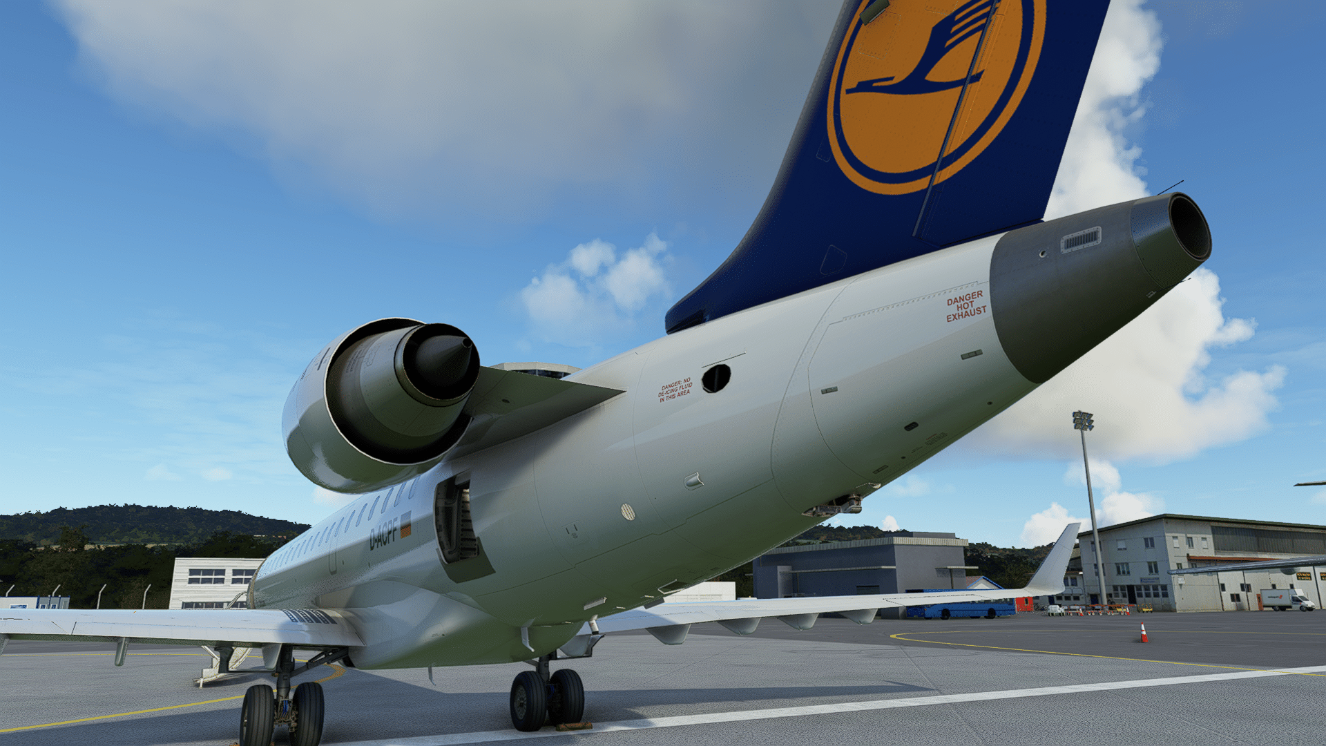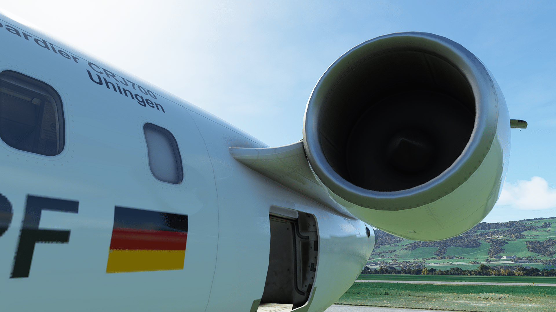 Ein Blick in die Triebwerke .. und nochmal ein enttäuschtes „Oh“…. man sieht keine Fans, sondern eine bewegte verwaschene Textur, die ähnlich wie ein laufendes Triebwerk aussieht. Wir stehen am Boden, die APU läuft zwar, aber die Triebwerke definitiv nicht. Bei großen Flugzeugen mit auffälligen Turbofans, wie den Airbussen oder Boeings, wäre das ein No-Go im MSFS. Die CRJ-Triebwerke sind so nah am Rumpf und weiter oben, oberhalb der Tragflächen, dass es kaum mal „natürliche“ Perspektiven auf die stehenden Fans gibt, insofern ist das Weglassen kein ganz schwerer Fehler. Angesichts der sonst so detailverliebten Umsetzung verwundert die Sparsamkeit an dieser Stelle aber doch, das passt nicht ins Bild. Die Jetpipe sieht wieder gut aus.