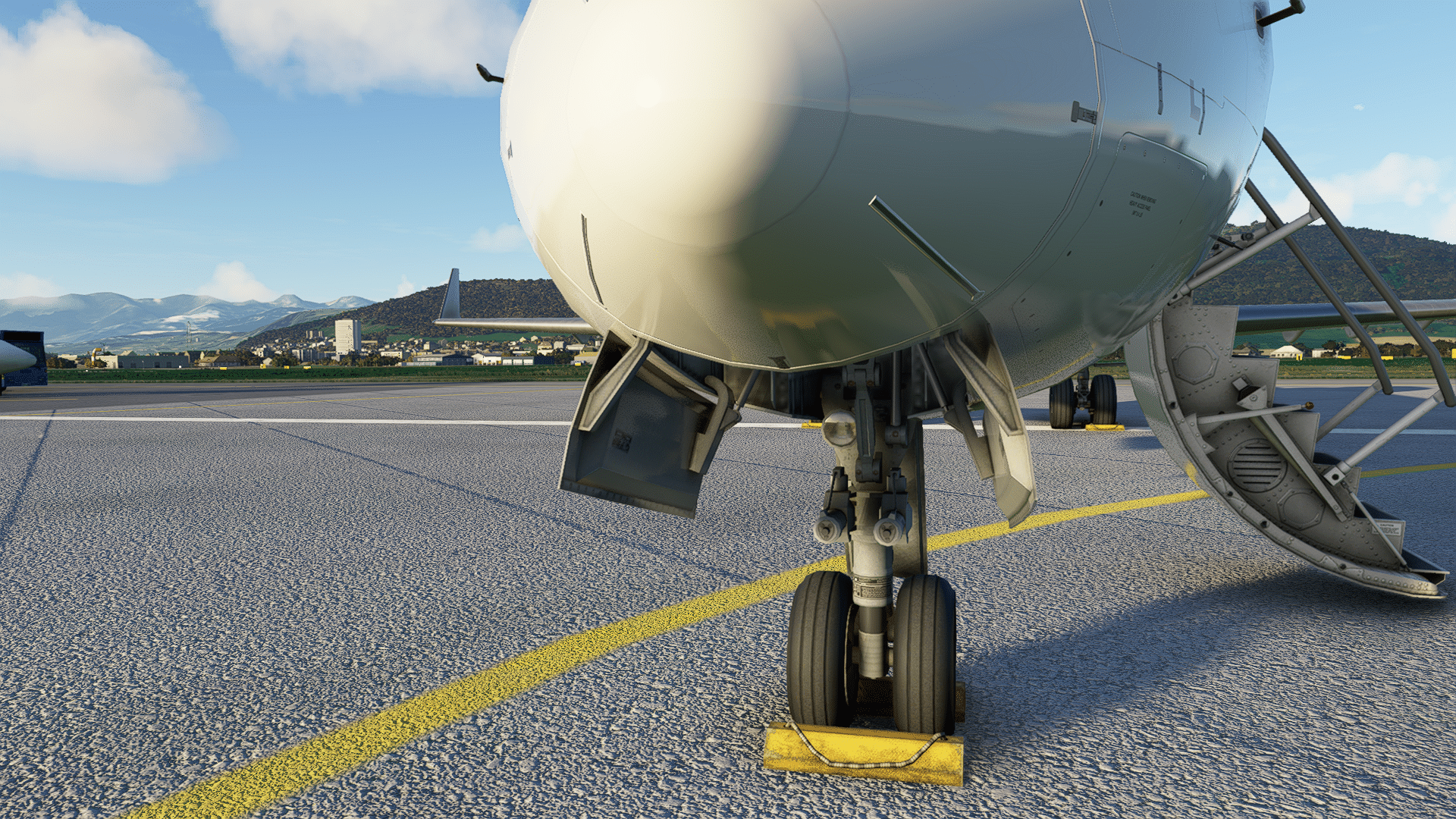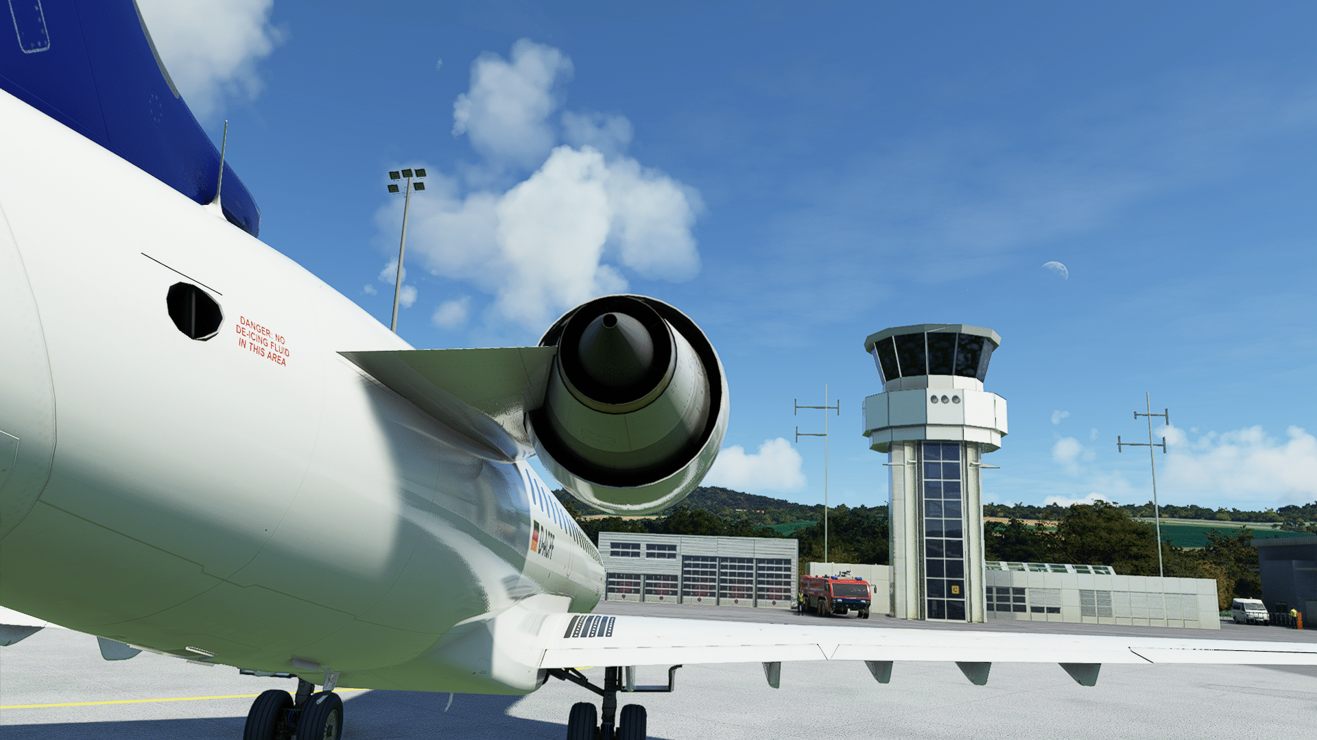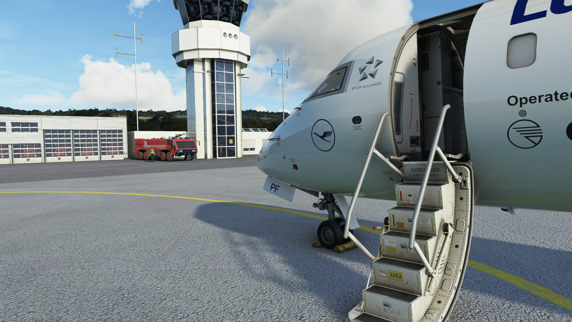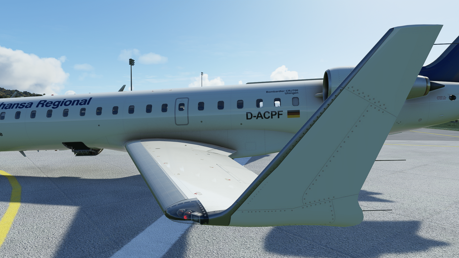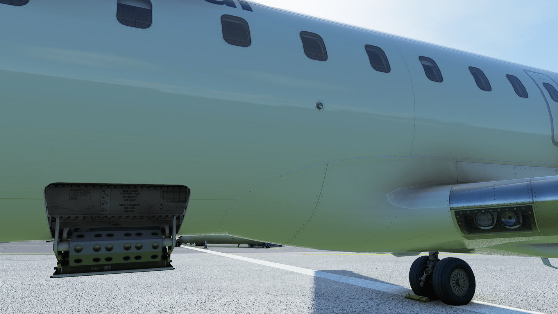 Türe auf (klasse, das geht bei den Standard-MSFS-Jets ja nicht „einfach so“) und raus aus dem Cockpit … die feinen Details der Treppe machen schon mal gute Laune. Die Inspektion an der Nase auch – alle Staurohre, Statics, Seviceklappen, AoA-Sensoren, Eisdedektoren, Anschlüsse sind gestaltet, die Beschriftungen hoch aufgelöst, ebenso das Bugfahrwerk, da ist alles dran, was dran gehört. Scheibenwischer, Lichter, auch Antennen und Auslässe unter dem Bauch, die Details der Gepäcklukenkenklappe, der Tankklappe, jeder Nietenzähler ist begeistert. Alexander Gerst (deutscher ISS-Astronaut) wurde vor einem Studium der Luft- und Raumfahrttechnik gewarnt – er würde den Rest des Lebens dann Klotürenklinken für Airbusse entwerfen. So ähnlich muss es mit den Landelichtern der CRJ gewesen sein – die Nachgestaltung im Aerosoft-Modell enthält sogar die hinter Windschutzglas versteckten Warnschilder vor Hochspannung. Was nicht funktioniert (ein MSFS-Bug, weil mir das auch schon an der MB399 auffiel?): dass eingeschaltete Lichter auch aus der Nähe leuchten. Man sieht die Leuchteffekte am Flugzeug und am Boden, aber keine hellen Scheinwerfer, die bleiben „aus“, erst ab einer Entfernung leuchten sie auch.