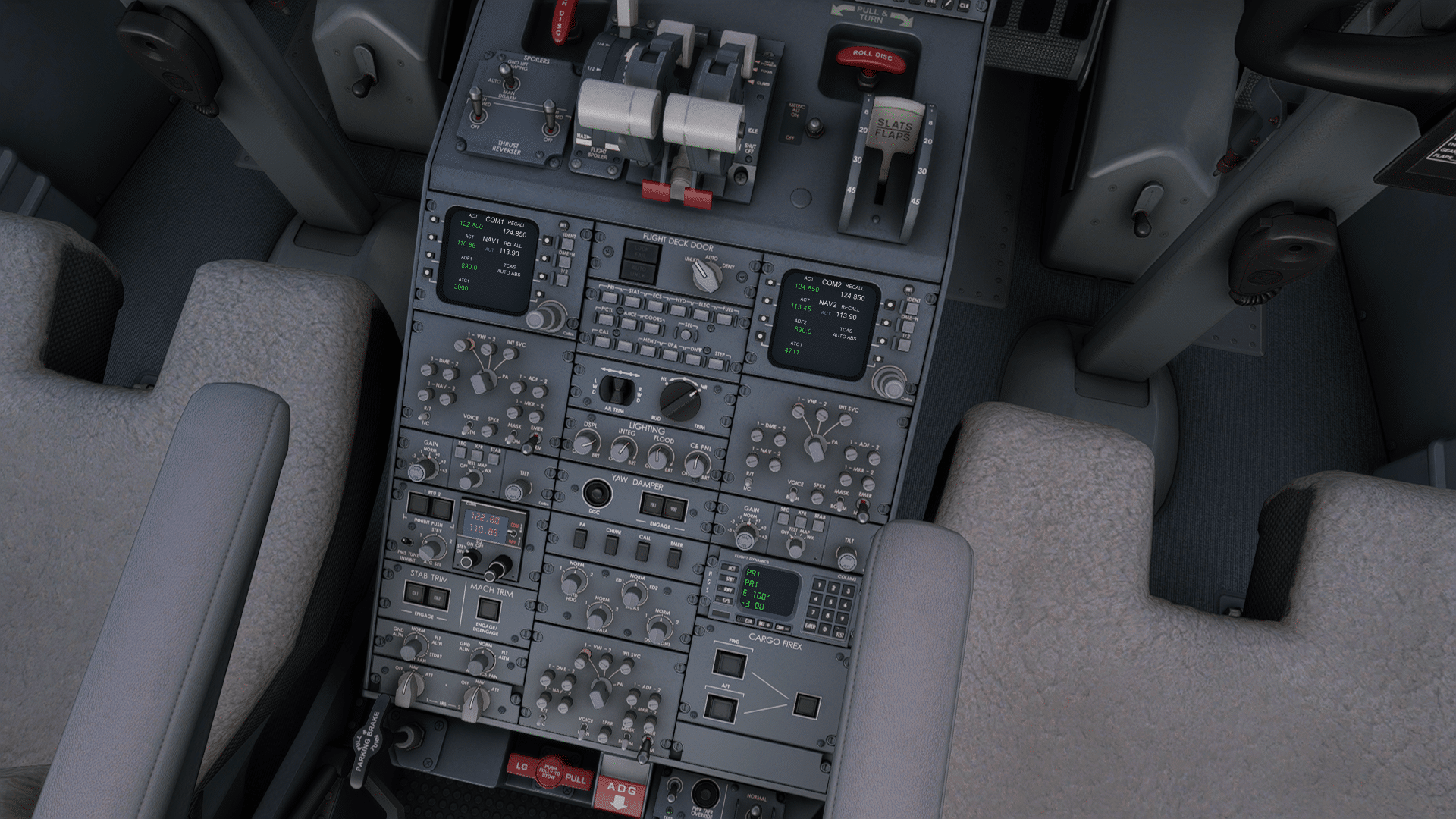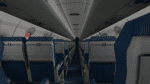 Schauen wir uns innen um. Ein kurzer Blick – ja, nicht nur die Frachträume, auch die Passagierkabine ist modelliert, wenn auch einfach, one class fits all. Aber immerhin. Für die Simulation als Pilot im Flightdeck irrelevant, man will ja ganz vorne sitzen. Andere Anbieter hatten sogar Flugzeugtoiletten (mit Funktionen) modelliert, als Witz ok, aber wer braucht sowas? Hier hat Aerosoft meiner Meinung an der richtigen Stelle gespart.