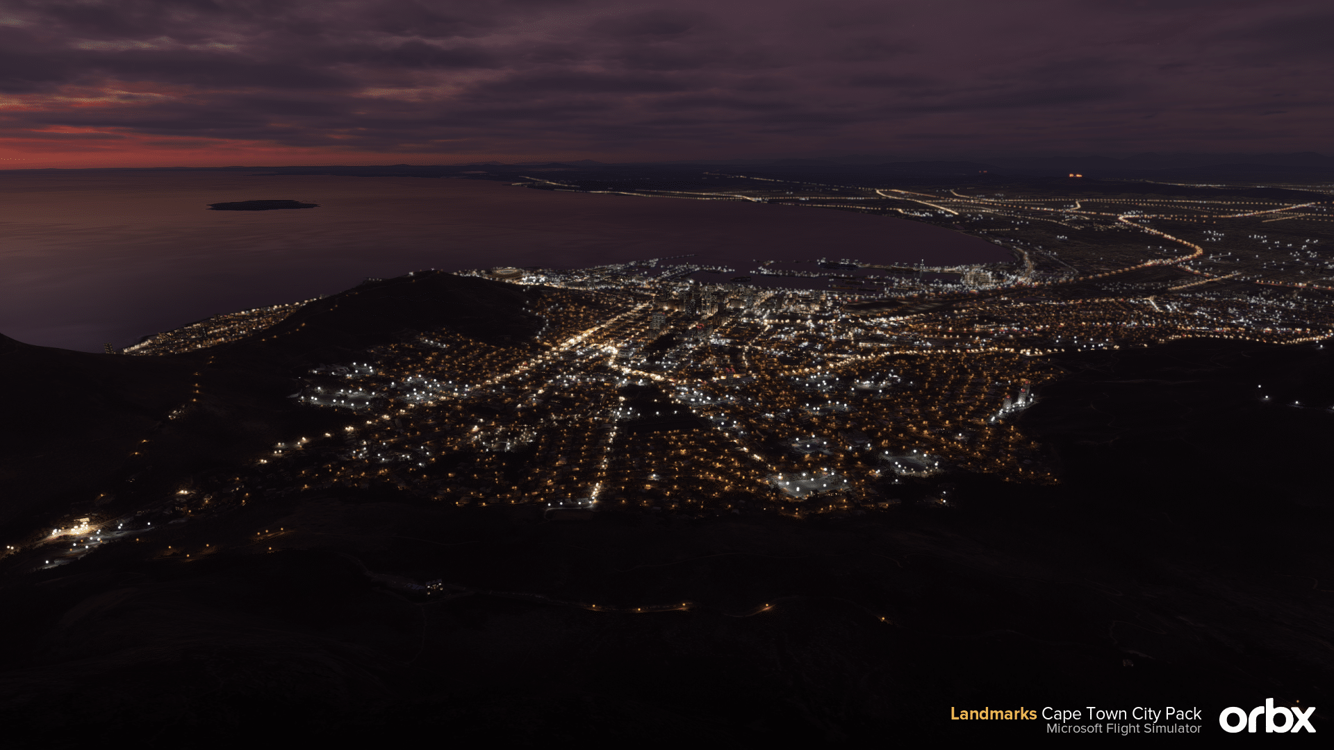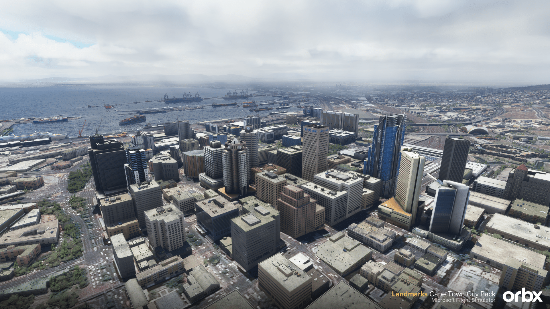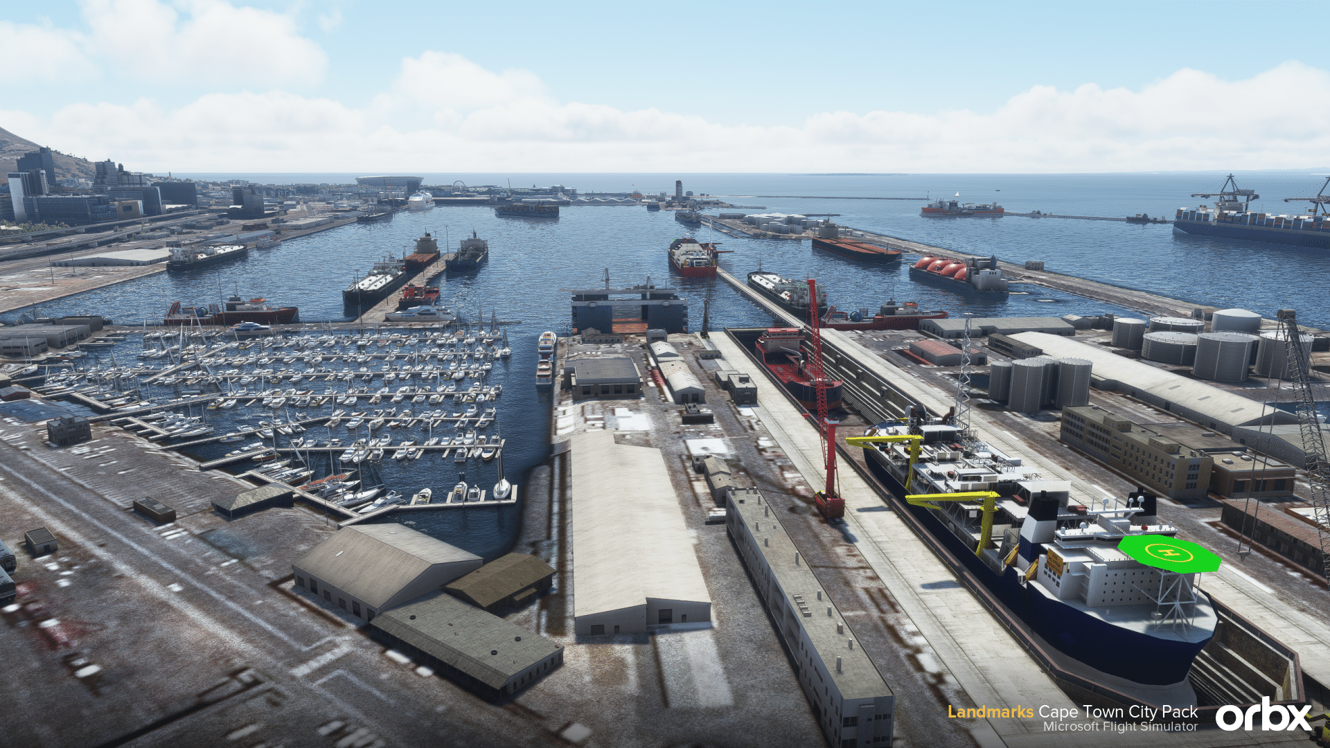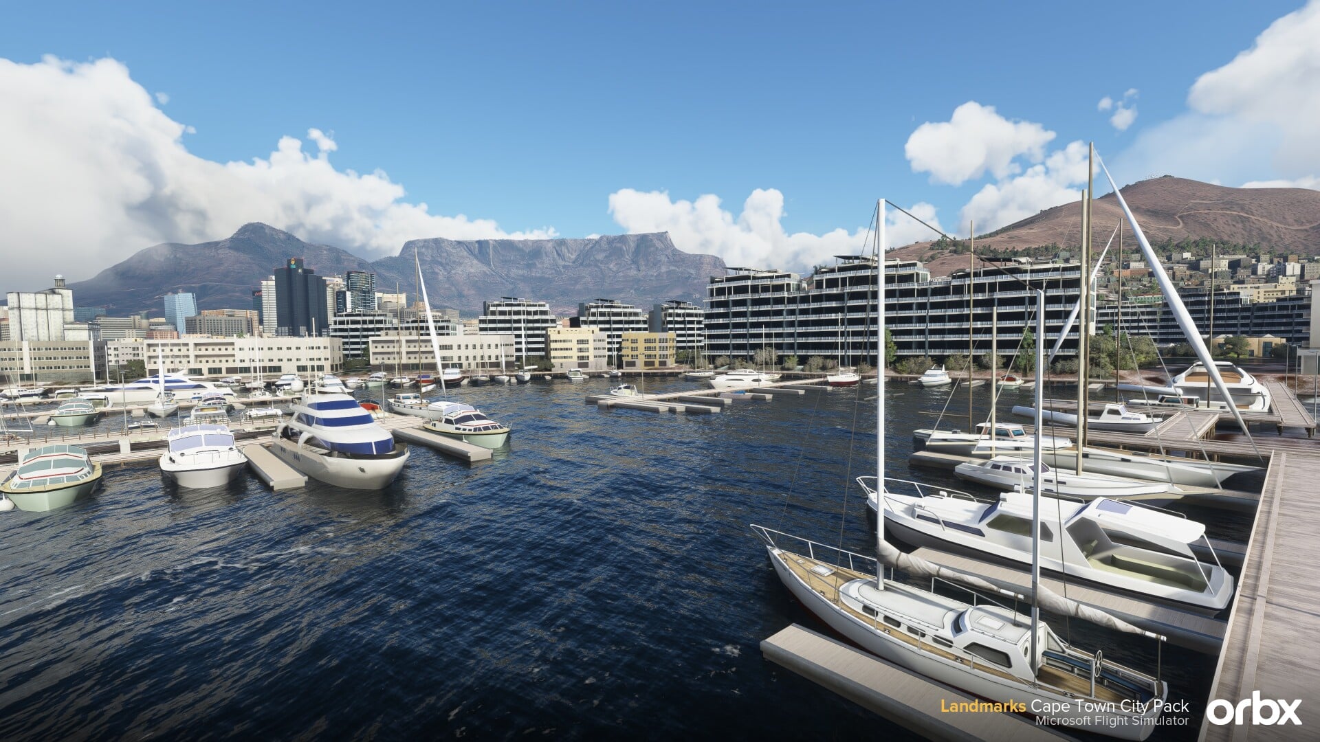 Cape Town Int’l (ICAO: FACT) liegt 10 Meilen südöstlich der Stadt, aber es gibt auch mehrere kleinere Flugplätze in der Umgebung, wie Ysterplaat AFB, Stellenbosch Aerodrome, Morning Star Airfield und zwei kurze Landebahnen auf Robben Island, um die Region mit einem GA-Flugzeug zu erkunden. Für Hubschrauberpiloten gibt Orbx zudem eine Reihe von gehärteten Hubschrauberlandeplätzen in der Stadt sowie auf Schiffen im Hafen an.