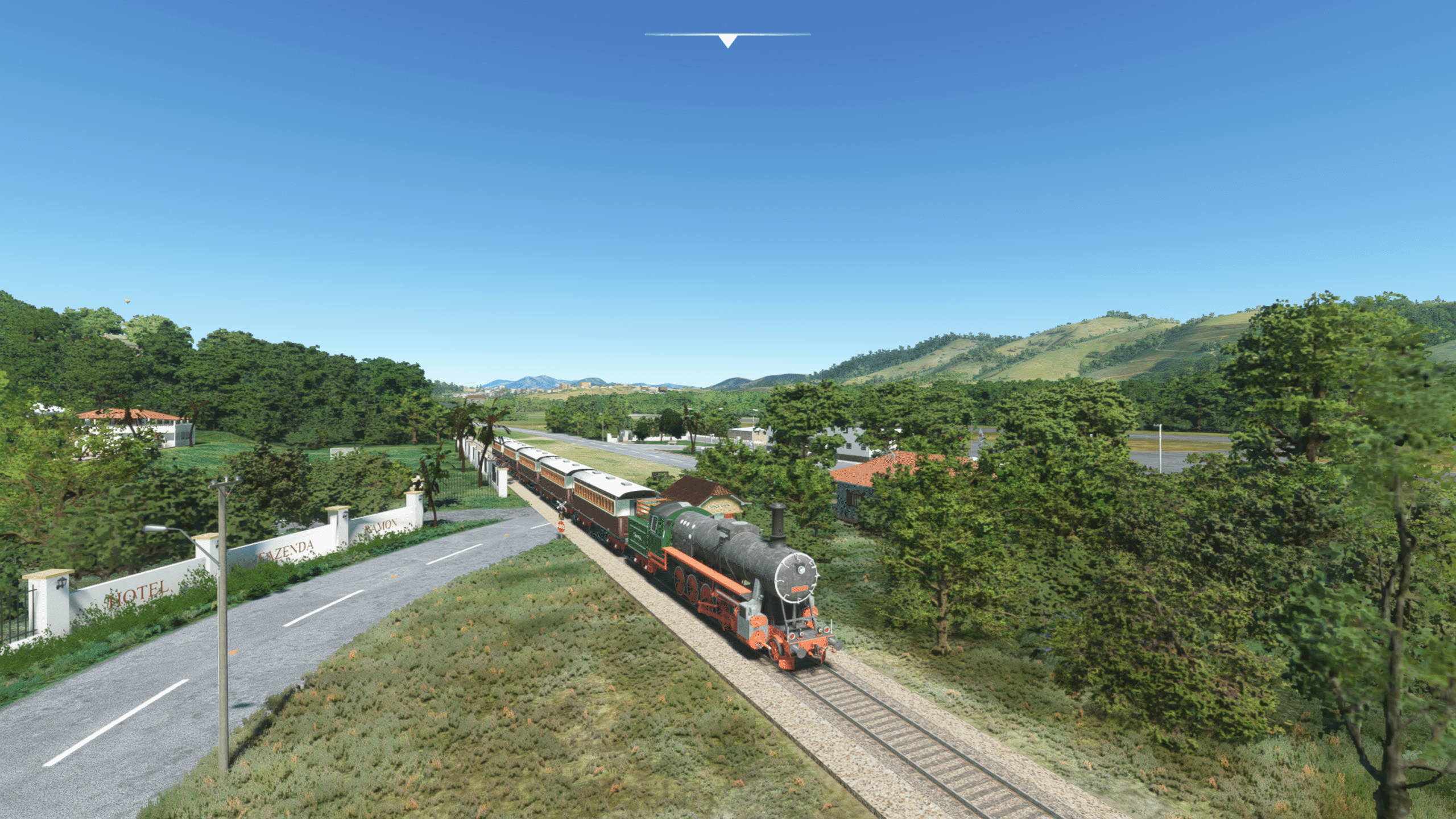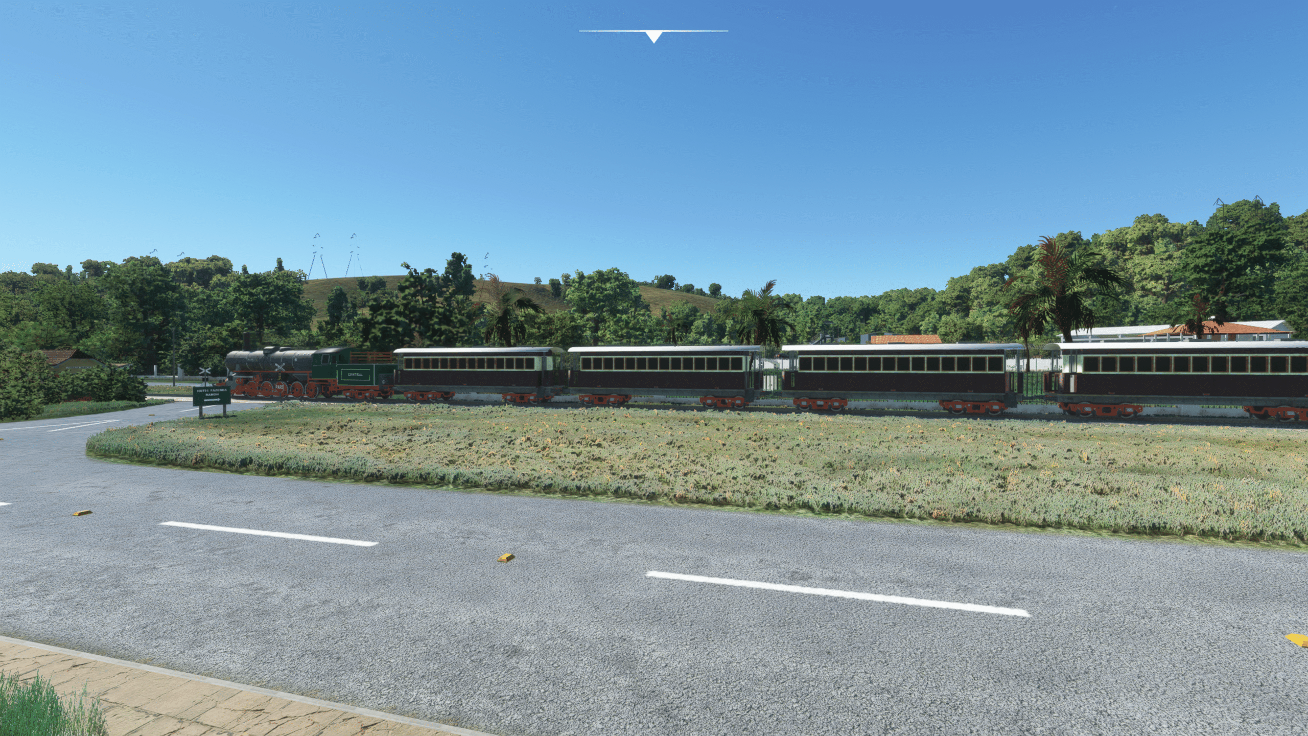 Direkt neben dem Flughafen liegt das Farmhotel, und die Dampfeisenbahn fährt (animiert) direkt am Flughafen vorbei, es gibt also im Anflug einiges zu sehen. Das rollende Material der Dampfbahn scheint mir nicht zu den Bildern zu passen, die ich im Netz finde, aber es sieht zumindest plausibel aus.