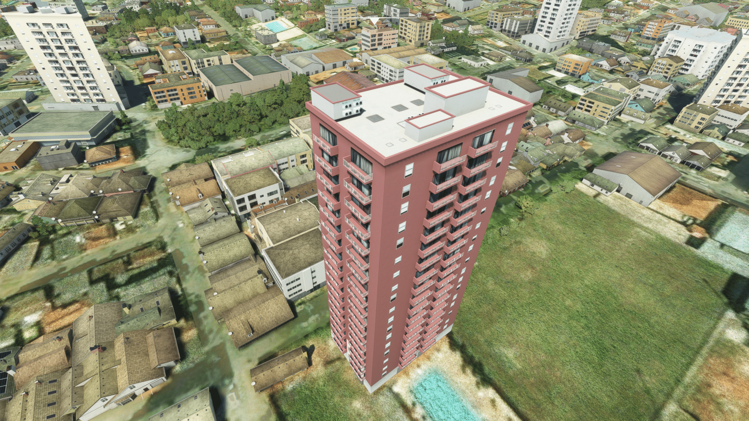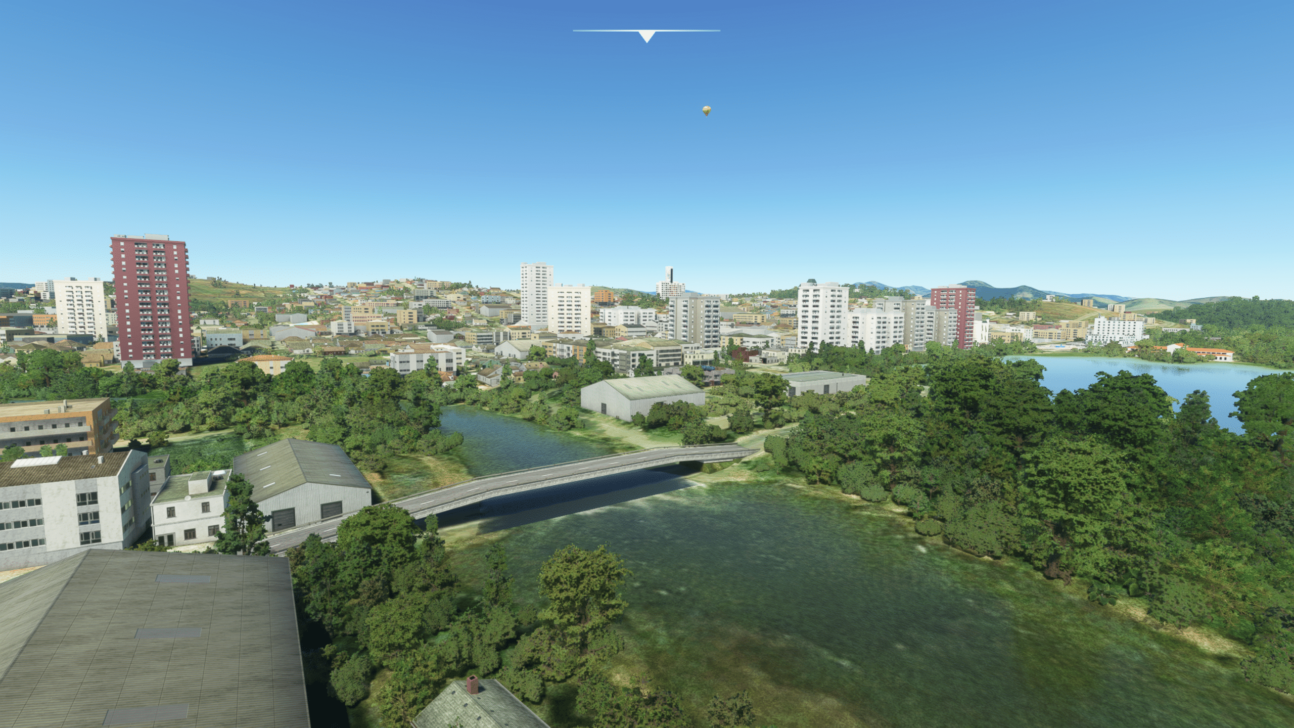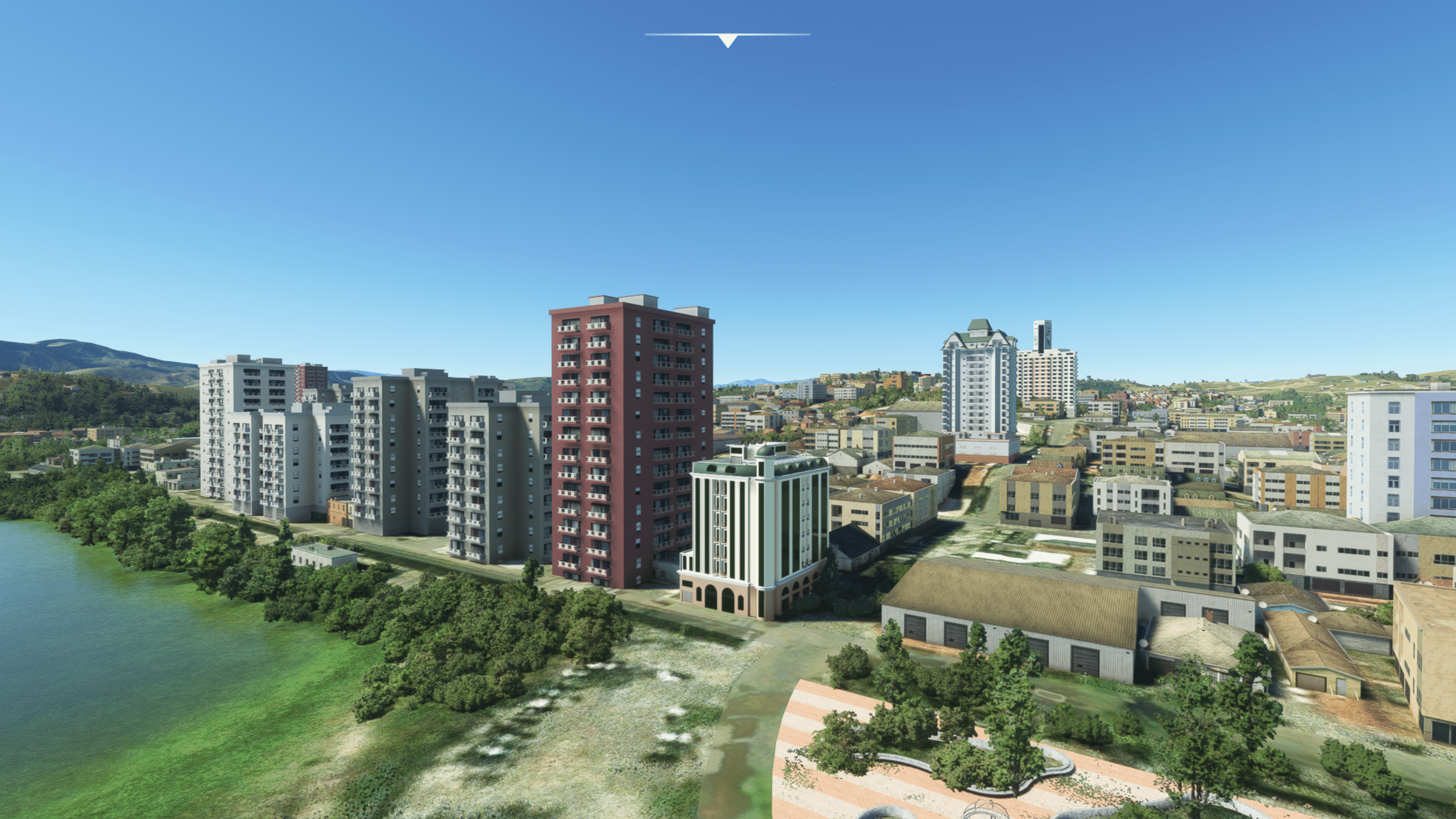 Die Stadt ist dicht gepackt mit Wohn- und/oder Hotelhochhäusern, es gibt einen Fluss und dazwischen auch den netten Park zu entdecken. Wie gut das getroffen ist kann ich nicht sagen, es sieht zumindest nach Wikipedia plausibel aus. Und ist natürlich ein riesiger Fortschritt gegenüber dem Standard-MSFS, der hier nur mit AI-generiertem Autogen ausgestattet ist.