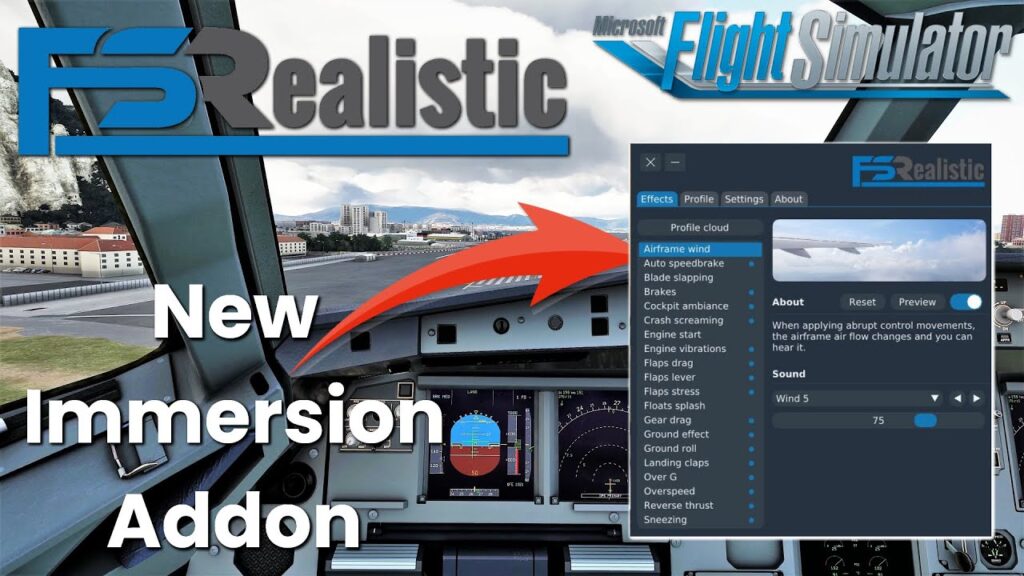 Windshield wind: In der Realität relevant, im MSFS sehr dezent, mit FSRealistic endlich deutlich und eines der wirklich guten Features – die auch bei „Airframe wind“ verwendeten sechs Arten Strömungsgeräusche, jetzt recht prägnant mit zunehmender Geschwindigkeit verstärkt hörbar.