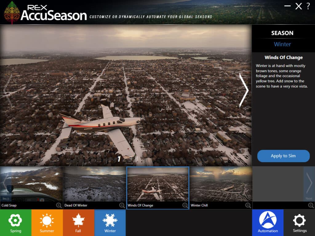 Das 25 US-Dollar teure Tool ändert die Darstellung der Vegetation – bunte Bäume im Herbst, kahle Wipfel im Winter, zarte Knospen im Frühling. Das vielleicht spannendste Feature für Faule: Im automatischen Modus nimmt AccuSeason die Änderungen ganz alleine vor, ausgerichtet am eingestellten Datum und der Region, in der man fliegt. Während im Oktober also Indian Summer in Neuengland ist, erlebt Melbourne einen warmen Frühlingstag.