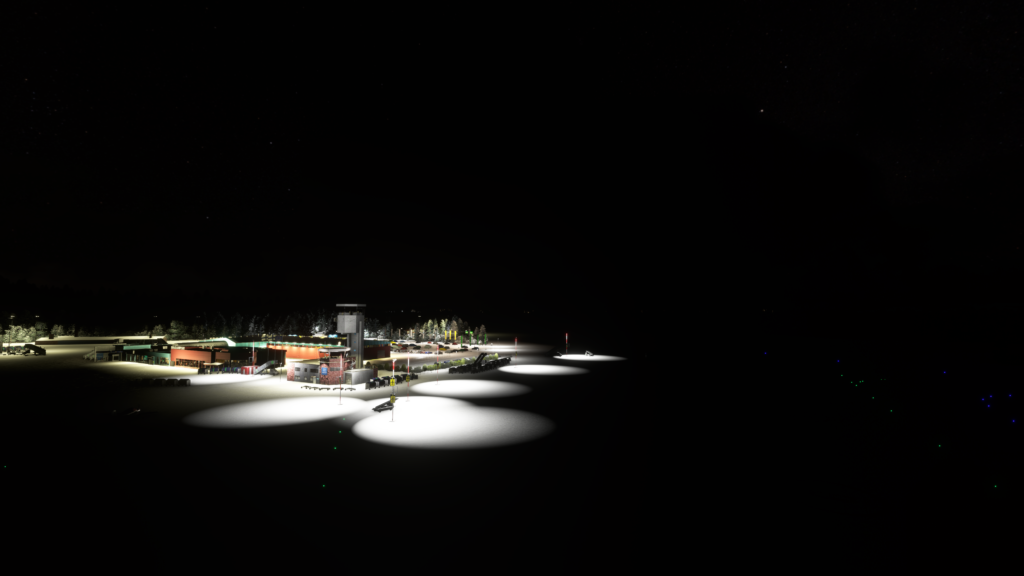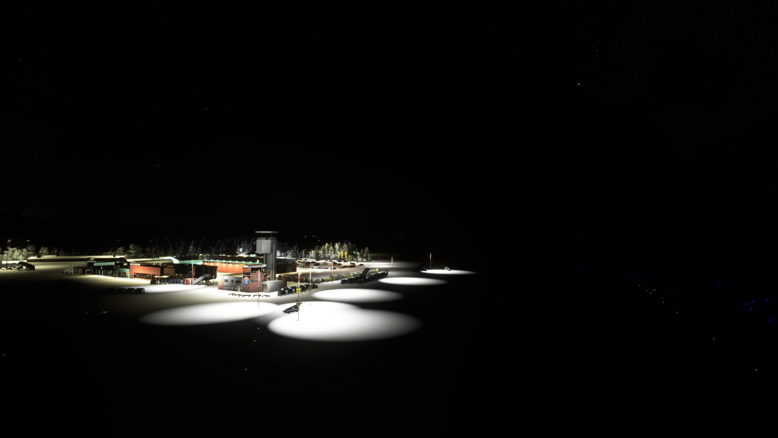 Für meinen Flug nach Ivalo habe ich mir eine kurze Strecke von Vaasa (Default-„handcrafted“-Flughafen des MSFS) nach Ivalo ausgesucht, Echtzeit und Echtester, und zwar kurz nach Weihnachten gegen 12:30. In Vaasa scheint noch etwas die Sonne, aber bei der Landung in Ivalo gegen halb zwei deutscher Zeit (Ortszeit: 12:30!) ist es schon stockdunkel. Der Endanflug führt mich direkt über die wenigen Lichter der Stadt Ivalo. Bei der Ankunft am Gate stören mich aber die gleißenden Lichter am Vorfeld. Das erscheint mir doch viel zu hell. Und das ist auch gleich mein erster Kritikpunkt.