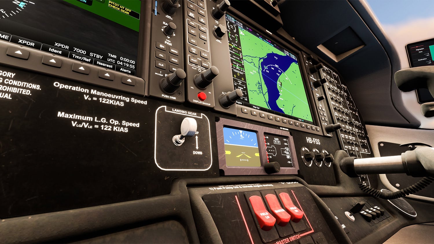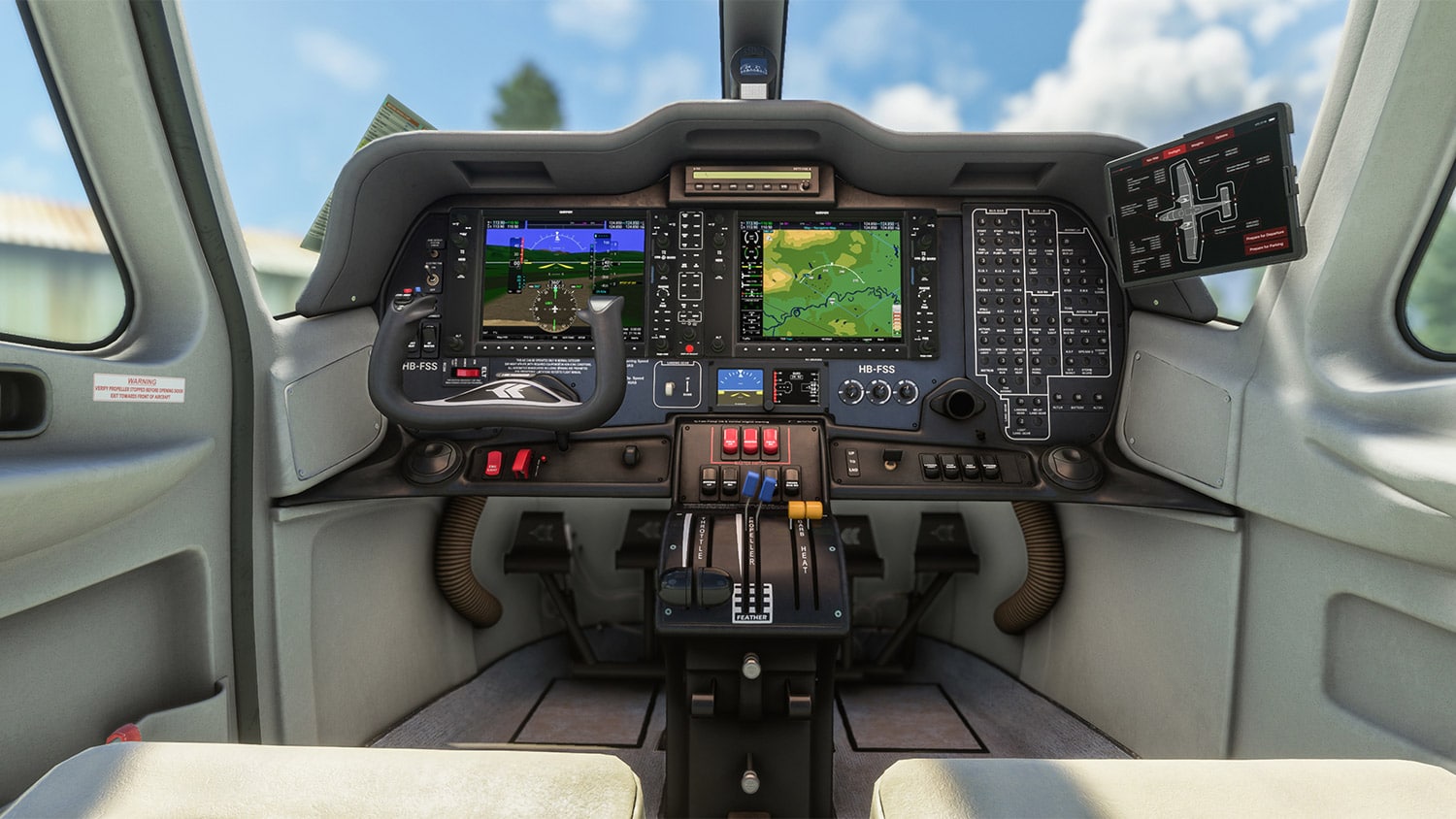 - Detailliertes 3D-Cockpit mit funktionalem G1000-Glascockpit und Papiercheckliste