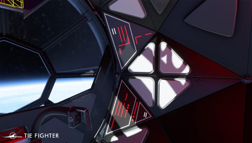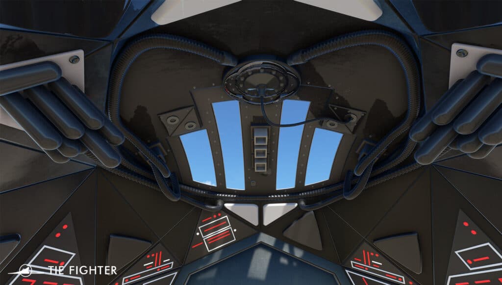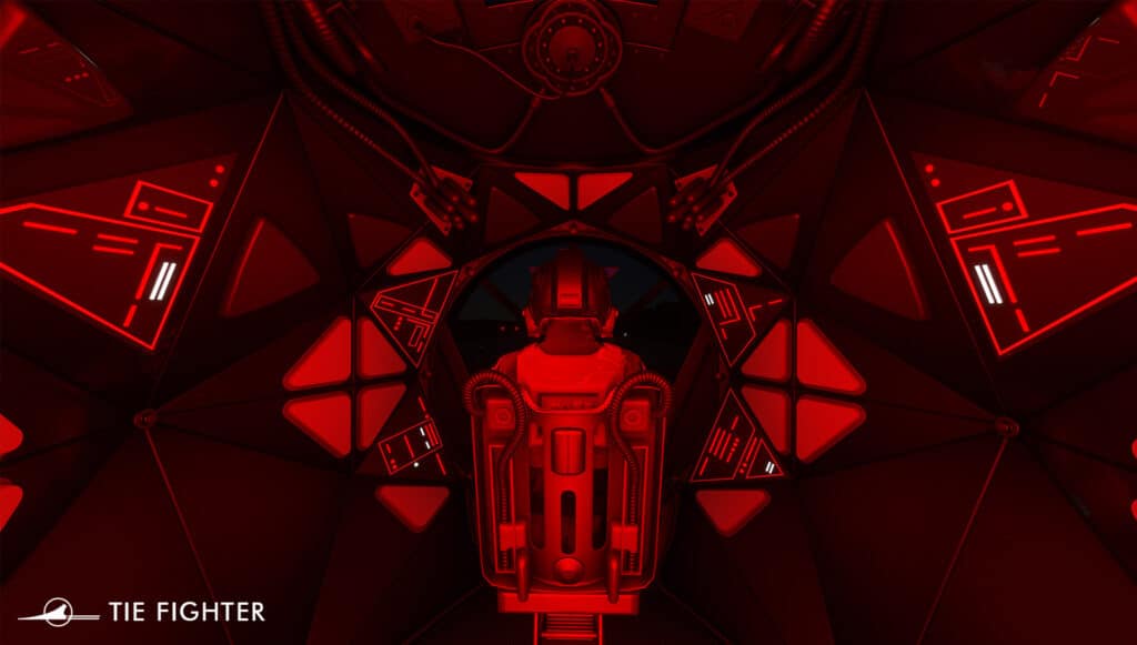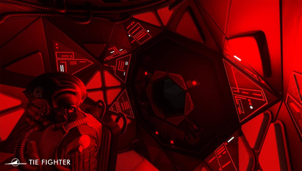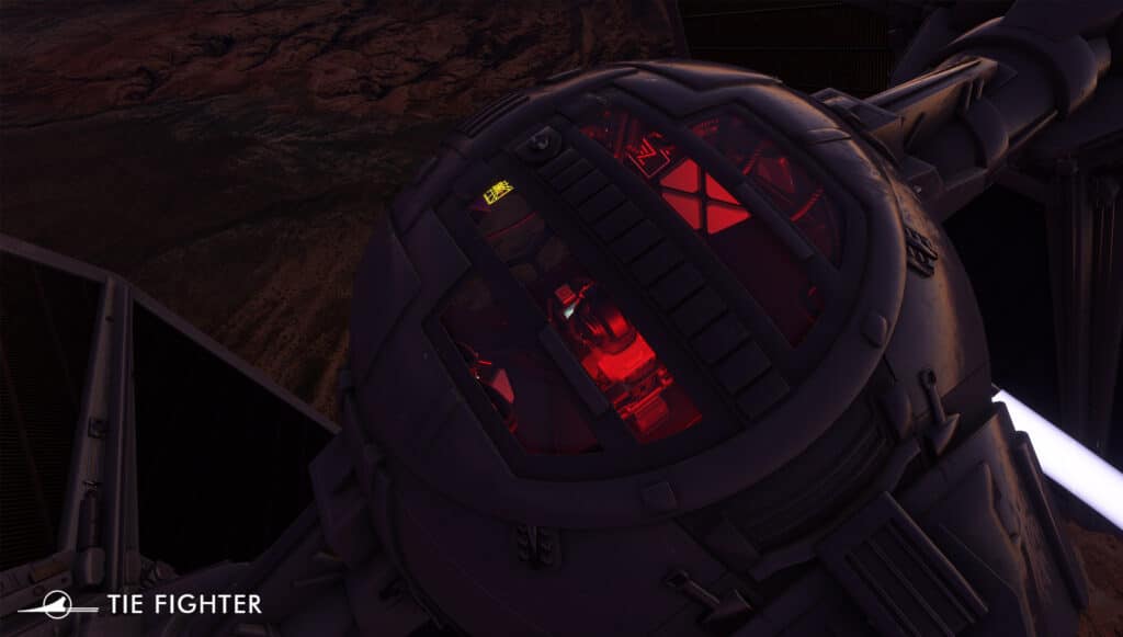 - Cockpit mit 3D-Fenstern und imperialem TIE-Piloten