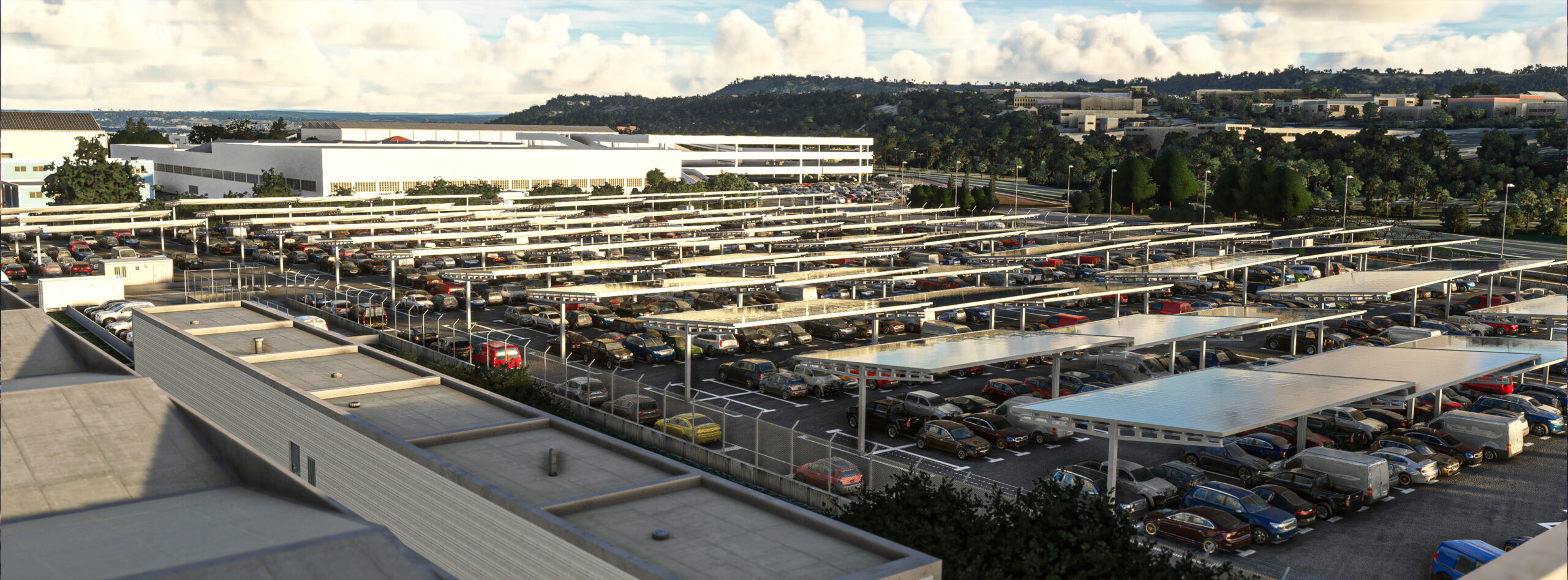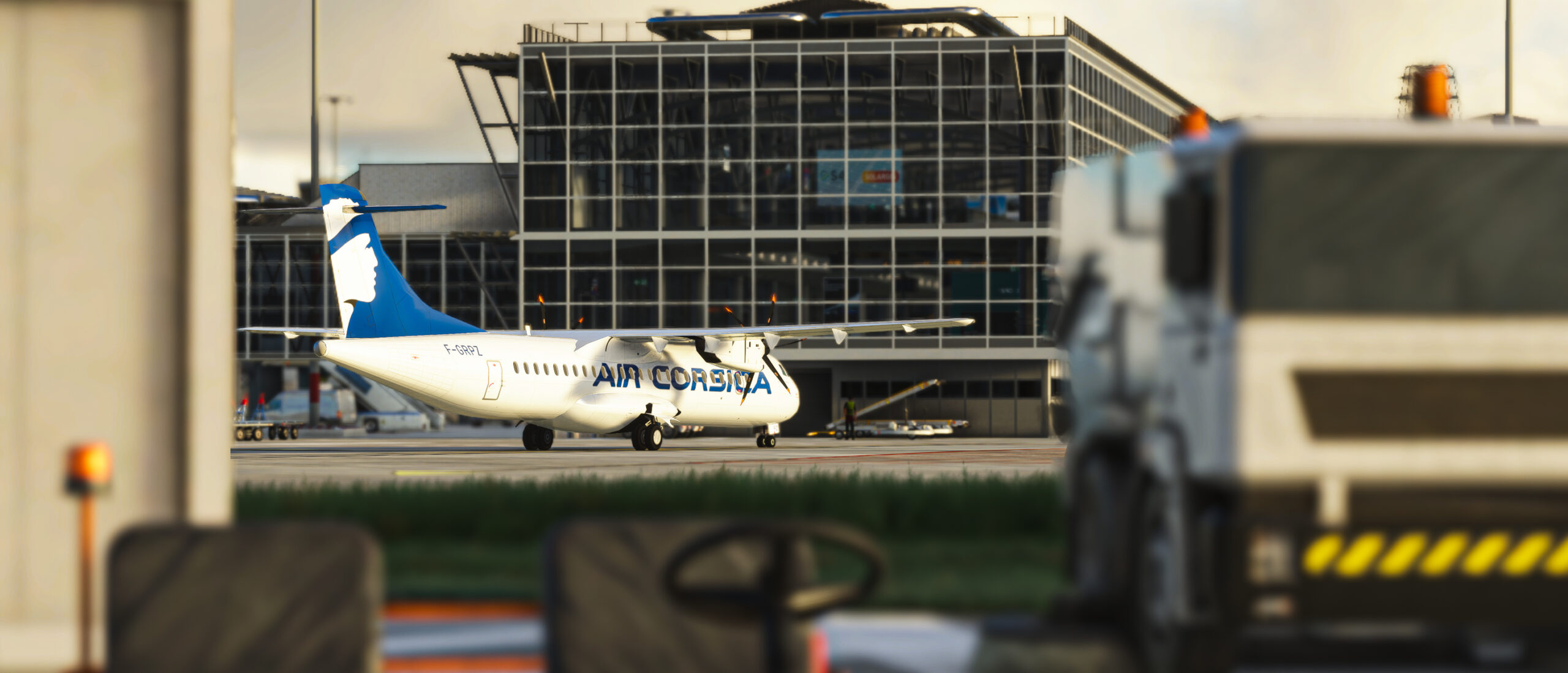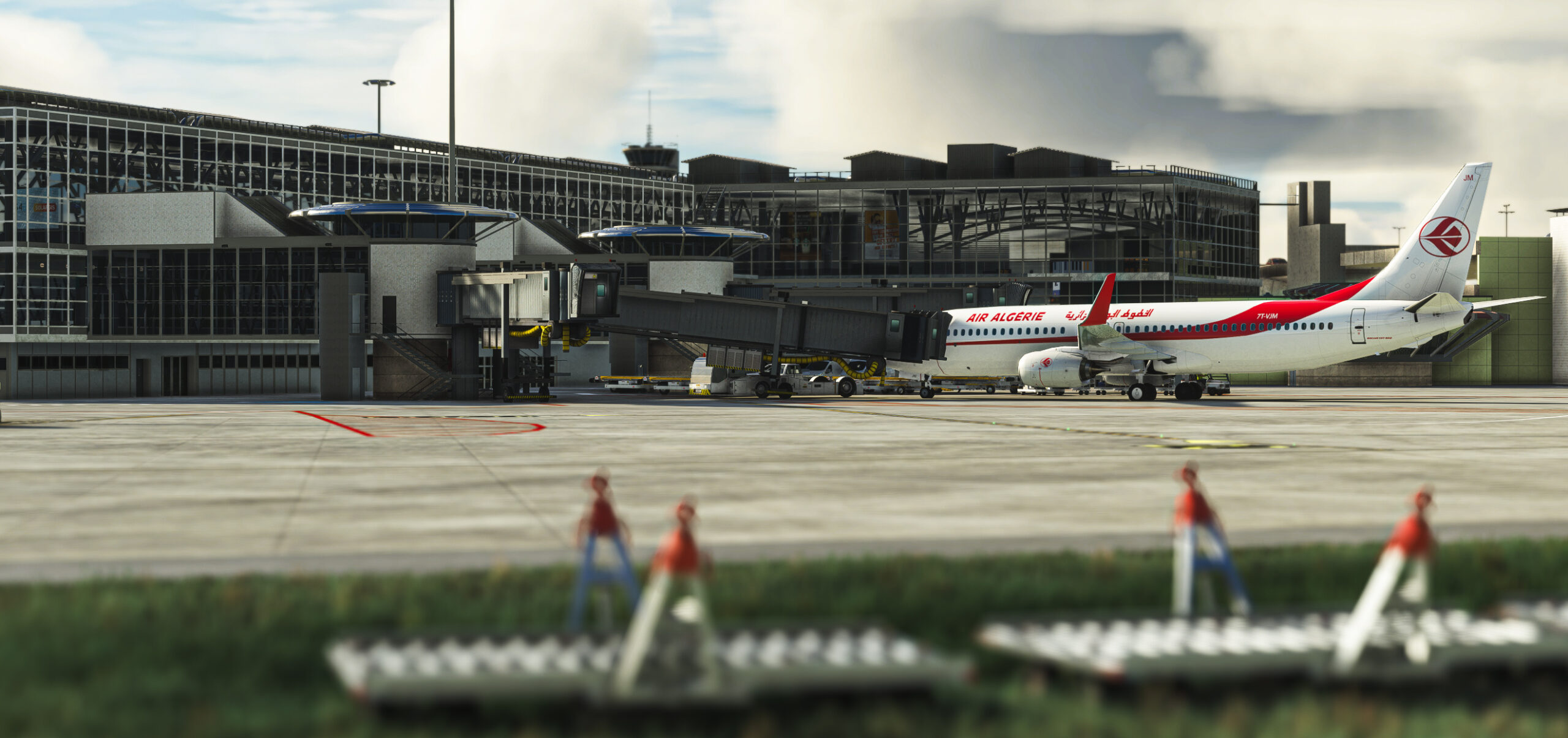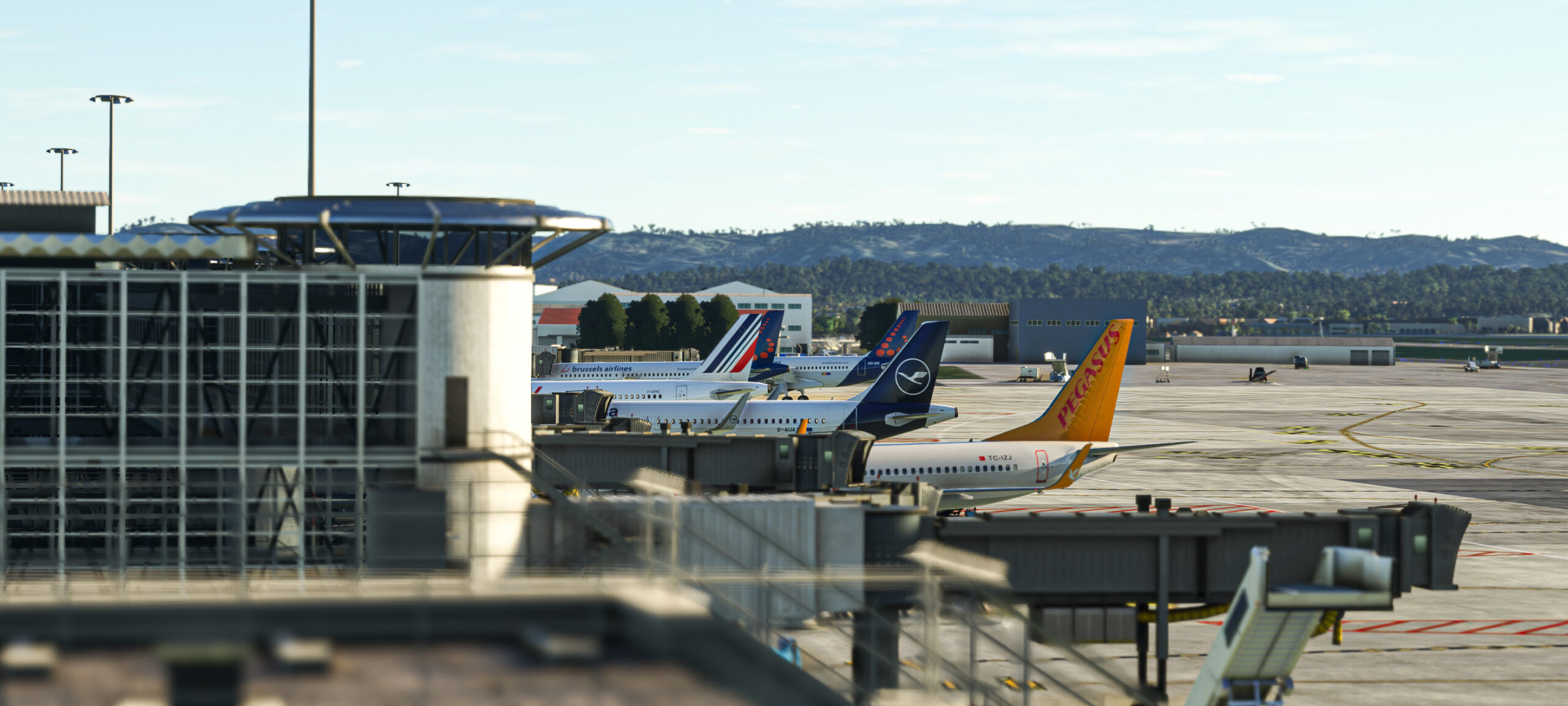 - Detaillierte Gebäude: Das Terminalgebäude, die Hangars und andere Einrichtungen auf dem Flughafengelände sind hochdetailliert modelliert und mit hochauflösenden Texturen ausgestattet.