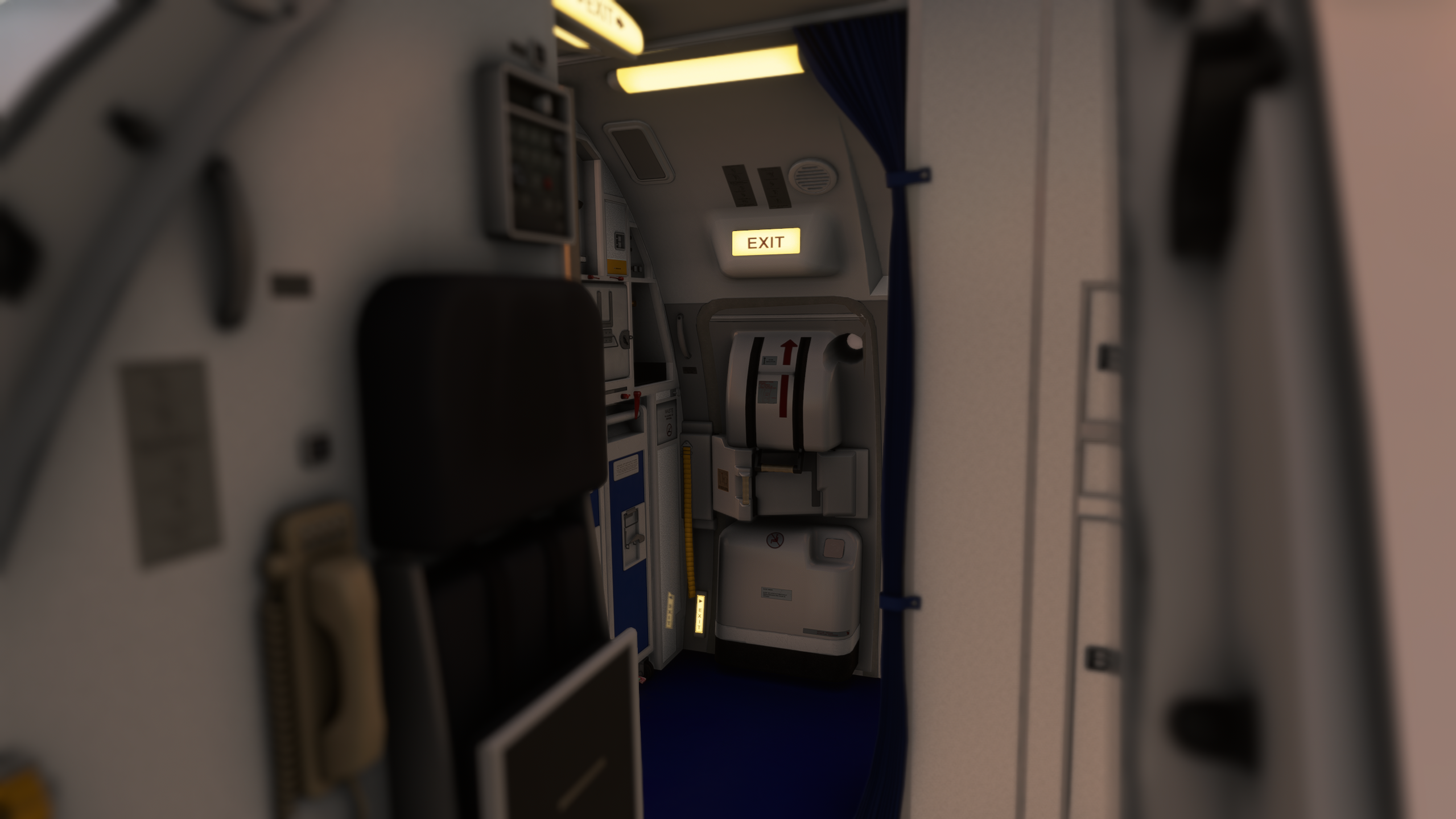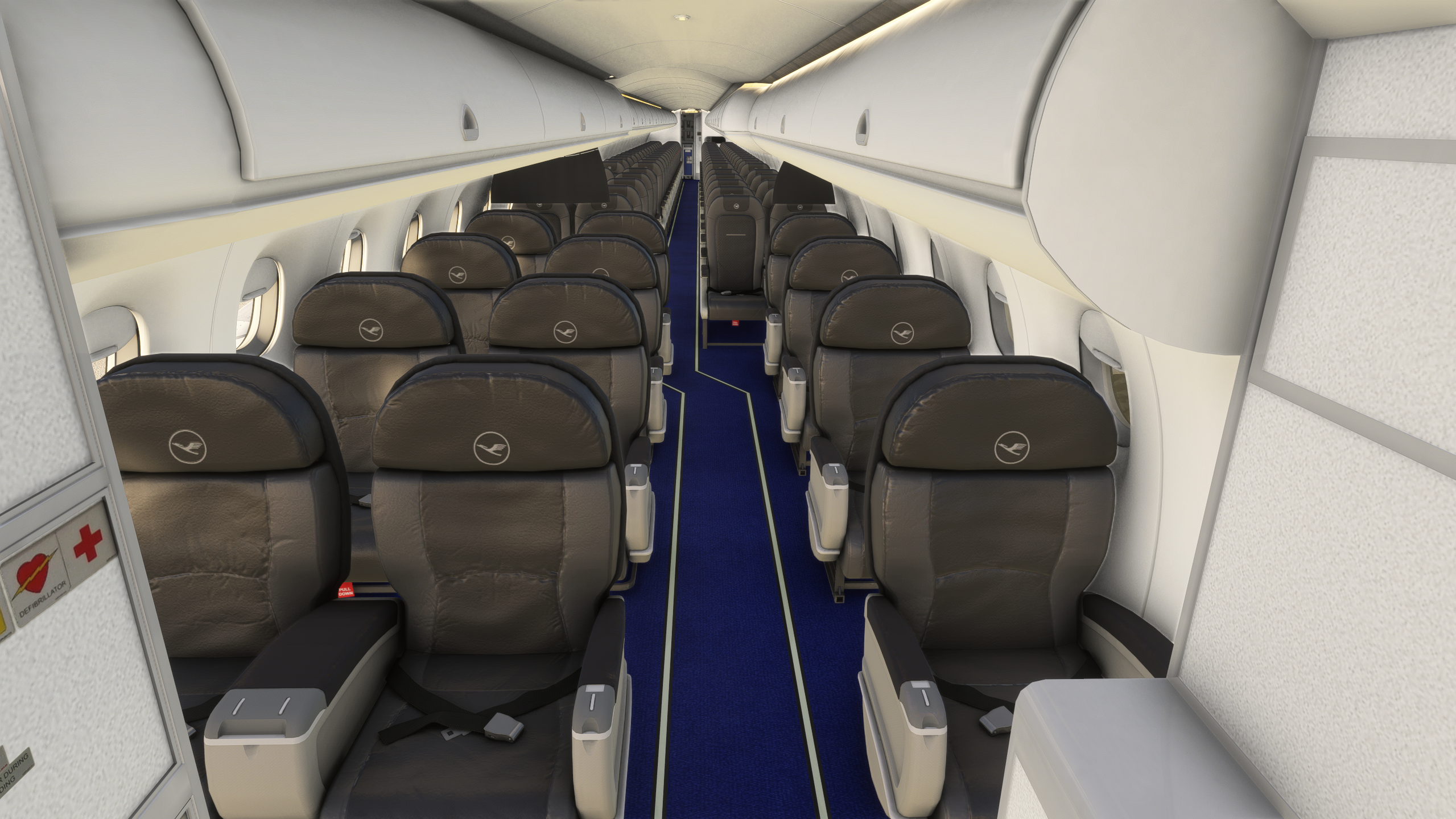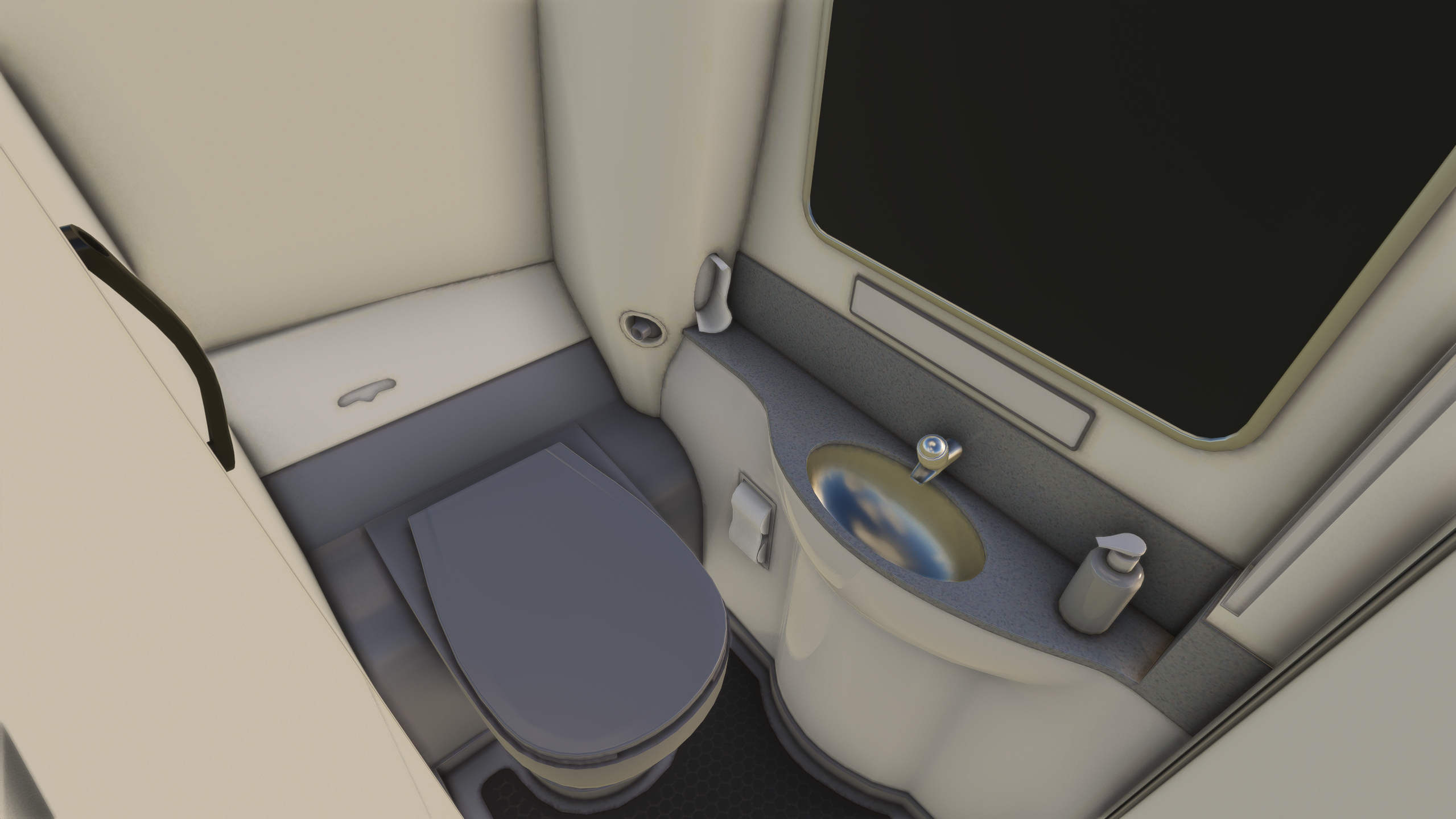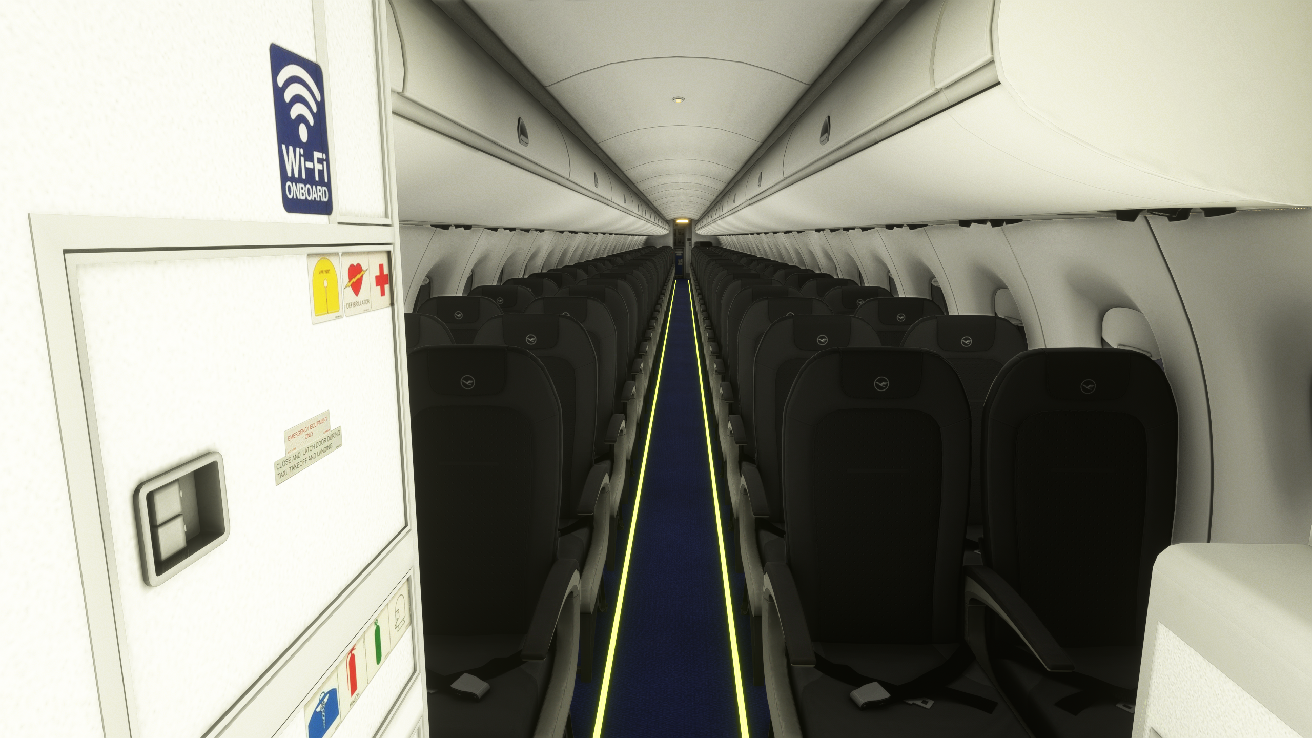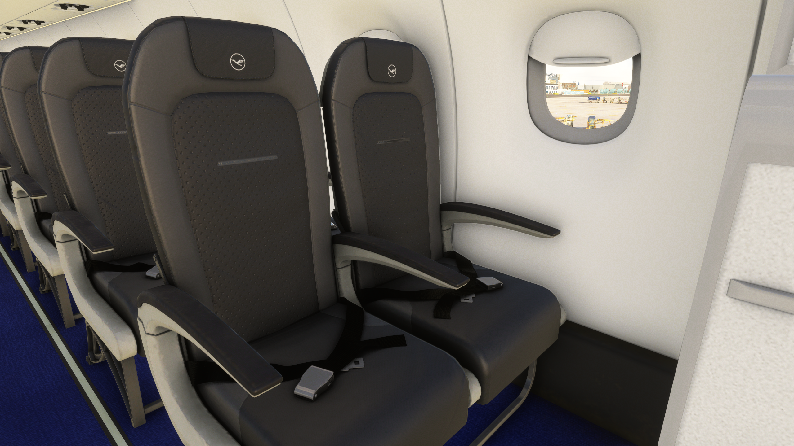 Auch bei der Kabine würden keine Mühen gescheut. Eine komplett aus modellierte Kabine wird dem Flieger beigelegt. Die Kabine wurde in den Flieger klasse integriert und hat viele coole Optionen bekommen. So lässt sich je nach Operator die Kabine umstellen. 3 Optionen werden angeboten. Einmal eine etwas geräumige Kabine mit Business-Class, einmal eine ECO-geräumige Kabine und eine Low-Cost Kabine, wo man sich so richtig schön die Beine einquetscht 🙂 . Alle Optionen sind gegeben, welche man wählt, sollte man selbst entscheiden. Außerdem wird die berühmte Flusi-Toilette mitgeliefert, die man über die normale Kamera leider nicht erreichen kann. Ein paar mehr Details wurden noch eingebaut. Die Tür lässt sich über den dafür vorgesehenen Handel öffnen und wieder schließen, und die Seatbelts sowie No Smoking Schilder wurden akkurat integriert und können über das Cockpit ein und ausgeschaltet werden. Zusammenfassend gesagt, würde auf viele coole Details geachtet, und ein cooles Erlebnis konnte geschaffen werden. Die Texturen sehen auch klasse aus.