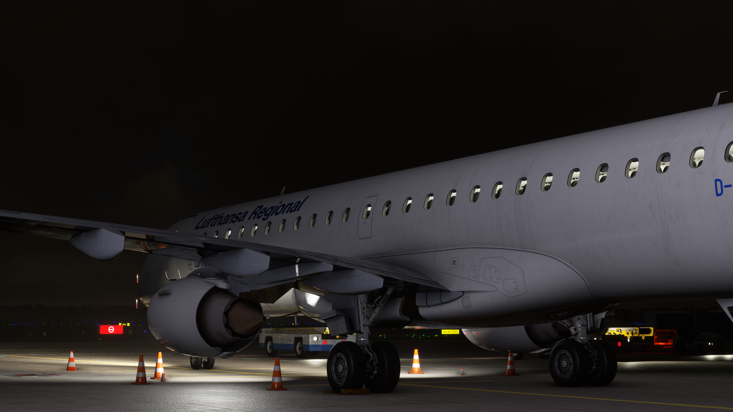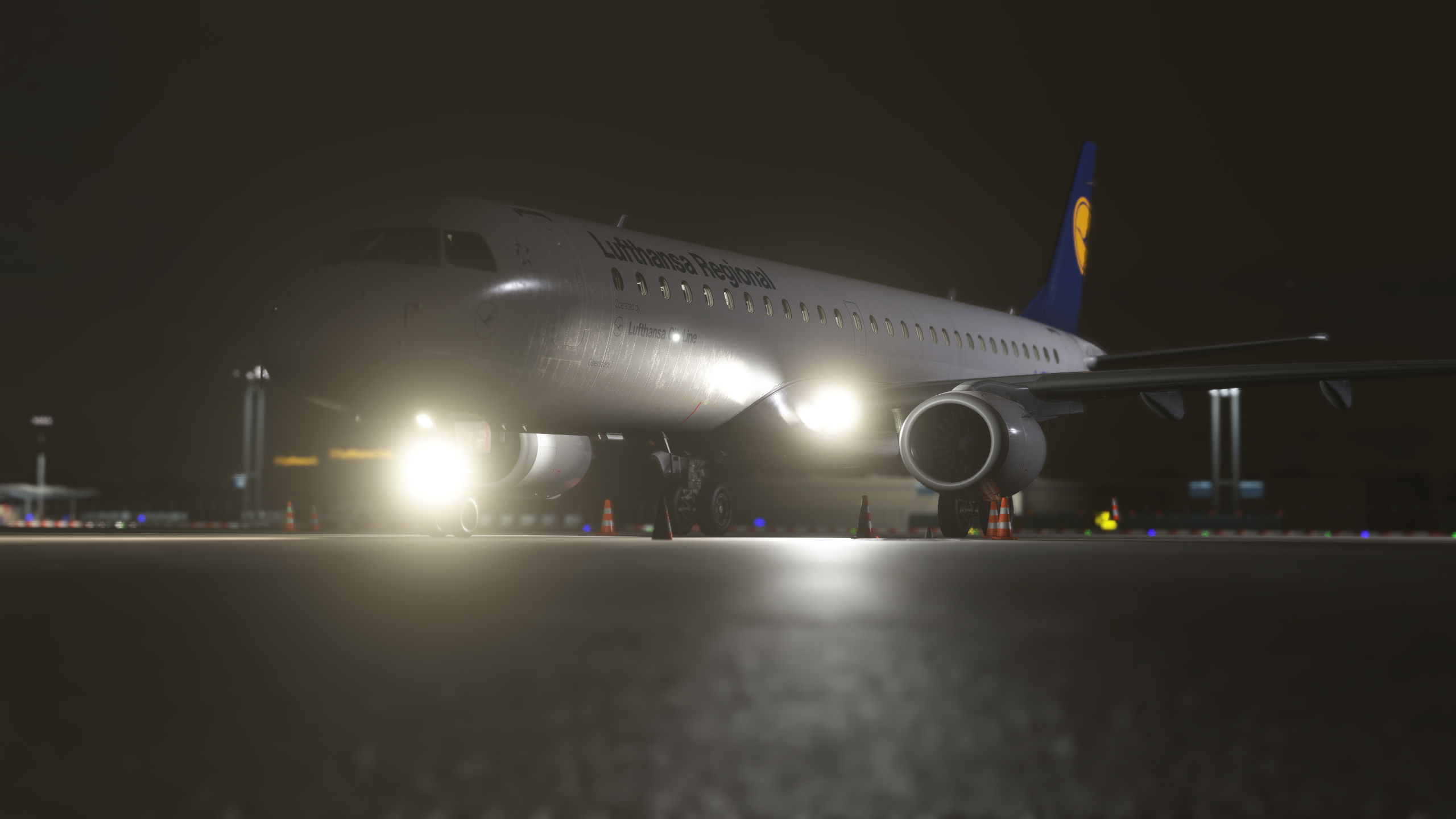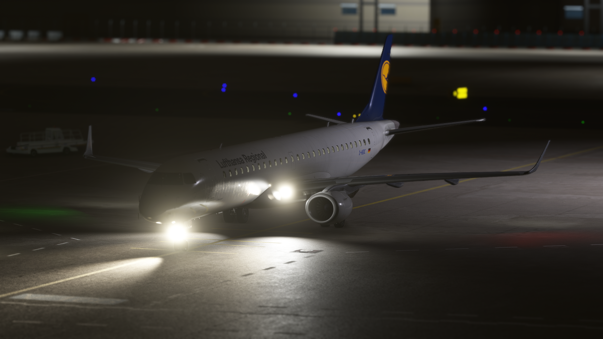 Um auch einen typischen Nachtflug ohne Probleme durchführen zu können, benötigen wir vernünftige Beleuchtung. Die Beleuchtung der E-Jets ist sehr gelungen und leuchtet den benötigten Bereich aus. Außerdem sind alle Lichter funktional und können über die vorgesehenen Schalter im Cockpit angeschaltet werden.