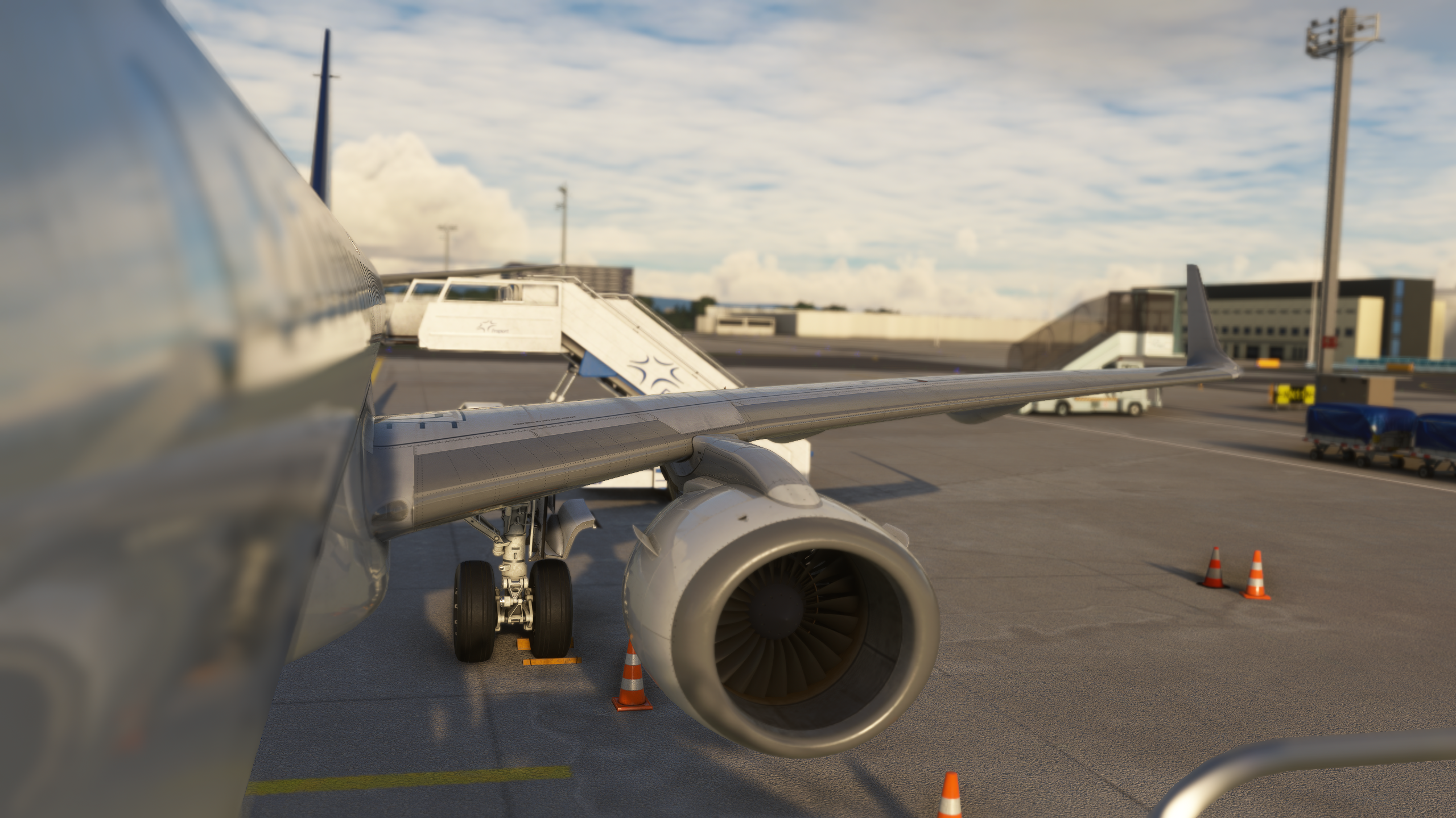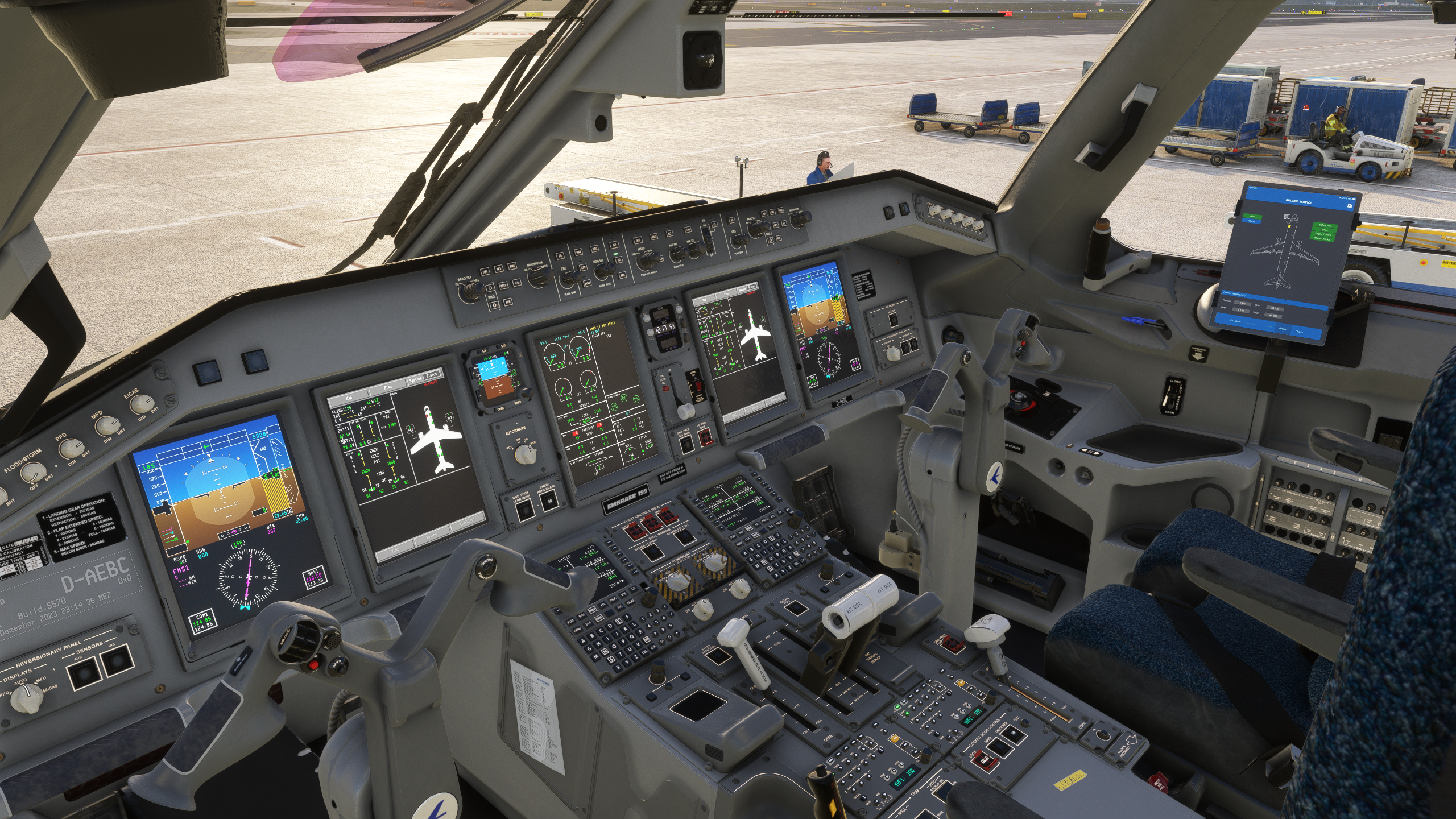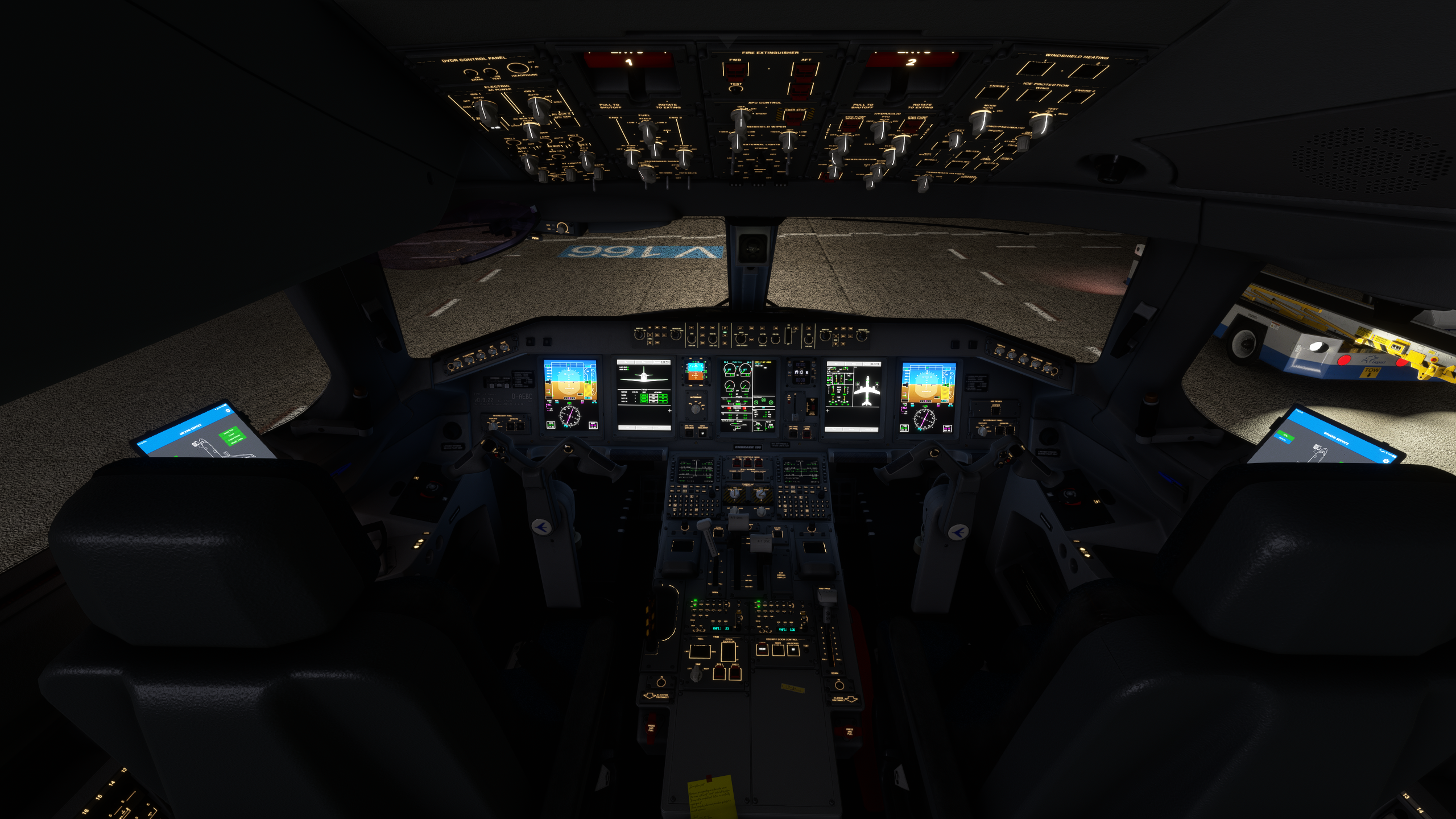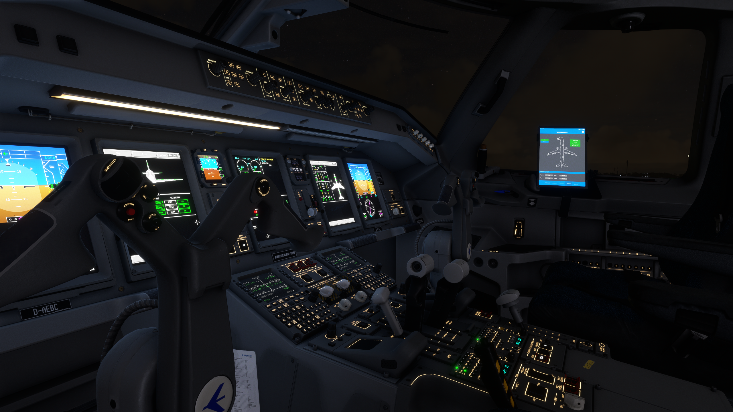 Innen ist eine stimmige Beleuchtung ebenso wichtig wie außen. Das Cockpit sowie die Kabine haben eine Ausleuchtung bekommen. Im Cockpit sieht alles sehr stimmig aus und erzeugt ein gutes Bild. Die Displays des Fliegers sind von der Helligkeit her einstellbar und weisen keine Mängel auf. Das Licht in der Kabine hat etwas weniger Möglichkeiten. So kann das Licht in der Kabine nur an oder ausgeschaltet werden. Für weitere Updates würde ich mir wünschen eine individuelle Beleuchtung über das EFB oder über Panel in der Kabine einstellen zu können, da nur diese 2 Optionen in bestimmten Lichtverhältnissen nicht passen.