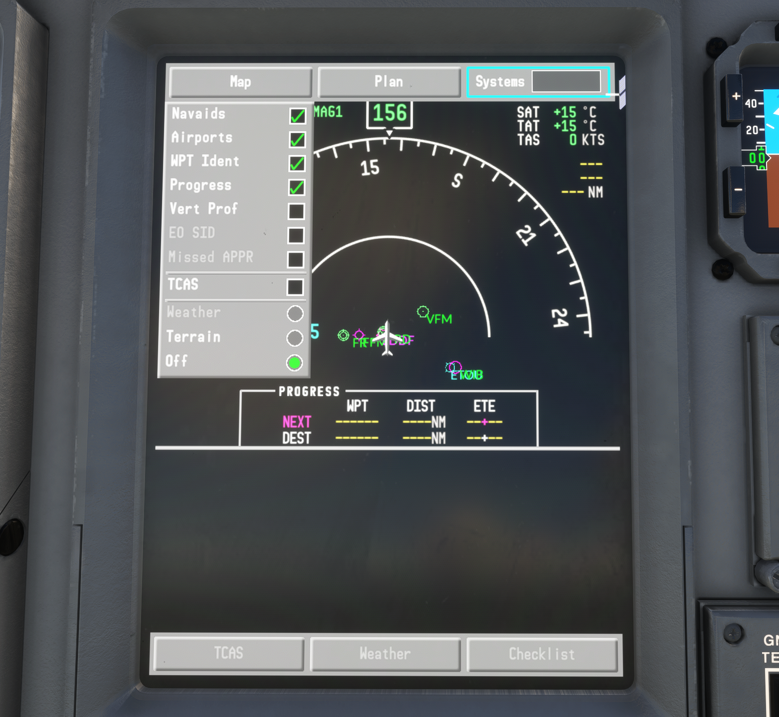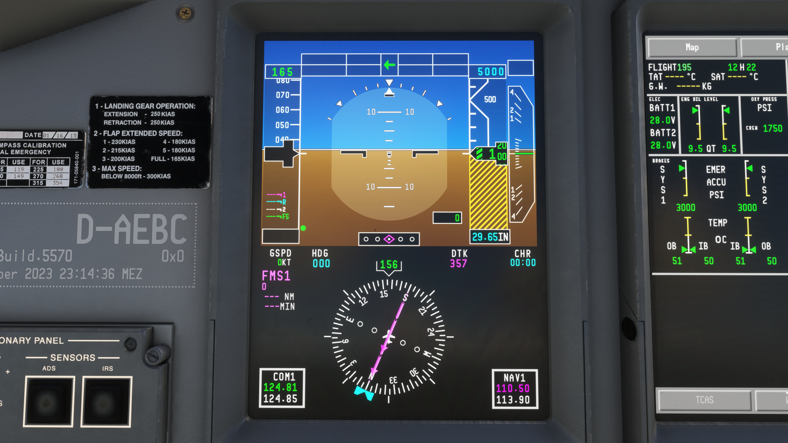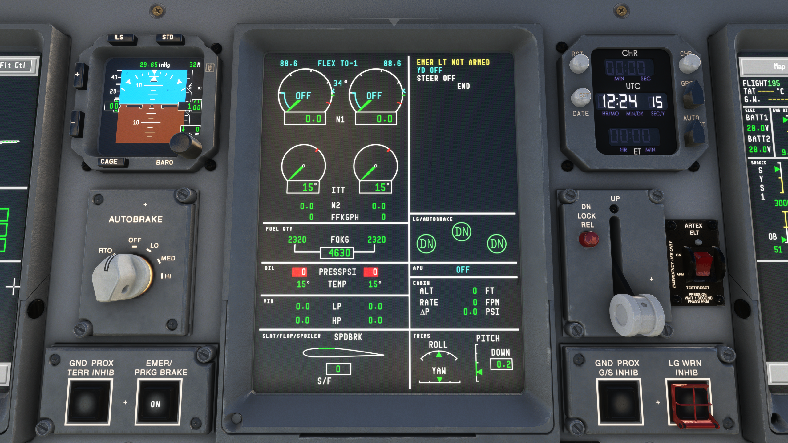 Das Engine Indication and Crew Alerting System kurz ECAS zeigt Informationen über die Triebwerke oder das Fahrwerk an. Außerdem zeigt es den Status der Landeklappen und der Spoiler sowie den zu Verfügung stehenden Sprit und den Trim an. Das Display ist wie die anderen Displays richtig aufgebaut und du weißt im laufenden Betrieb keine Mängel auf.