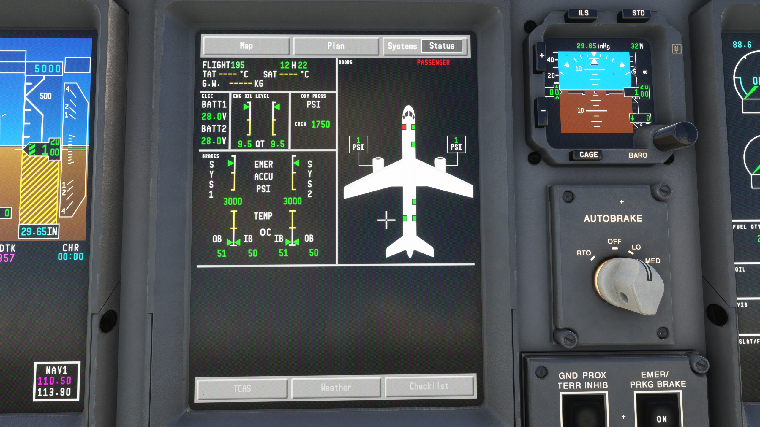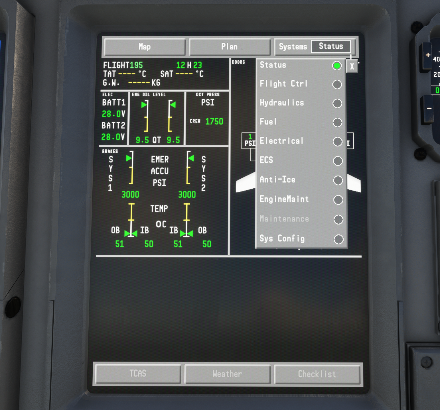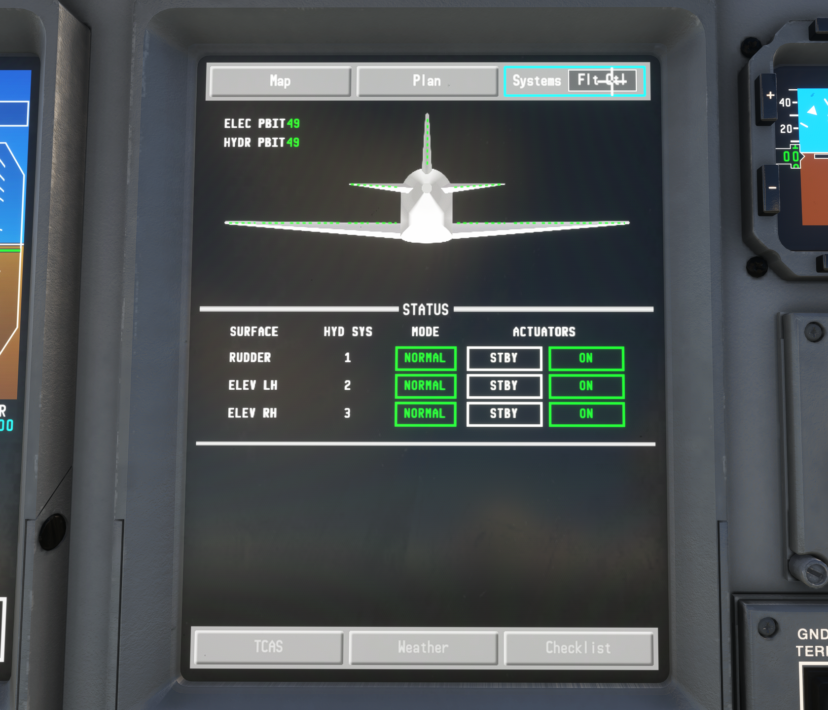 Das MFD besitzt mehr Funktion als das PFD. So können über das MFD alle wichtigen Daten sowie Systeme ausgelesen werden. Das setzte FSS auch um. Wenn man den Flieger hochfährt, landet man auf der „Status“ Seite. Auf der Seite können wir alle wichtigen Informationen auf einen Blick sehen. Das Display zeigt in dem Status die Zeit sowie das Gewicht an, zudem gibt es den Status der Türen wieder und zeigt andere wichtige Informationen wie die Ladung der verbauten Batterien. Ebenso besitzt der Flieger Seiten wie „Flight Ctrl“ worüber die Steuerflächen sowie die Spoiler eingesehen werden können. Zusammenfassend besitzt das Display wie das PFD alle wichtigen Funktionen und erfüllt den Sinn und Zweck.