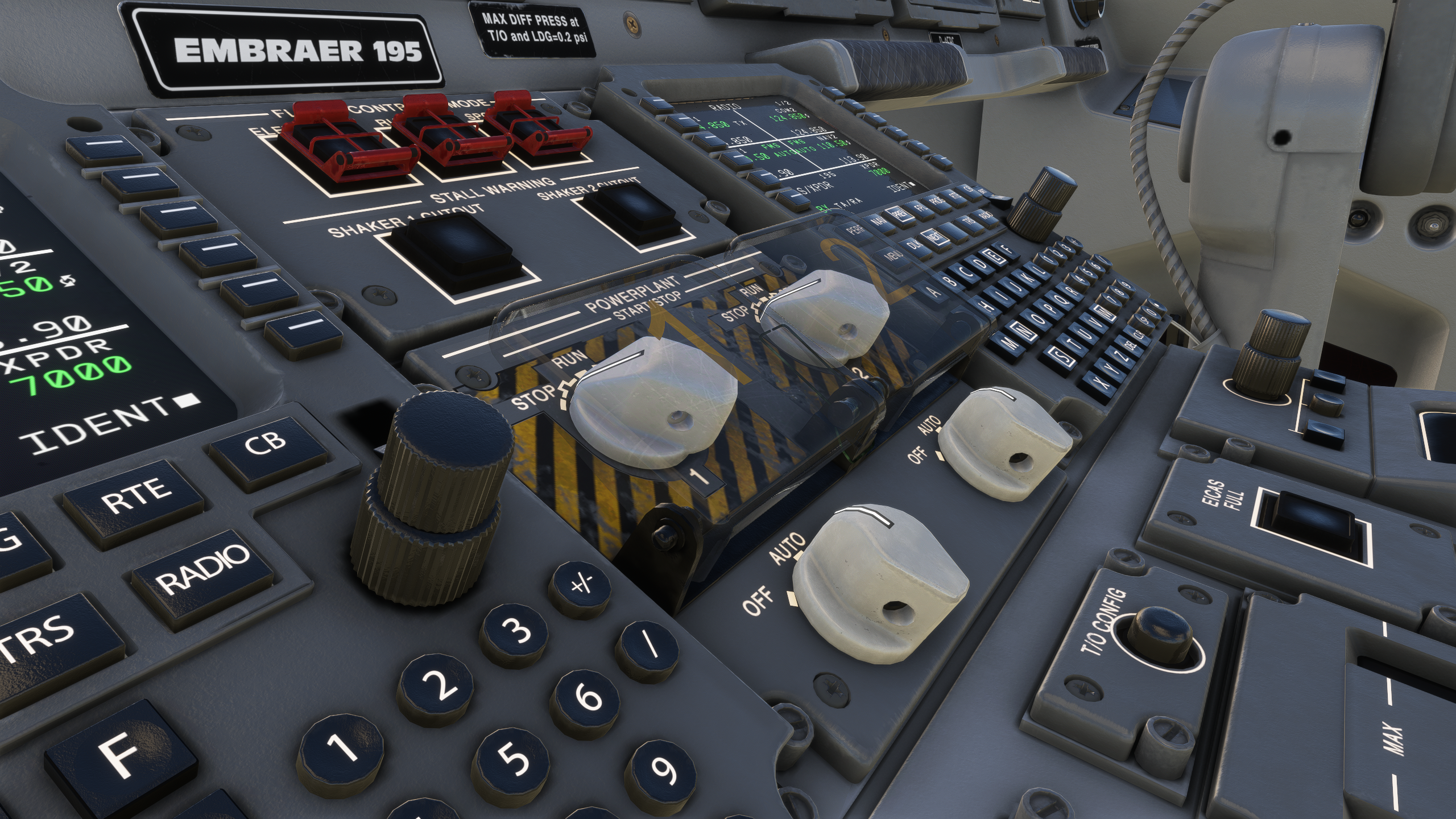 In einem so hochmodernem Flieger darf ein gutes Cockpit nicht fehlen, das liefert FSS mit ihren E-Jets. Das Cockpit sieht alles in allem gut aus. Alle Proportionen scheinen getroffen und die Texturen sehen gut aus. Jede Ecke und Kante im Cockpit wurde erfasst, gebaut und passend texturiert. Für meinen Geschmack könnte das Cockpit an der ein oder anderen Stelle bessere Texturen und ein bisschen mehr Abnutzung bekommen, da der Flieger an einigen Stellen im Cockpit ein bisschen zu sauber aussieht. Das Overhead besitzt alle wichtigen Module und ein funktionierendes HuD (Head-up-Display) wurde dem Flieger gesponsort. Zusammenfassend zu sagen ist, dass das Cockpit der E-Jets sehr gut getroffen ist, und wenig Mängel aufweist. Bei den Texturen kann es noch für meinen Geschmack ein bisschen mehr Schmutz hinzugefügt werden, um einen etwas abgenutzten Flieger darzustellen.