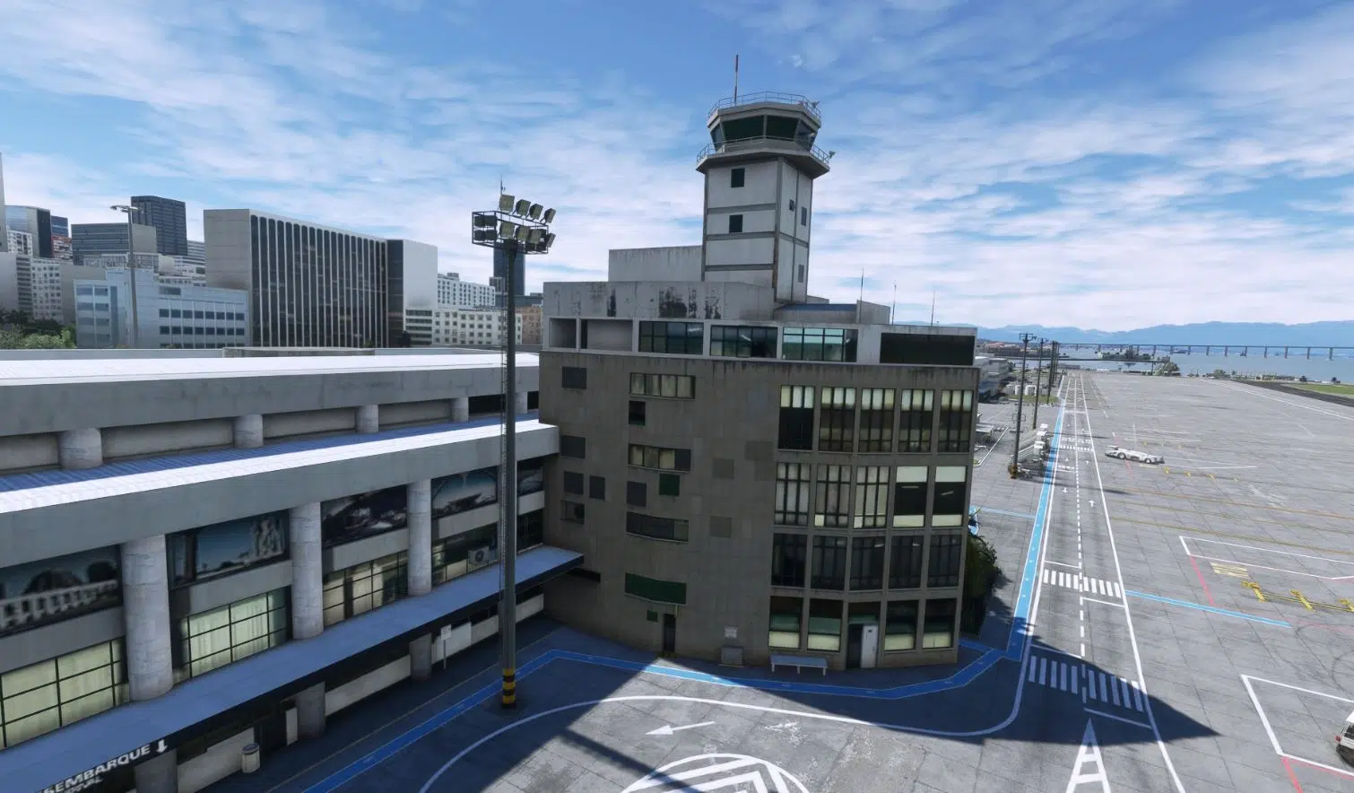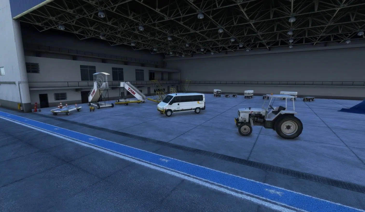 Das Hauptterminal wird von einer großen Halle auf der einen Seite und einer Reihe kleinerer Gebäude auf der anderen Seite flankiert. In diesem Cluster befinden sich der Kontrollturm, die Feuerwache, mehrere Hallen und ein kleiner Militärbereich. Sie sind größtenteils unspektakulär, wurden aber mit hochwertigen, detaillierten Texturen nachgebildet, die Unterschiede in den Baumaterialien und eine angemessene Verwitterung zeigen, und durch zusätzliche 3D-Merkmale mit realistischem Aussehen versehen. Sie alle enthalten detaillierte Dachstrukturen und mehrere Hallen weisen offene Tore mit detaillierten Inneneinrichtungen auf und wurden auch mit statischen Flugzeugen und anderen für die jeweiligen Hallen typischen Objekten bestückt.