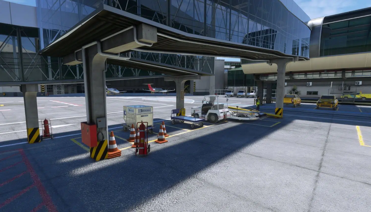 Über den Flughafen verstreut befanden sich alle erforderlichen Objekte für den normalen Flughafenbetrieb. Diese waren, wie ich es von einer hochwertigen Szenerie erwarte, von guter Qualität und detailliert. Ich konnte keine Bereiche finden, die fehlten. Zusätzlich zu den üblichen Objekten gibt es einige weitere, die nur bei genauerer Betrachtung sichtbar werden, wie beispielsweise pollermontierte Mülleimer und Sicherheitskameras – vielleicht trivial, aber sie fügen die kleinen Details hinzu, die die hohe Qualität der Szenerie unterstreichen.