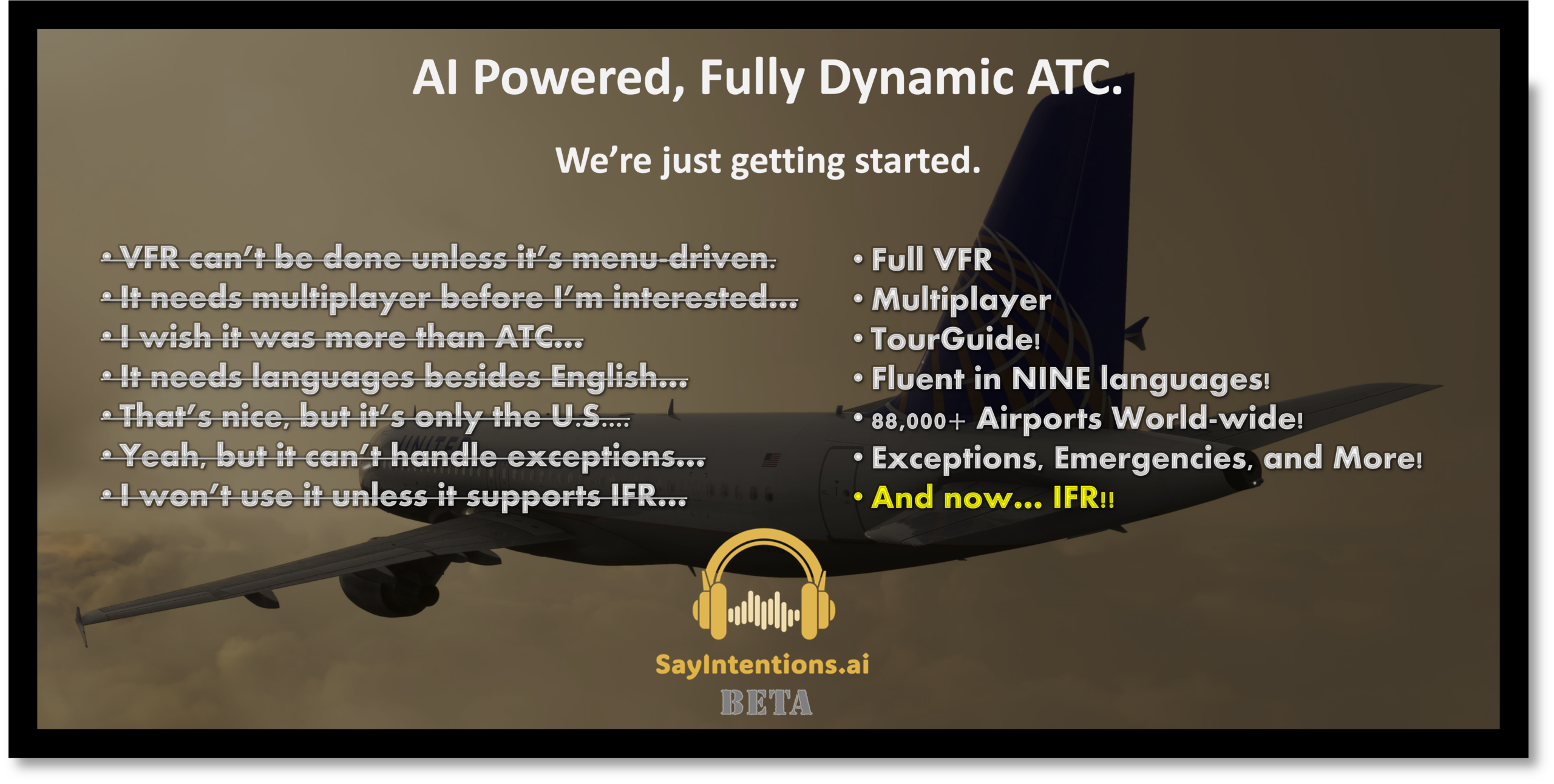 Gibt ein paar inhaltliche Ungenauigkeiten: Eines der Hauptmerkmale ist VFR, nicht IFR. Das IFR ist gerade erst als eine Art Alpha dazu gekommen. SayIntentions hat einen ganz anderen Ansatz als BeyoundATC. Letzteres verwendet KI Stimmen, ist aber ansonsten ein „Offline“ Programm, also die Logik für die Anweisungen steckt im Programm selbst. SayIntentions verwendet KI für die eigentlichen Anweisungen und Interaktionen. Das wird dadurch deutlich, dass man dem Controller z.B. auch abwägige Dinge sagen kann und er reagiert darauf. („Grüß mal den Kollegen“ oder „hattest du nicht gesagt, ich bekomme 22L“, „ich flieg Richtung Küste“ usw.). Deswegen kommt einem SayIntentions auch so real vor.