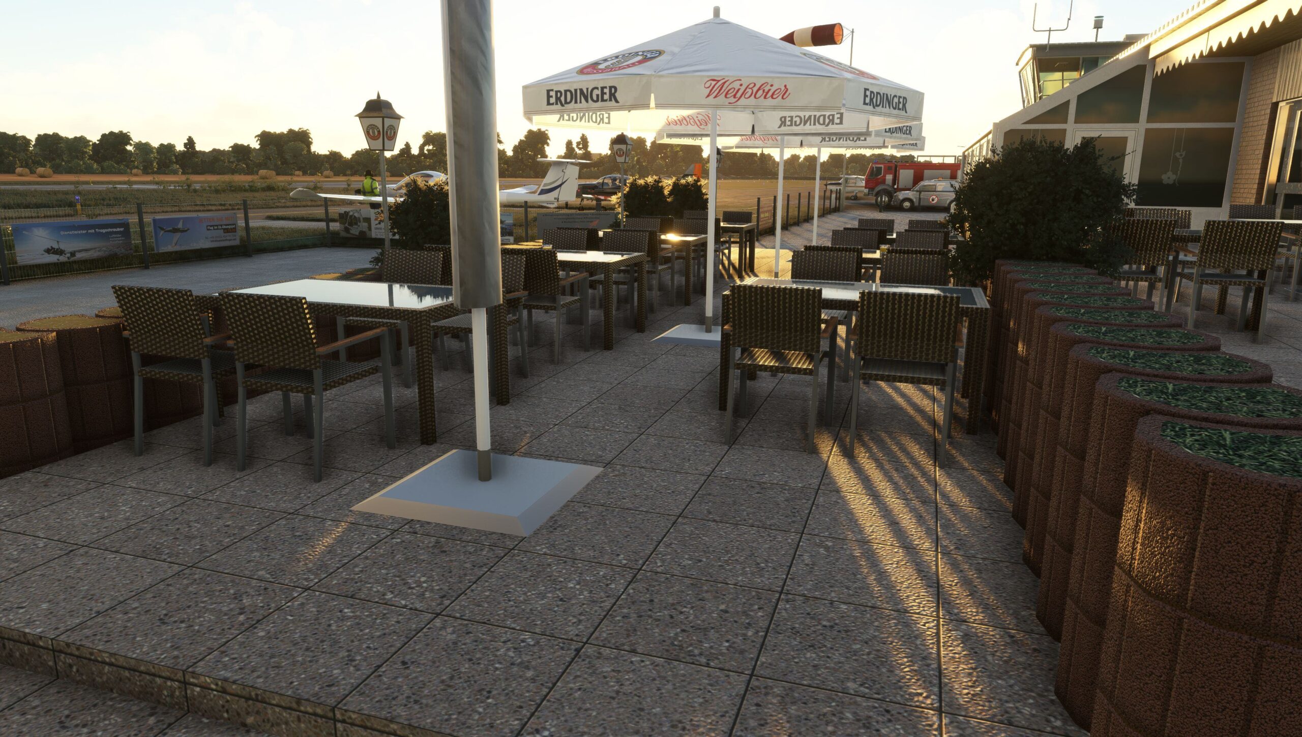 Die Szenerie-Version wartet mit vielen liebevollen Details auf, wie etwa dem angrenzenden Kinderspielplatz, den Flugzeughallen und dem Restaurant „Airfield“, dessen Außenterrasse originalgetreu abgebildet ist. Wobei, fast: denn die Umsetzung entspricht dem Stand von Mitte 2023; vor kurzem wurde der Außenbereich neu gestaltet. (Mehr Infos dazu gibt es weiter unten im Interview). Auch steuerbare Objekte gibt es! So lässt sich etwa das Tor des großen Hangars einer Eventlocation öffnen und schließen.