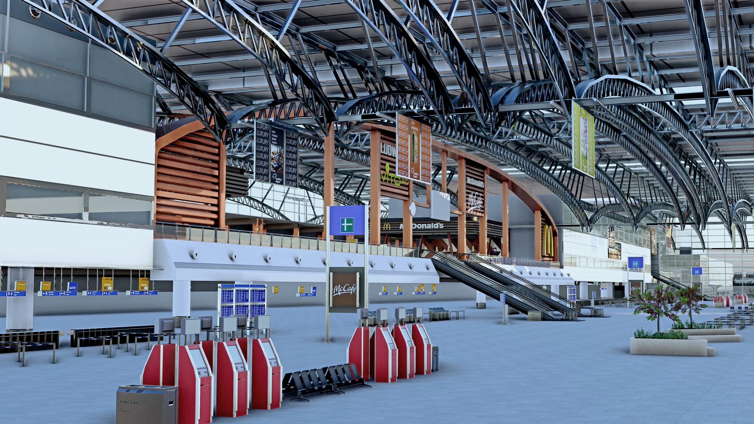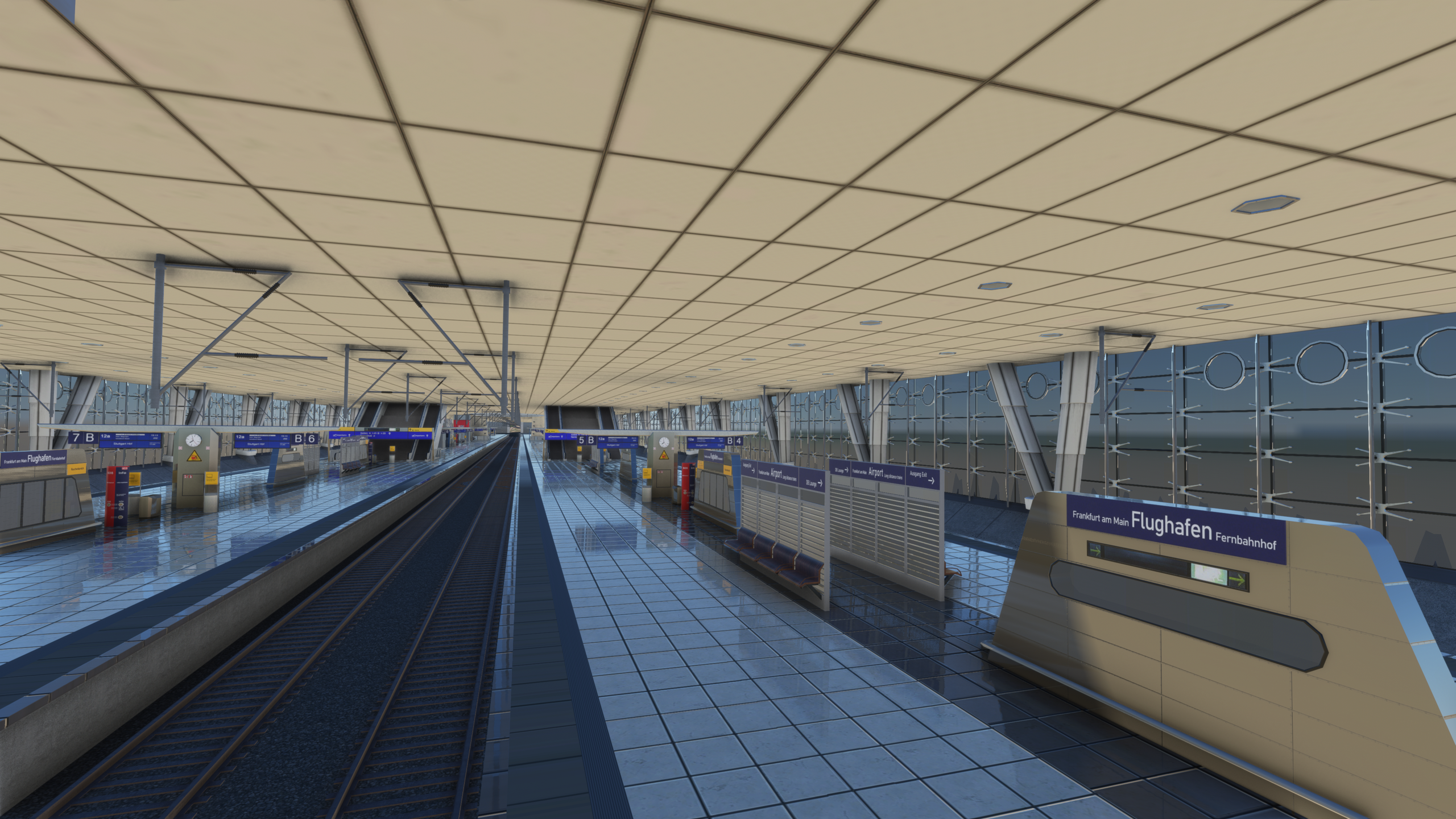 Dieser Vergleich zeigt, dass Aviotek zwar eine sehr schöne und detaillierte Szenerie geliefert hat (besonders für ein Freeware-Projekt!), doch Aerosoft noch eine Schippe drauflegt. Beide Versionen bieten einen Terminal-Innenraum. Auch hier scheint Aerosoft die Nase vorn zu haben, jedoch ist es (zumindest bei meiner Previewversion) nicht möglich das Gebäudeinterieur mit der Drohnenkamera zu betreten. Ausgenommen davon ist sind anscheinend Teile von Terminal 2 und der Fernbahnhof, wo das folgende Bild entstanden ist.