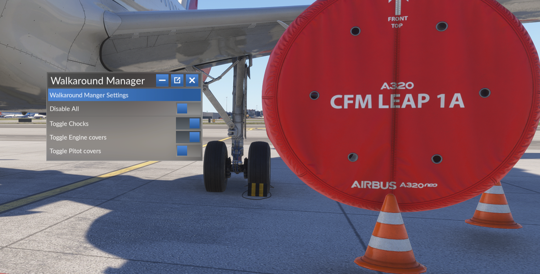 - Automatische Deaktivierung von Chocks und Abdeckungen: Der Manager erlaubt es Nutzern, Chocks (Flugzeugbremsklötze) und Abdeckungen automatisch zu deaktivieren, was die Vorbereitung eines Fluges realistischer und effizienter macht.
