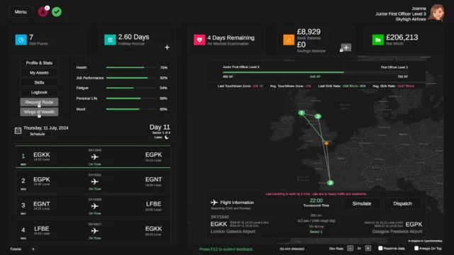 Das Besondere an Fly The Line ist der ganzheitliche Ansatz: Neben dem eigentlichen Fliegen müssen Spieler auch ihr Privatleben managen, Skills entwickeln und mit unerwarteten Ereignissen wie Umleitungen umgehen. Mit bis zu acht verschiedenen Airlines und Flugzeugen sowie einem dynamischen Streckenplanungssystem bietet die Software große Flexibilität.